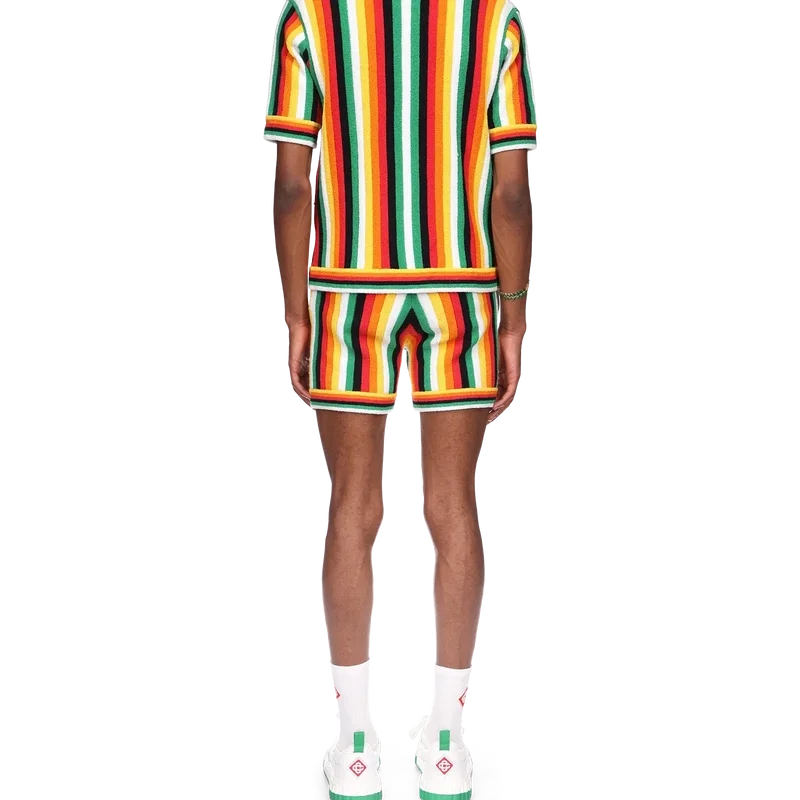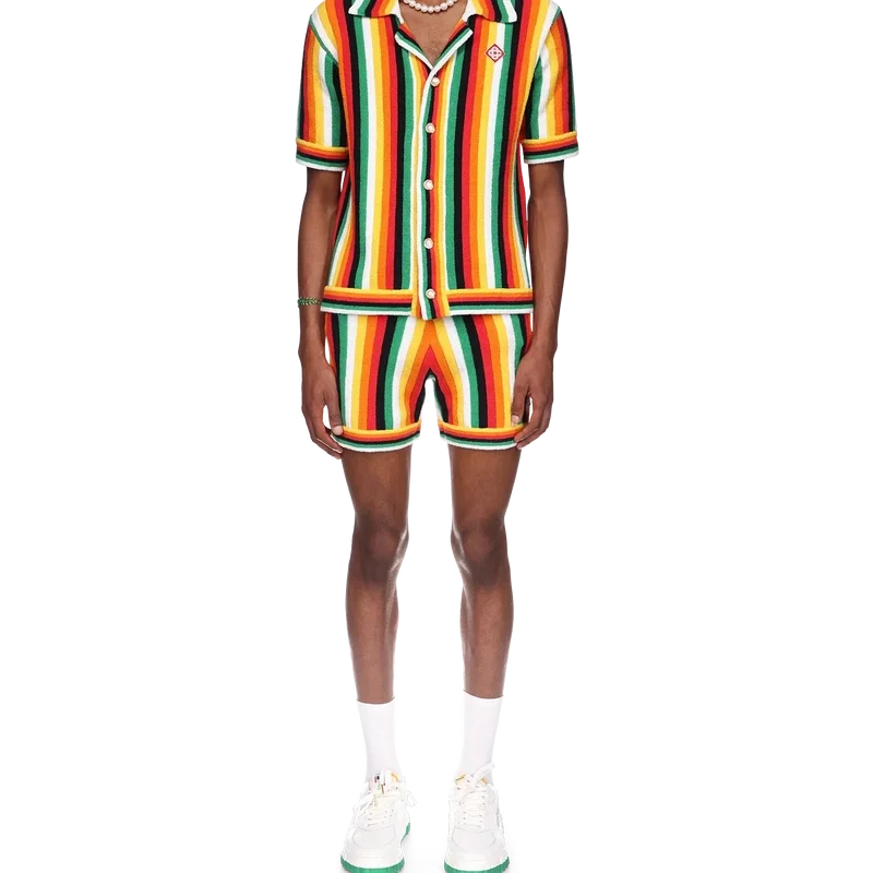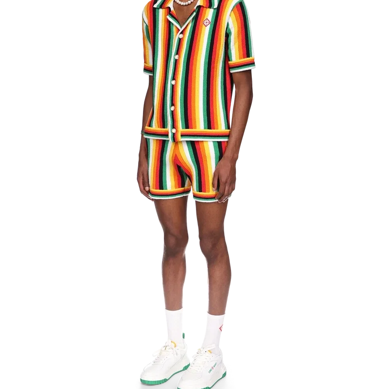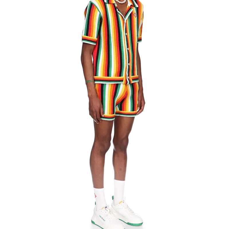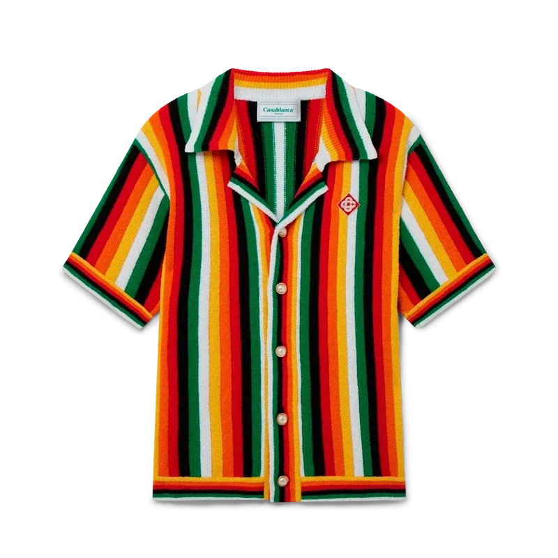 La camisa de rizo a rayas es un diseño de punto confeccionado con tejido de rizo de mezcla de algodón y presenta los colores de la temporada, representativos de los ricos intercambios entre disciplinas culturales en el arte, la música y el cine africanos. Se completa con un cuello acanalado, los botones de perla con borde dorado característicos de la casa y el parche con el logotipo de diamante característico.
