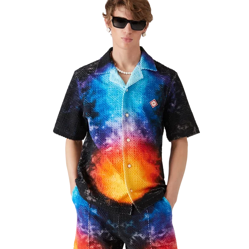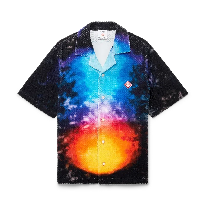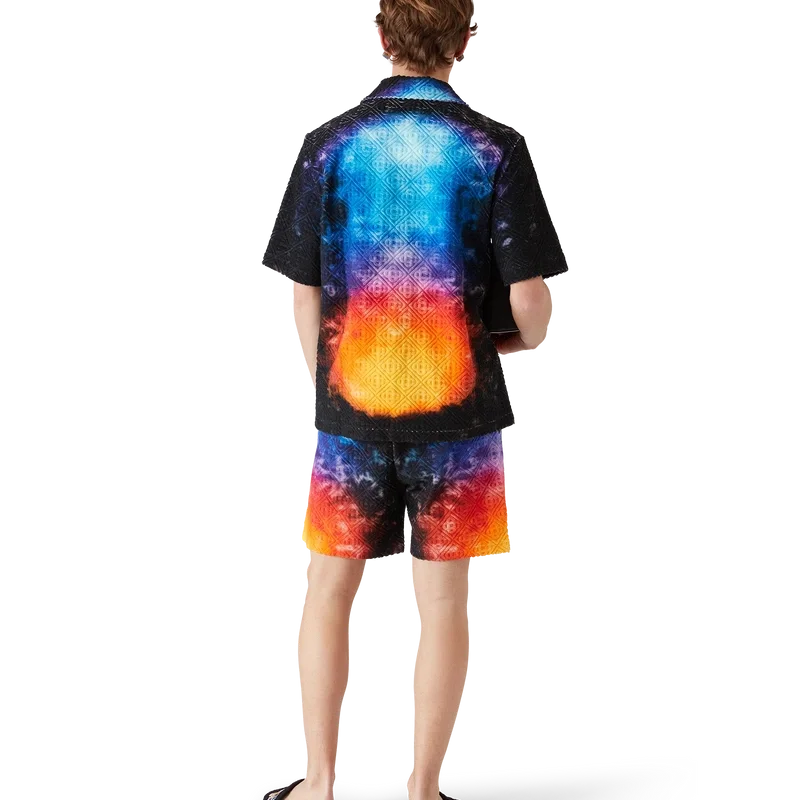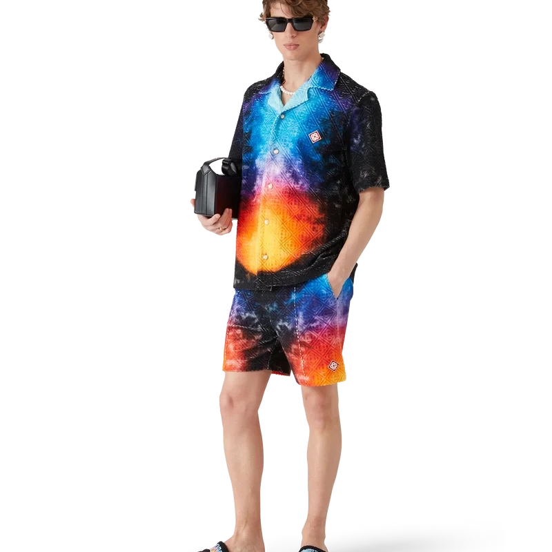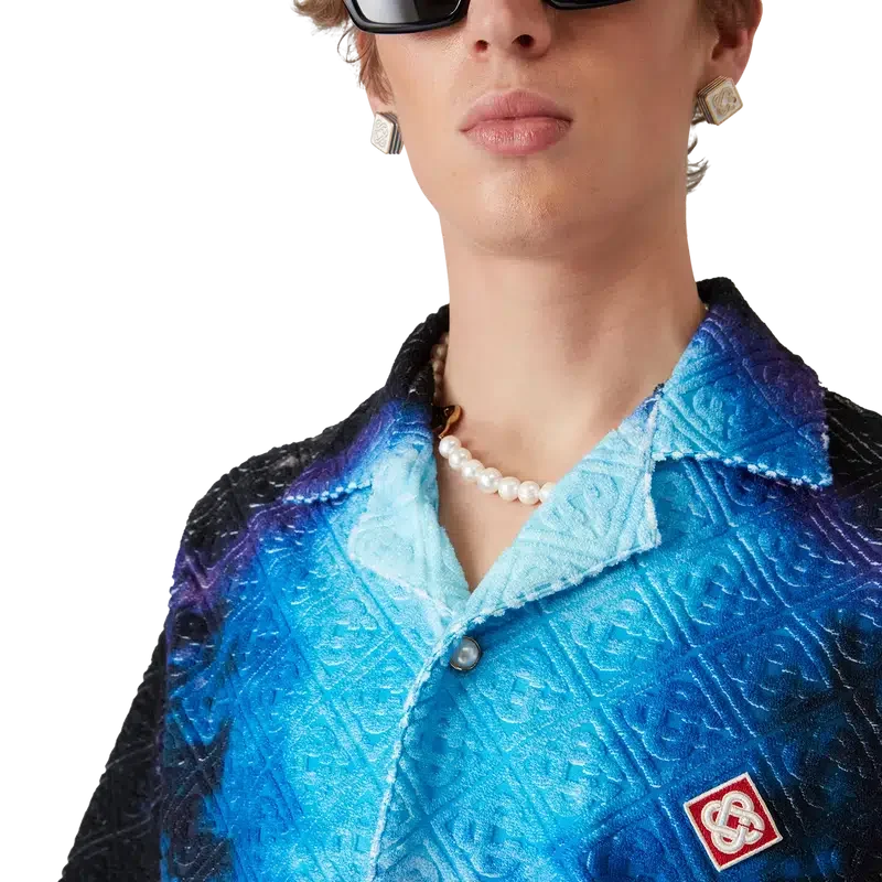 La camisa de rizo degradado es un diseño estampado de manga corta confeccionado con tejido de rizo jacquard degradado que presenta el degradado de la temporada. Se completa con cuello cubano, cierre de botones, botones de corozo con el logotipo «Cc» entrelazado y un bolsillo en el pecho. Diseñada para llevarse con los pantalones cortos de rizo degradado a juego.