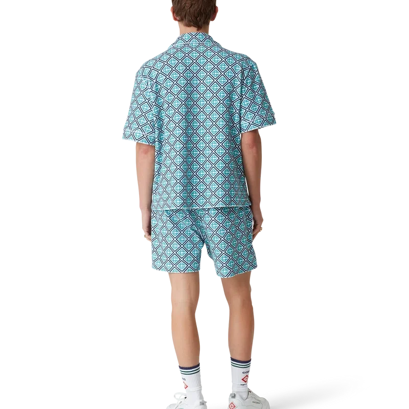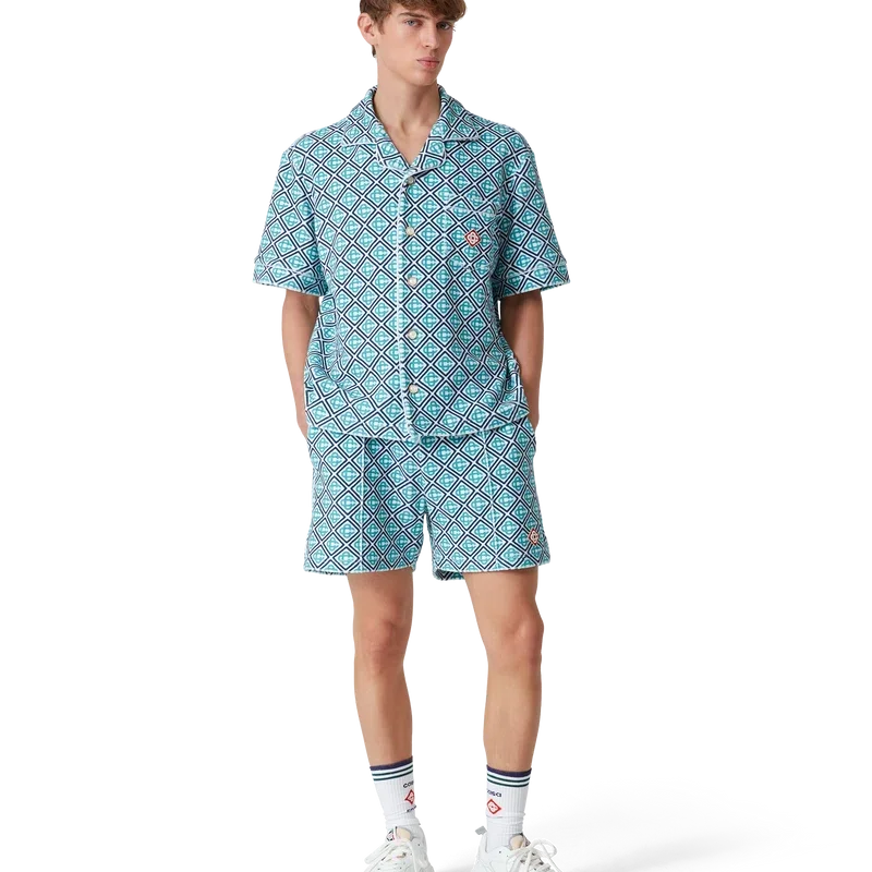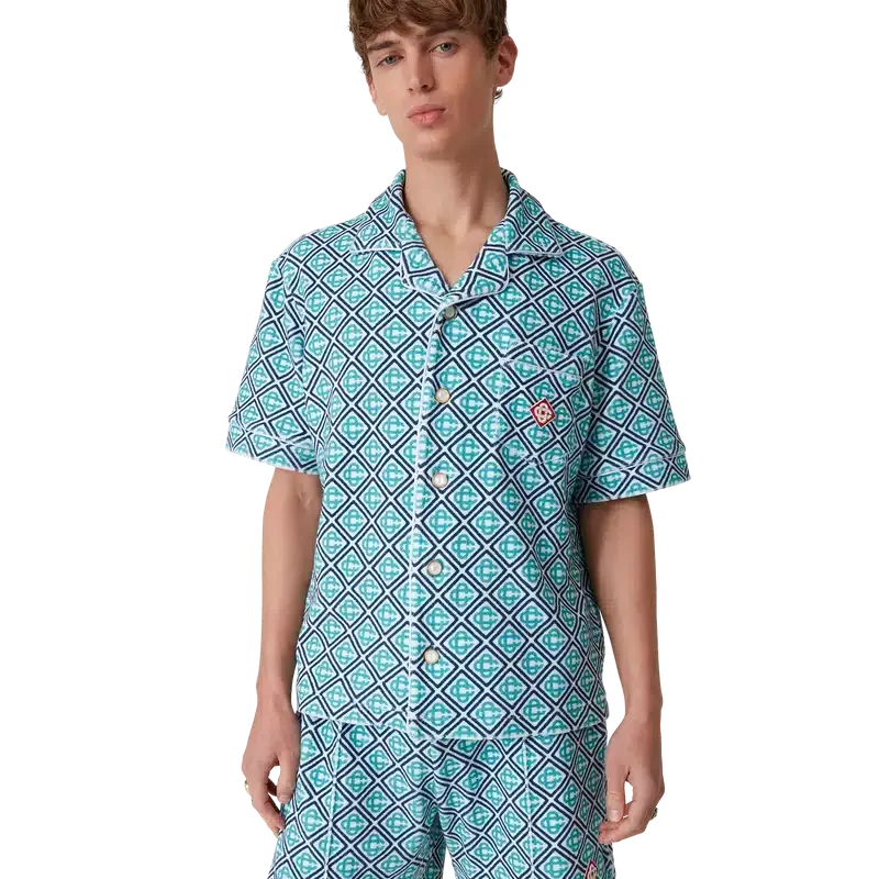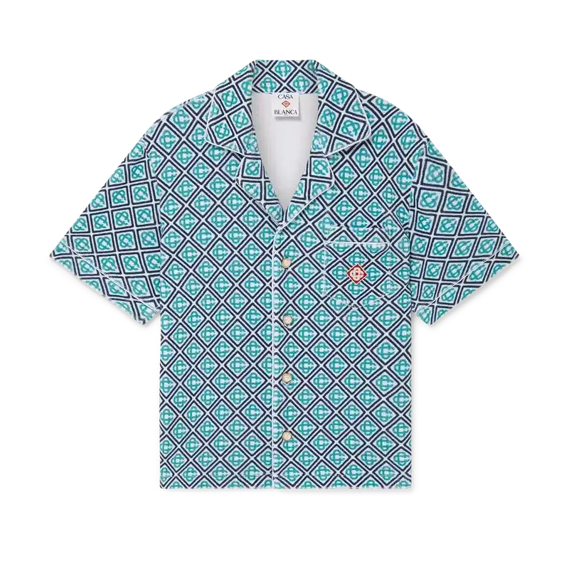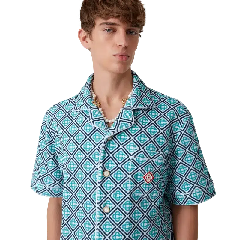 La camisa de rizo Monogram es un diseño de manga corta confeccionado en tejido de rizo Monogram con un estampado Monogram degradado que ofrece una versión renovada del estampado emblemático de Casablanca. Se completa con cierre de botones, botones emblemáticos de perla con borde dorado, un bolsillo en el pecho y ribetes en el cuello, la tapeta, los puños y el bolsillo.