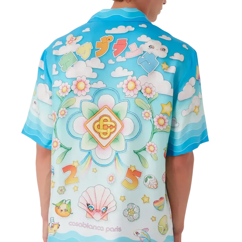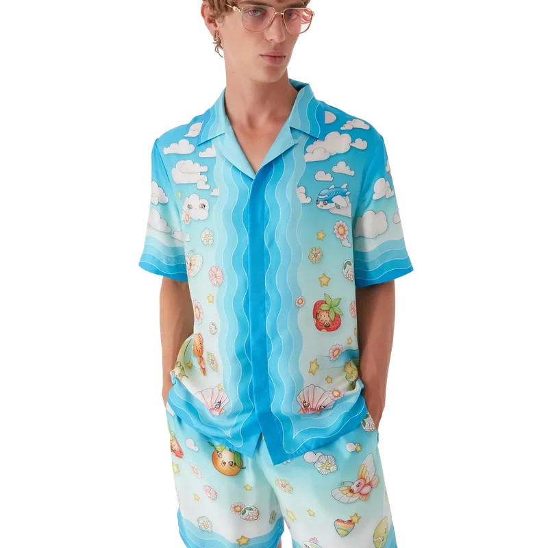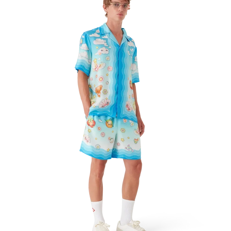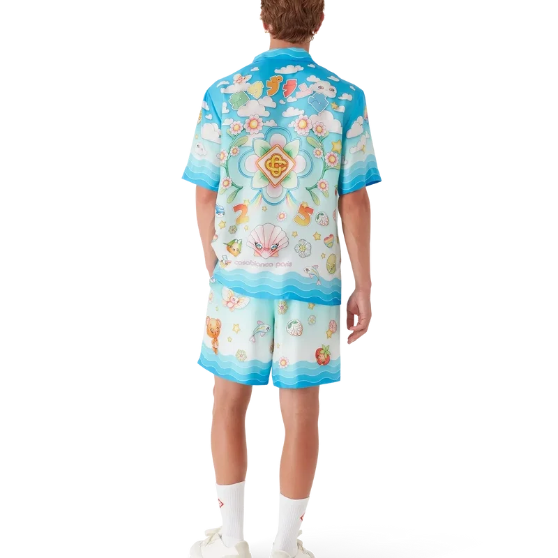 La camisa de sarga de seda de pantalones cortos con motivo kawaii presenta un diseño estampado en toda la prenda. Se trata de una versión kawaii de nuestro diseño Tennis Club, con elementos kawaii en el centro. La paleta de colores de esta camisa se compone principalmente de tonos pastel. Se completa con cuello cubano, cierre de botones, botones de corozo con el logotipo entrelazado «Cc» de la casa y detalles inspirados en la ola de Memphis en el cuello, los puños y el dobladillo.