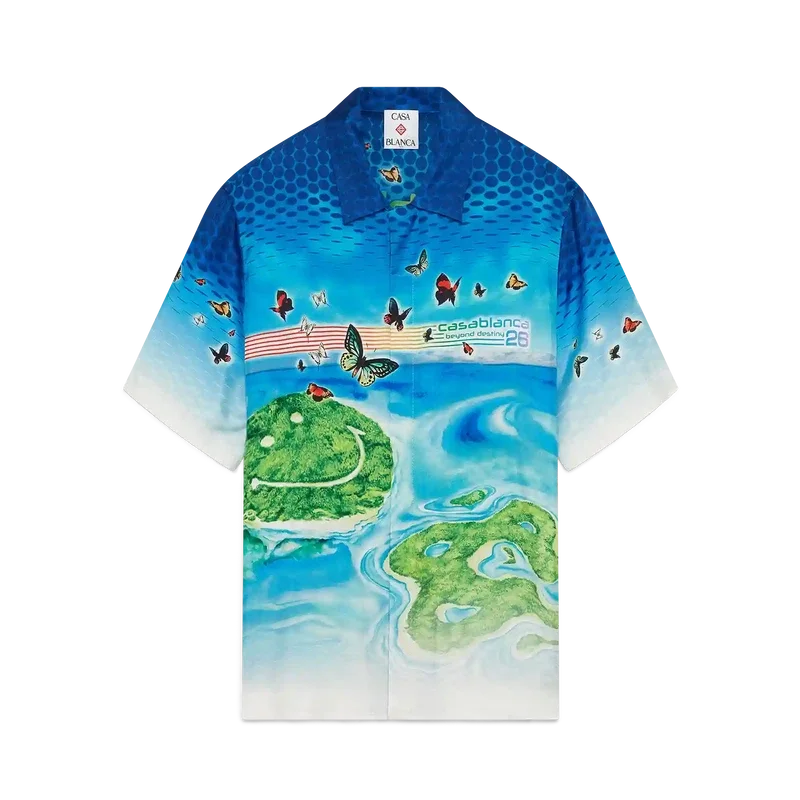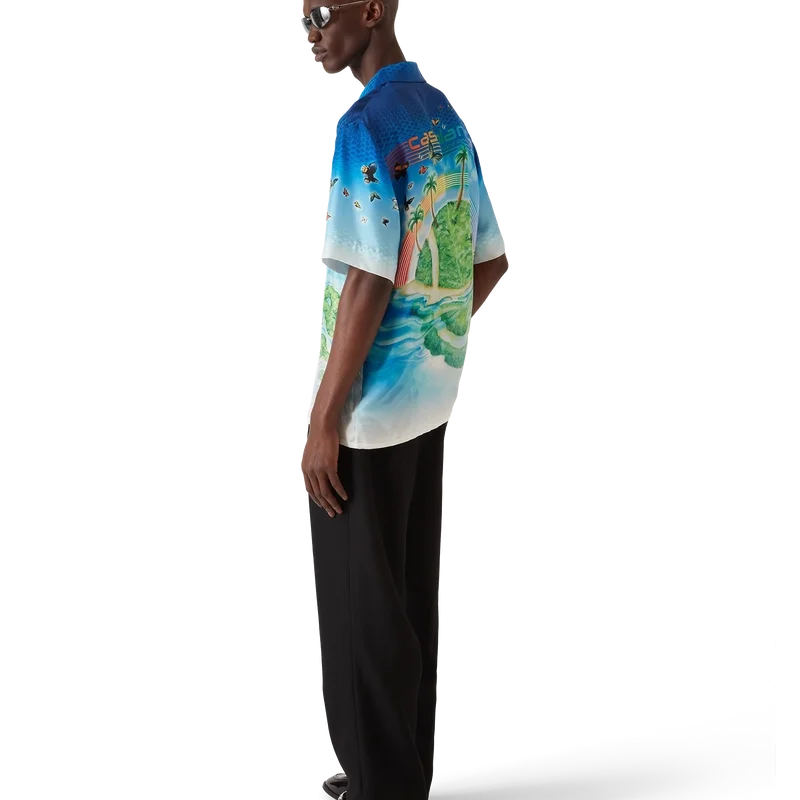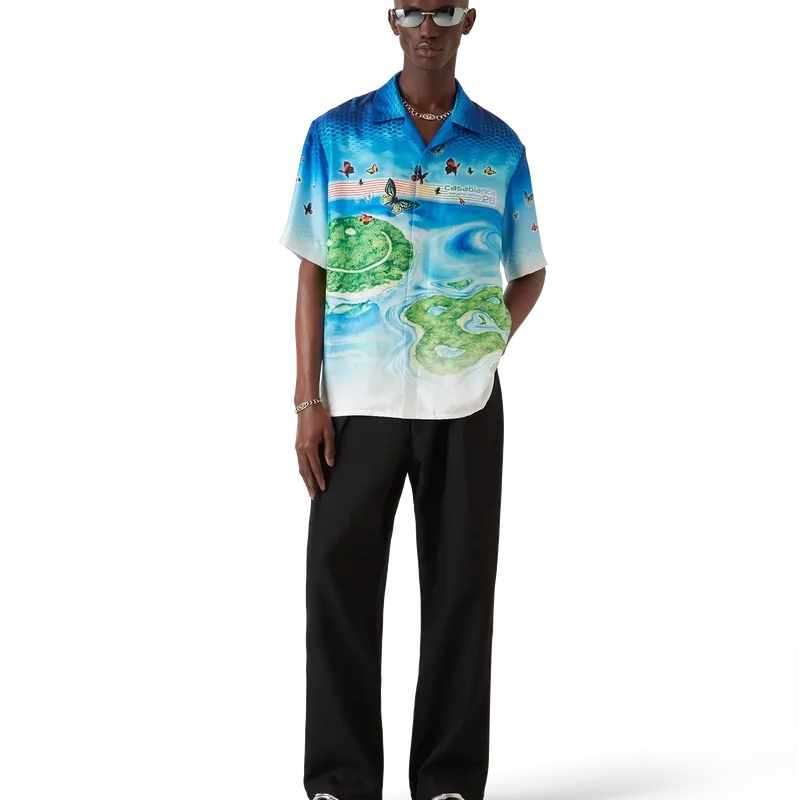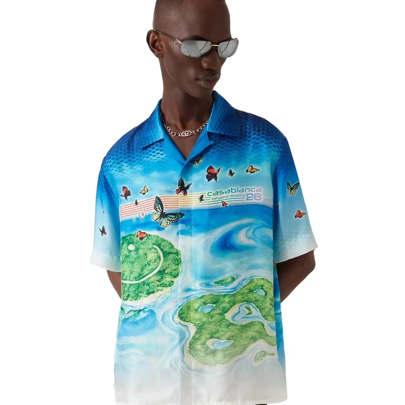 La camisa de manga corta Beyond Destiny reimagina la clásica camisa de seda de recuerdo de Casablanca a través de una lente de arte digital, con degradados de semitonos superpuestos con motivos inspirados en los videojuegos. Las mariposas pintadas a mano y los paisajes isleños de ensueño se fusionan con el logotipo CC de la casa, transformado en islas en sí mismas, símbolos de evasión, alegría e identidad. Se completa con cuello cubano y mangas cortas.