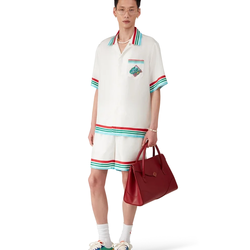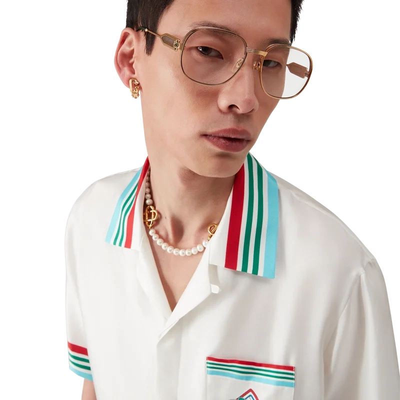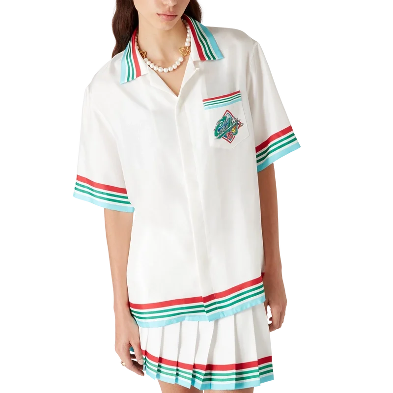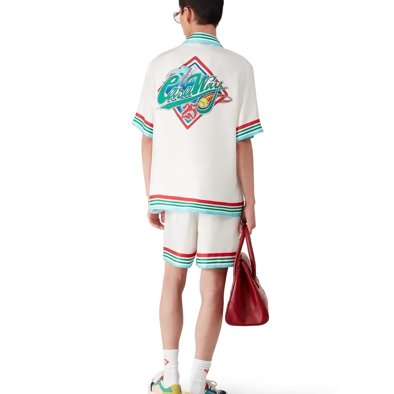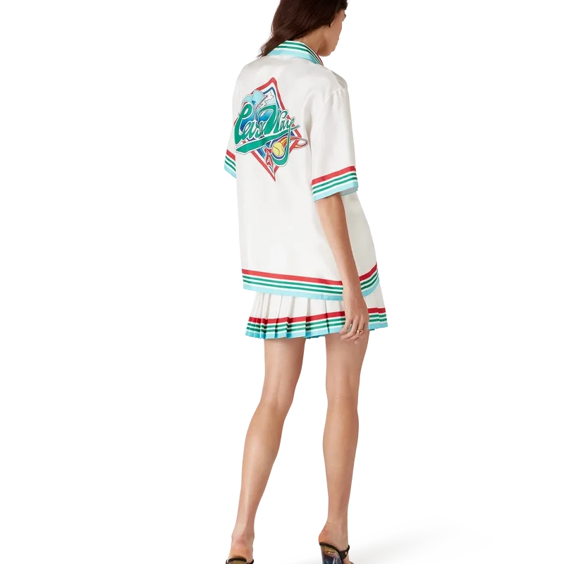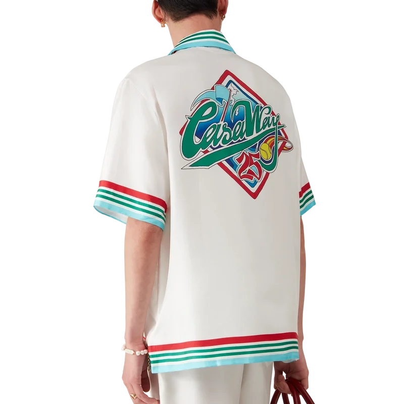 La camisa de seda Casa Way World Series es un diseño estampado de manga corta con el motivo de la temporada, que reinterpreta la clásica insignia del béisbol estadounidense para Casa Way Tennis, confeccionada en tejido de sarga de seda.