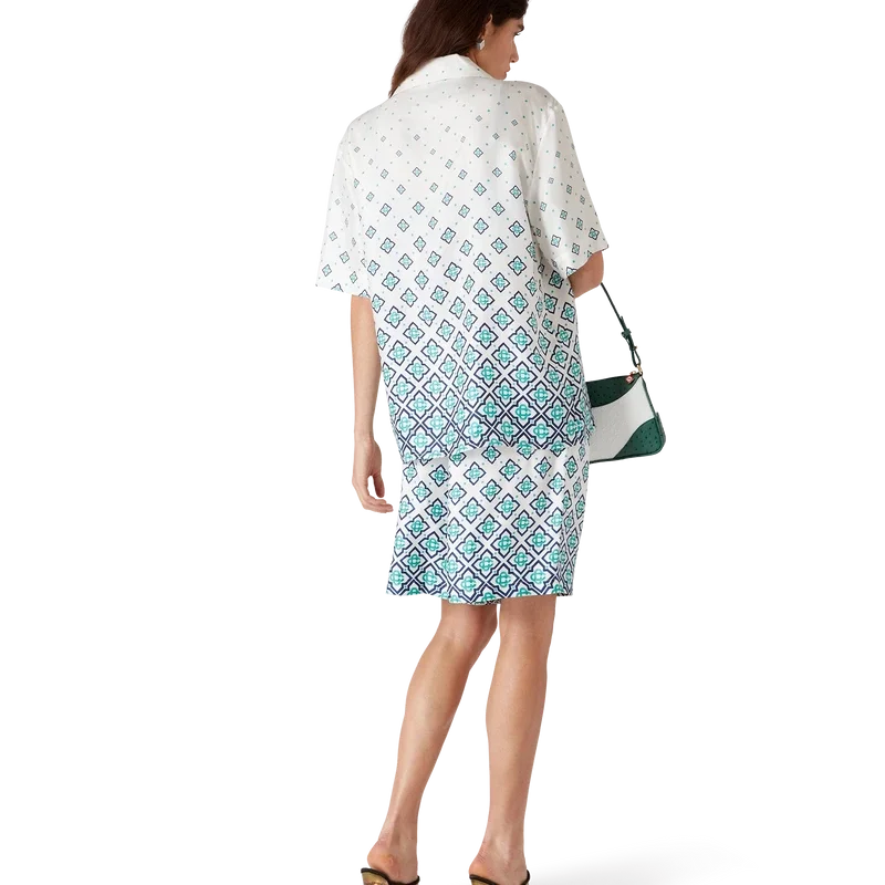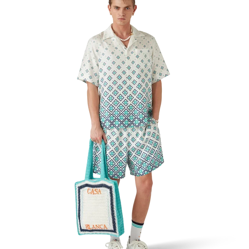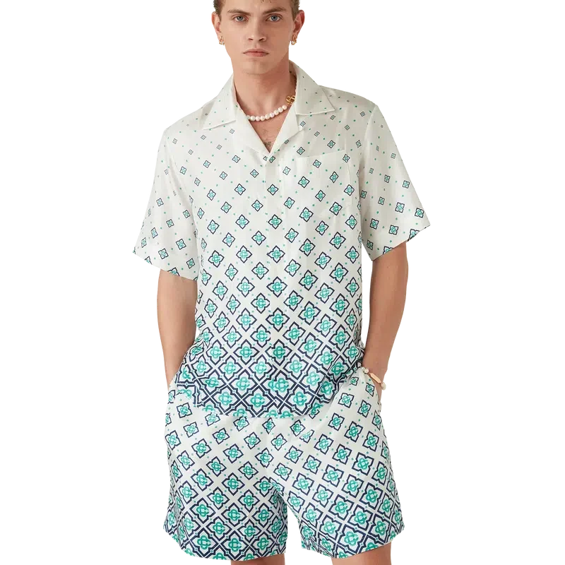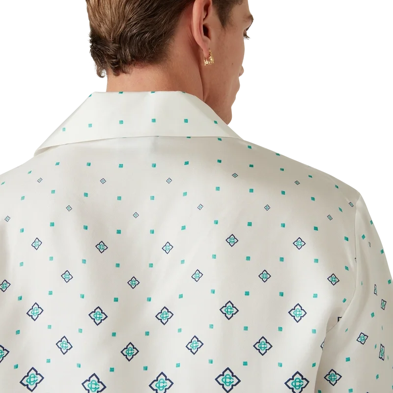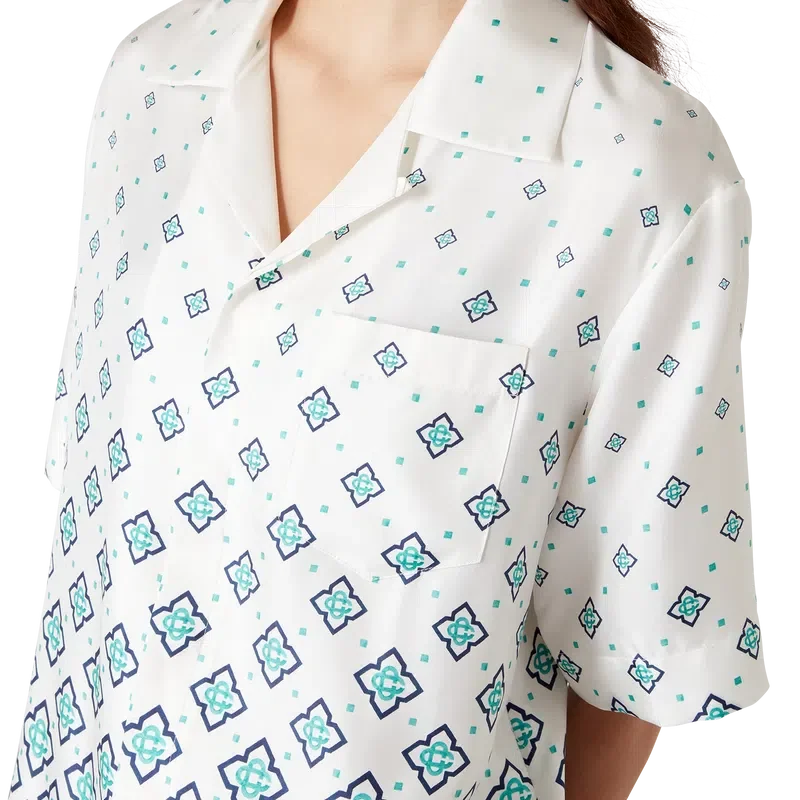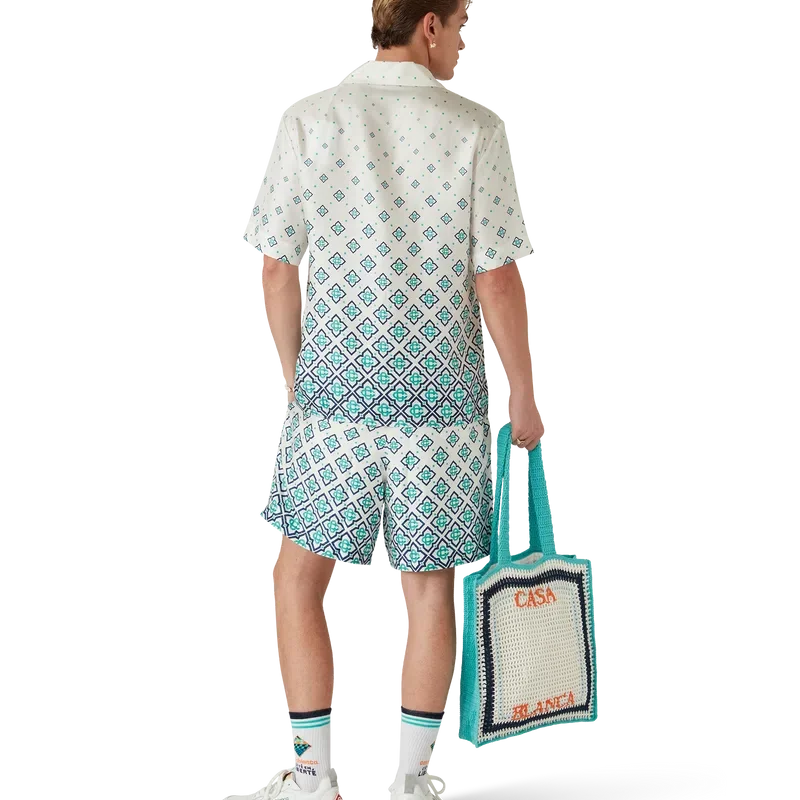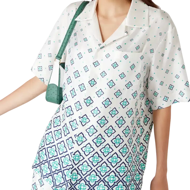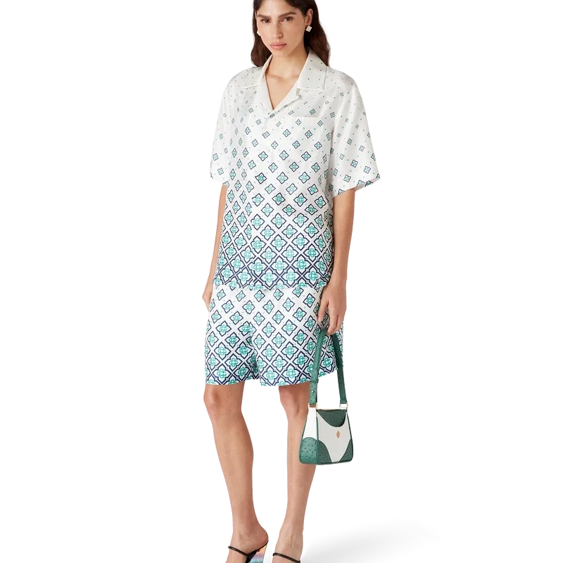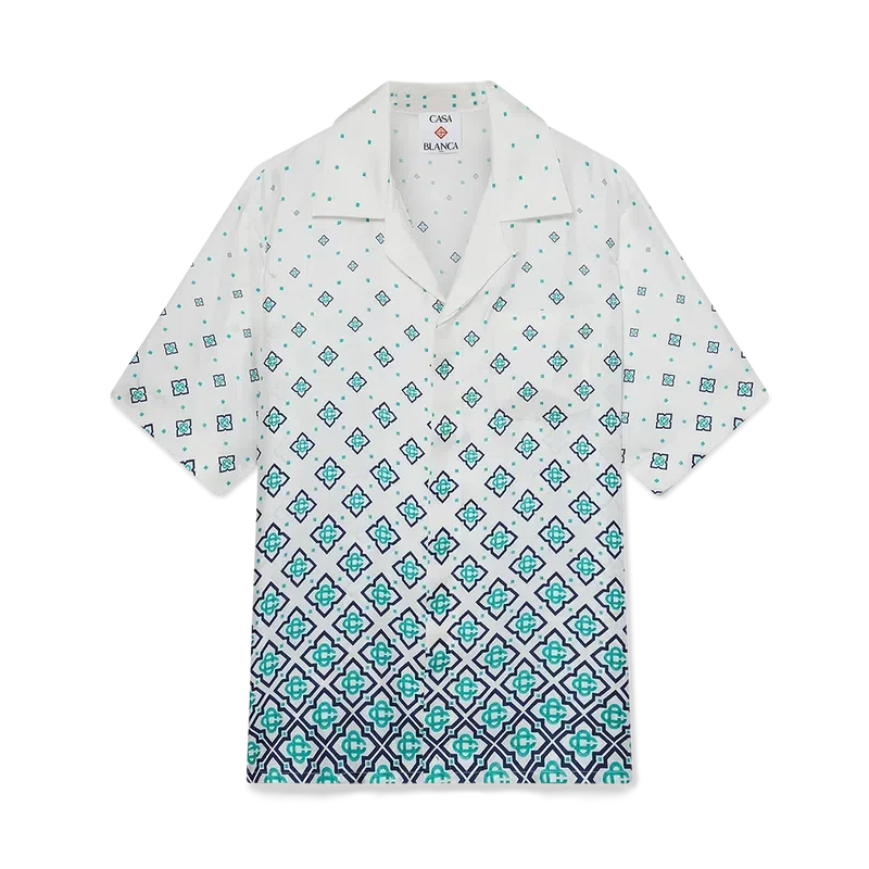 La camisa de seda con monograma degradado es un diseño estampado de manga corta confeccionado en sarga de seda. Se completa con cuello cubano, cierre de botones ocultos con botones de corozo con el logotipo Cc entrelazado y un bolsillo en el pecho.