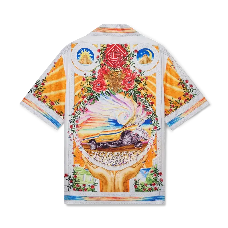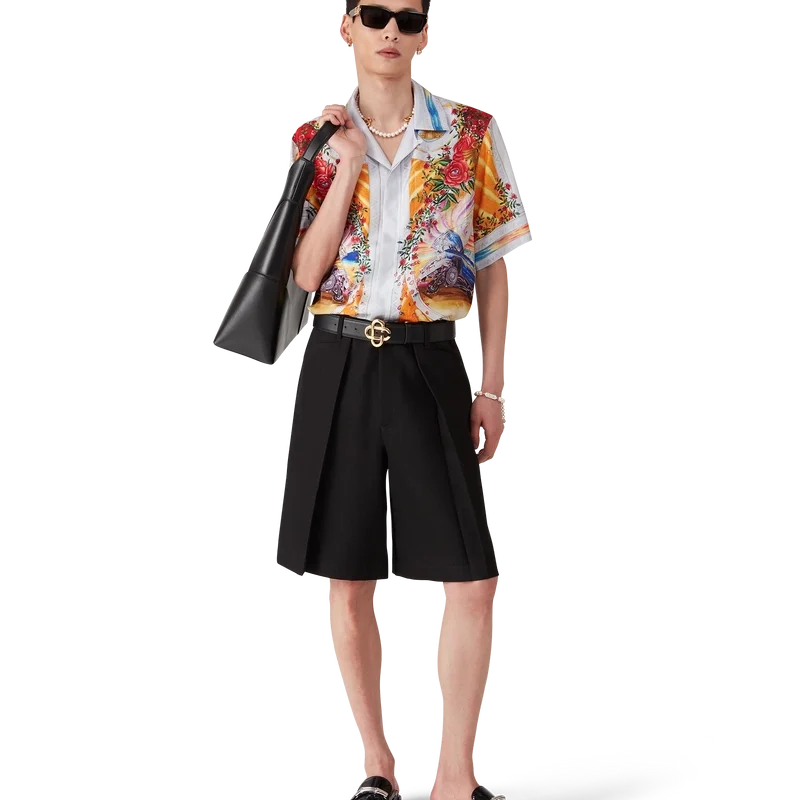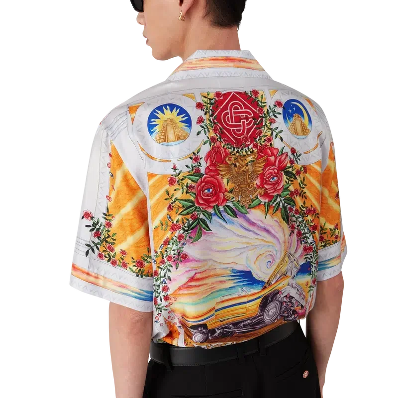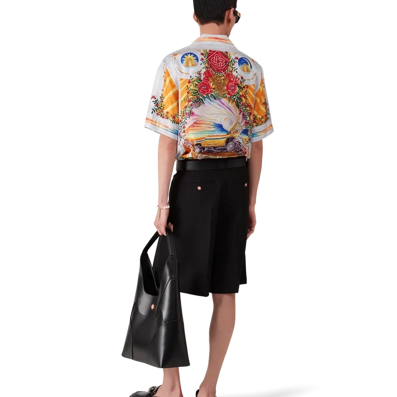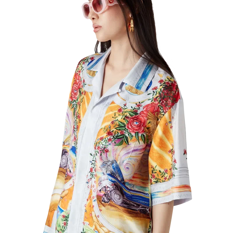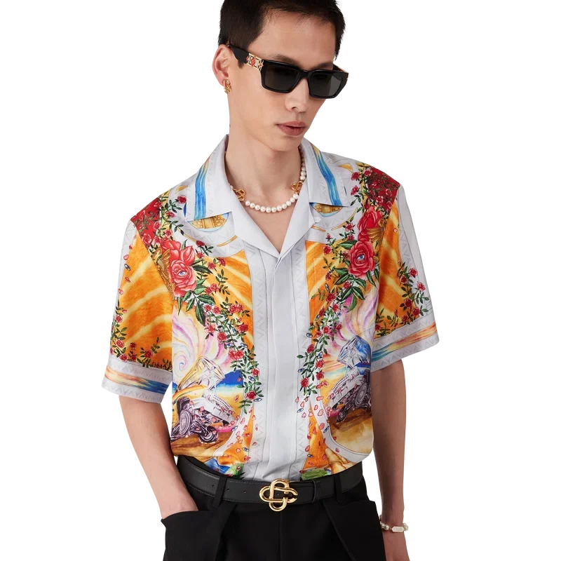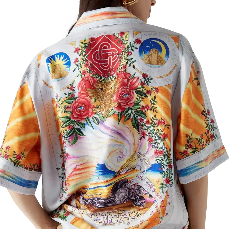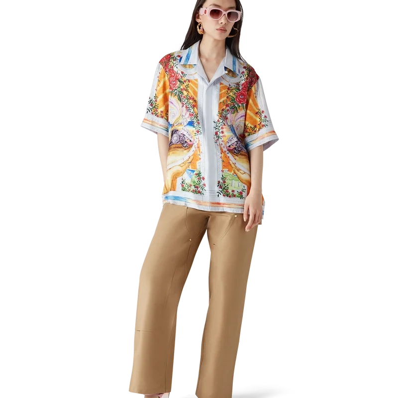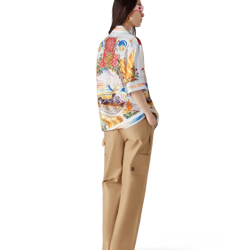 La camisa de seda La Tornade De Rose es un diseño estampado de manga corta confeccionado en tejido de satén de seda. Cuenta con cuello cubano, cierre de botones ocultos, botones de corozo con el logotipo CC entrelazado y detalles en los bordes del cuello, los puños, el dobladillo y la tapeta.