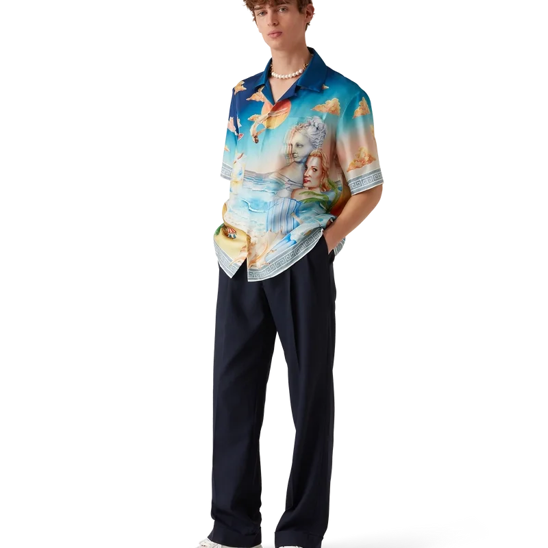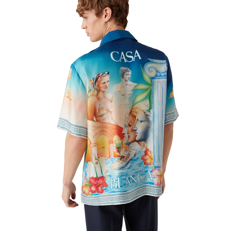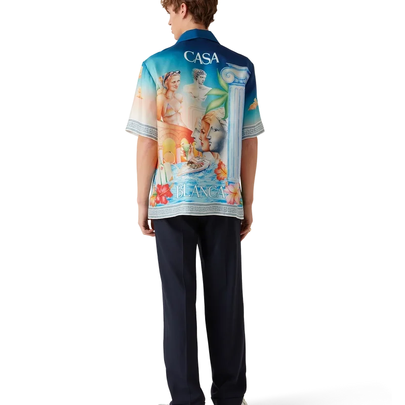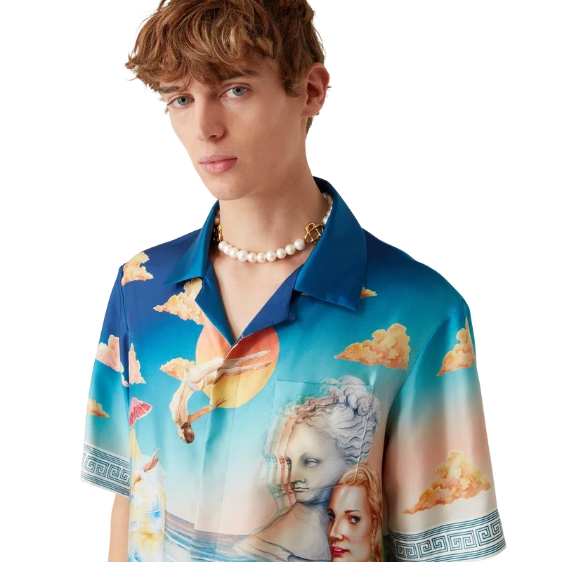 La camisa de seda Le Plongeon es un diseño estampado integral de manga corta confeccionado en sarga de seda con el estampado de temporada de la casa, inspirado en el estudio continuo de la belleza clásica y el encanto contemporáneo de la Antigua Grecia, e incorporando los elementos de diseño de la casa. Se completa con botones de corozo con el logotipo entrelazado Cc característico, cierre de botones, cuello cubano y bolsillo en el pecho.