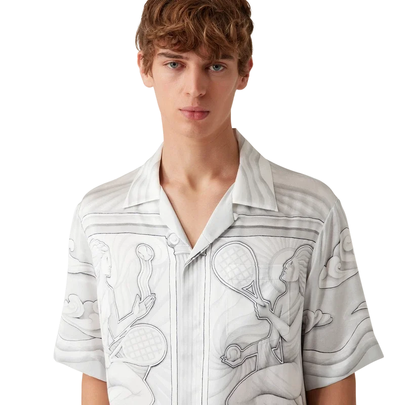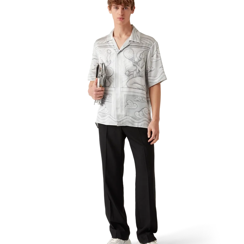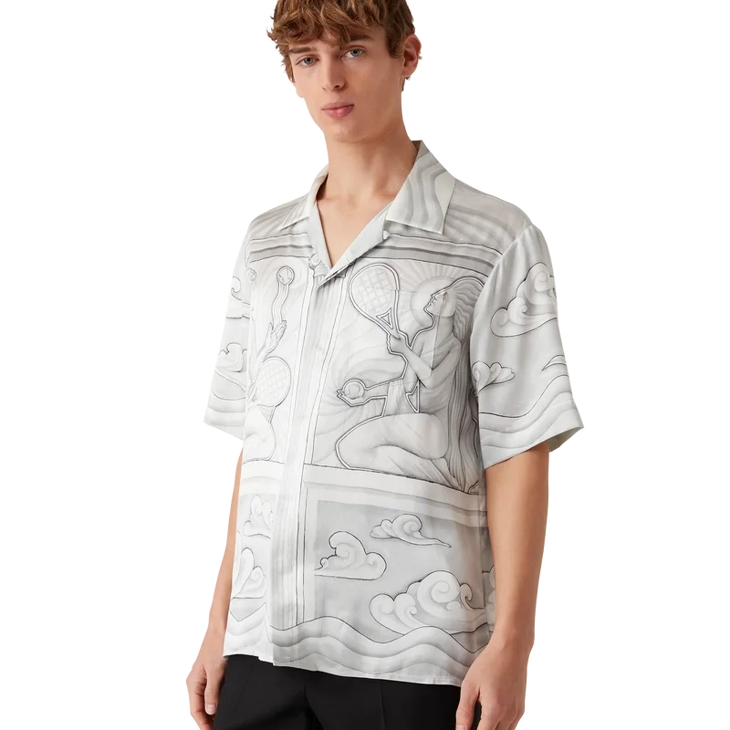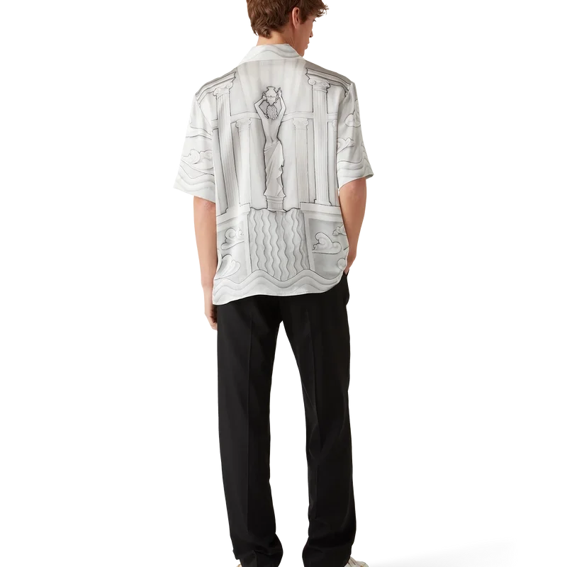 La camisa de seda Sacred Stone es un diseño estampado integral de manga corta confeccionado en tejido de satén de seda, que presenta el diseño de temporada de la casa inspirado en el efecto de piedra del trampantojo con trazos ligeros. Se completa con cuello cubano, cierre de botones y botones de corozo con el logotipo entrelazado de CC