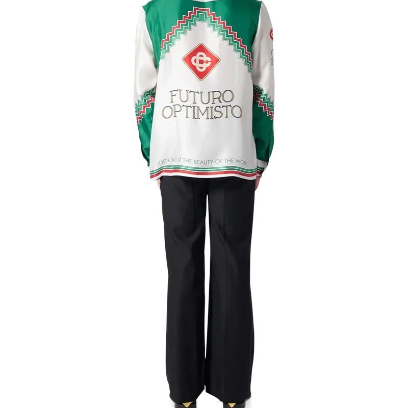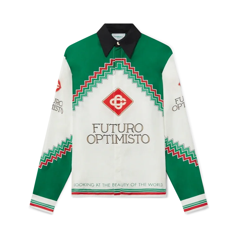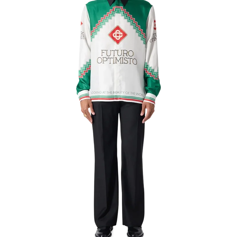 La camisa de seda Futuro Optimisto es una pieza clave de la colección Primavera/Verano 2023 que presenta la frase «Looking at the Beauty of the World» (Contemplando la belleza del mundo) y el Diamond Monogram característico de la casa. Inspirada en la esperanza eterna del espíritu, Futuro Optimisto es el hombre en armonía con la creación. Acabada con nuestro característico cierre de botones de perla con borde dorado en el cuello y los puños, tapeta oculta y etiqueta con la marca Casablanca Paris.