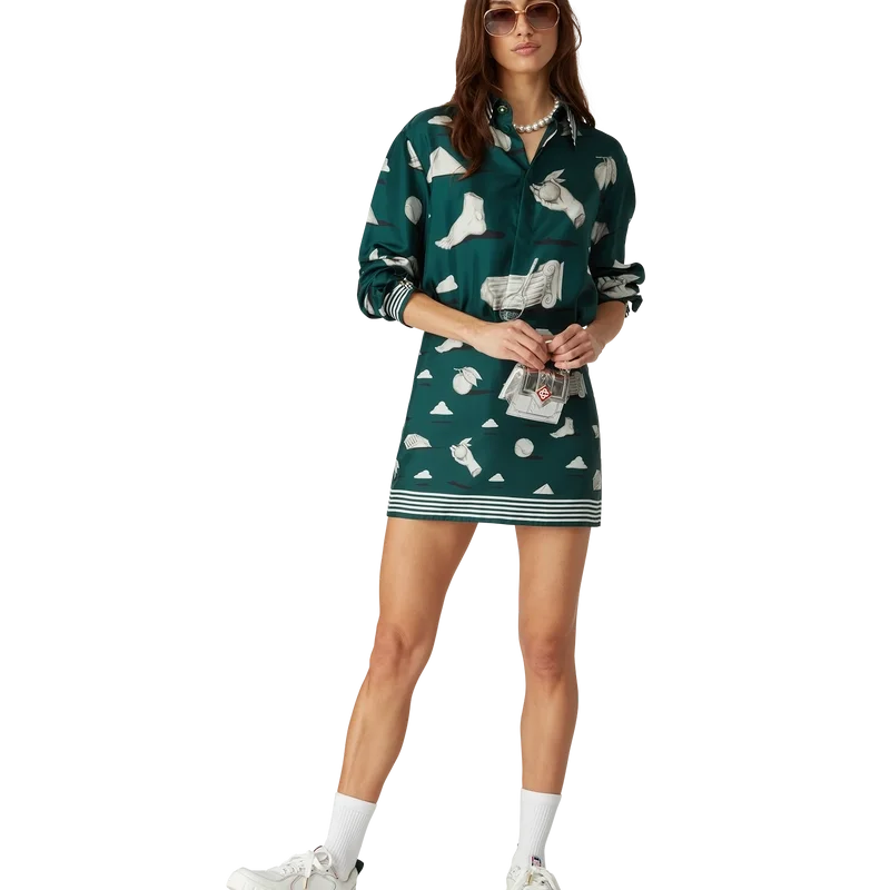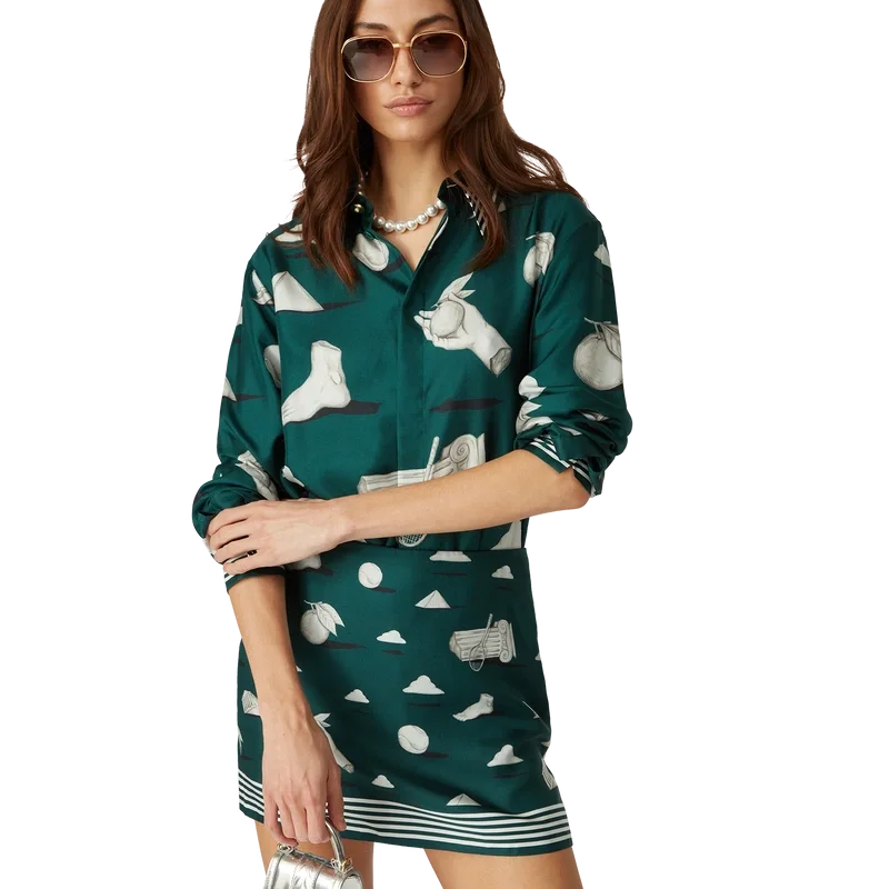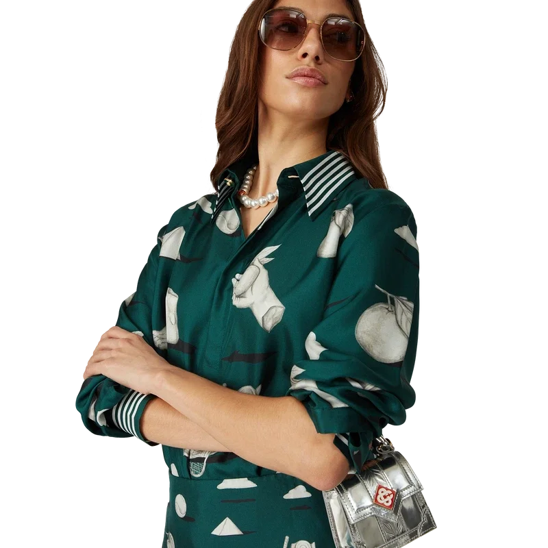 La camisa de seda Metaphysical presenta un diseño estampado en toda la superficie, confeccionada en tejido de sarga de seda, con ilustraciones que representan los elementos de diseño fundamentales. Se completa con botones esmaltados con borde dorado característicos en los puños y el cuello, cierre frontal con botones de corozo entrelazados con las iniciales «CC», cuello en pico y detalles de rayas en el cuello, los puños y el dobladillo.