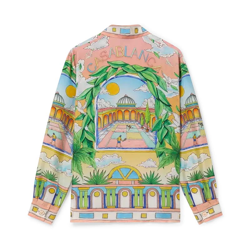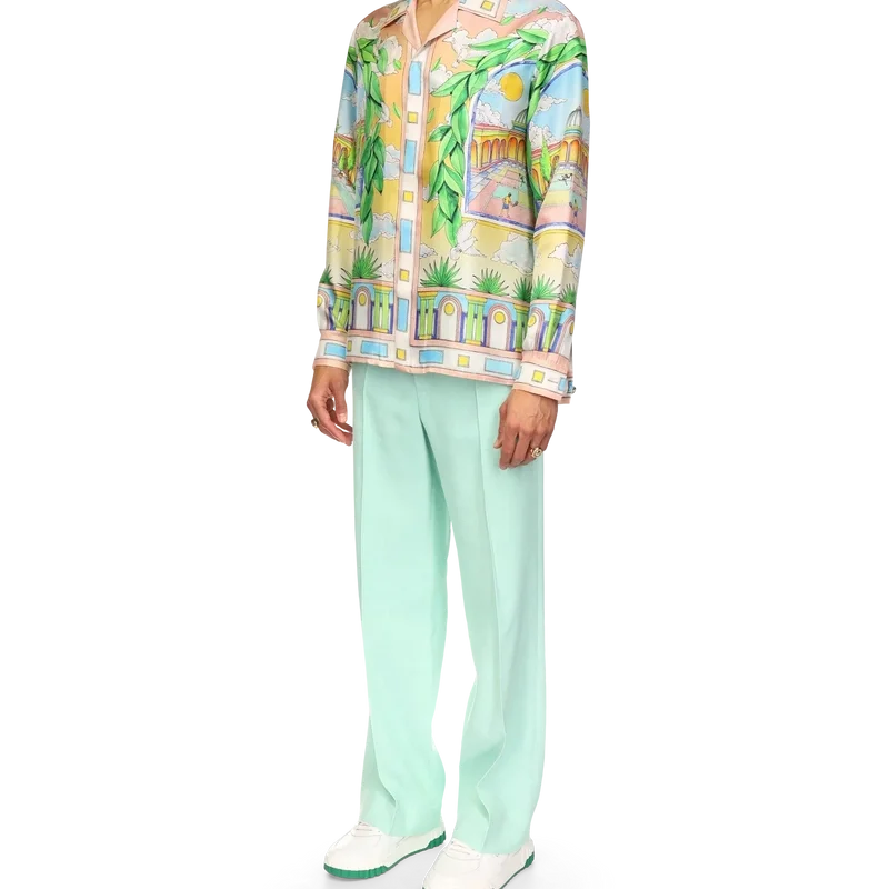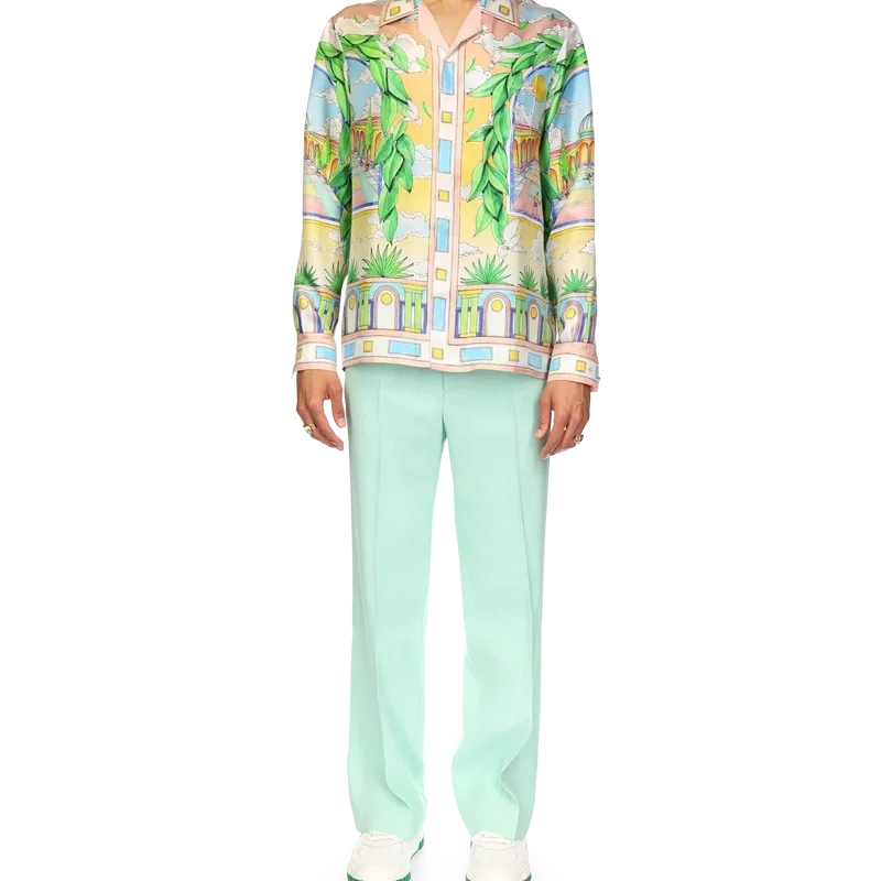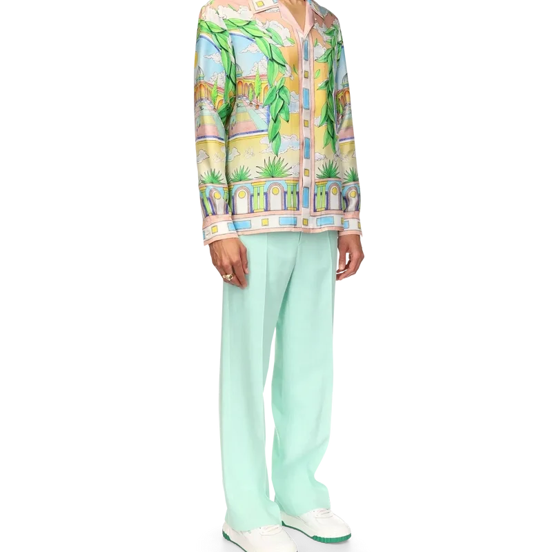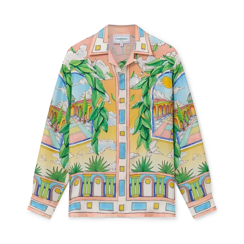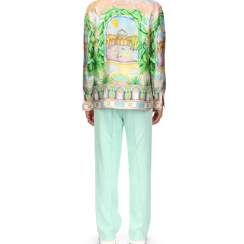 La camisa de seda Paysage Ideal es un diseño estampado integral de manga larga confeccionado en tejido de satén de seda que presenta el arte de temporada de la casa con un diseño tradicional que se centra en el arco, la simetría y el universo ideal de Casablanca. Acabada con los botones esmaltados con borde dorado característicos de la casa, cierre frontal con botones, un bolsillo en el pecho y detalles de ribete en el cuello, la tapeta, los puños y el dobladillo.