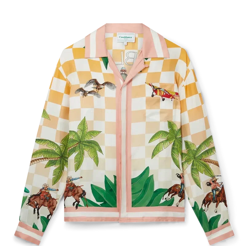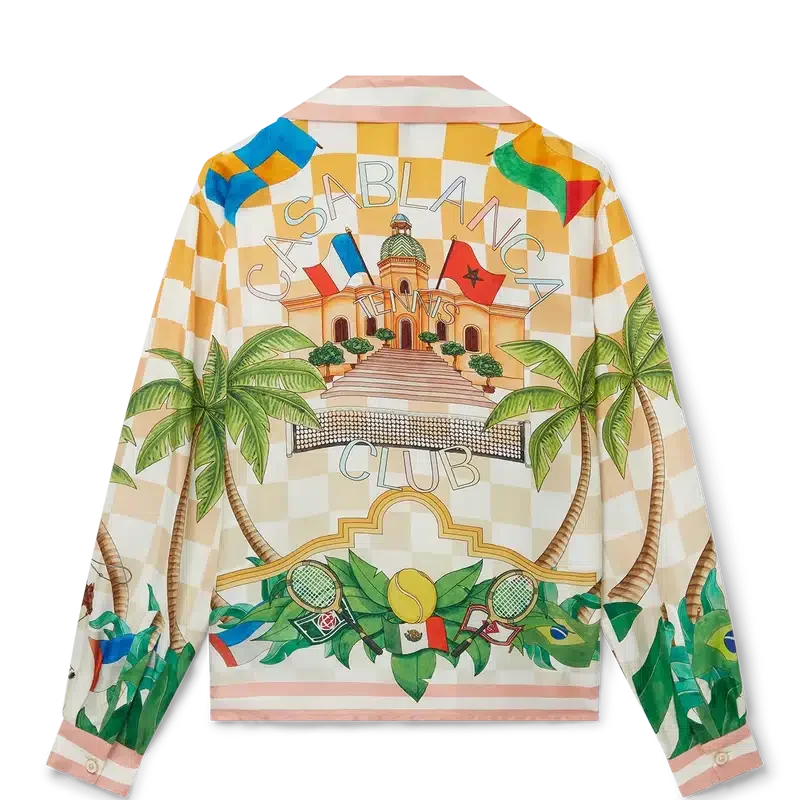La camisa de seda con cuello cubano Tennis Club es un modelo de manga larga estampado con una versión de temporada del diseño Tennis Club característico de la casa. Cuenta con cuello abierto, cierre frontal con botones y bolsillo en el pecho, y está diseñada con un corte clásico.