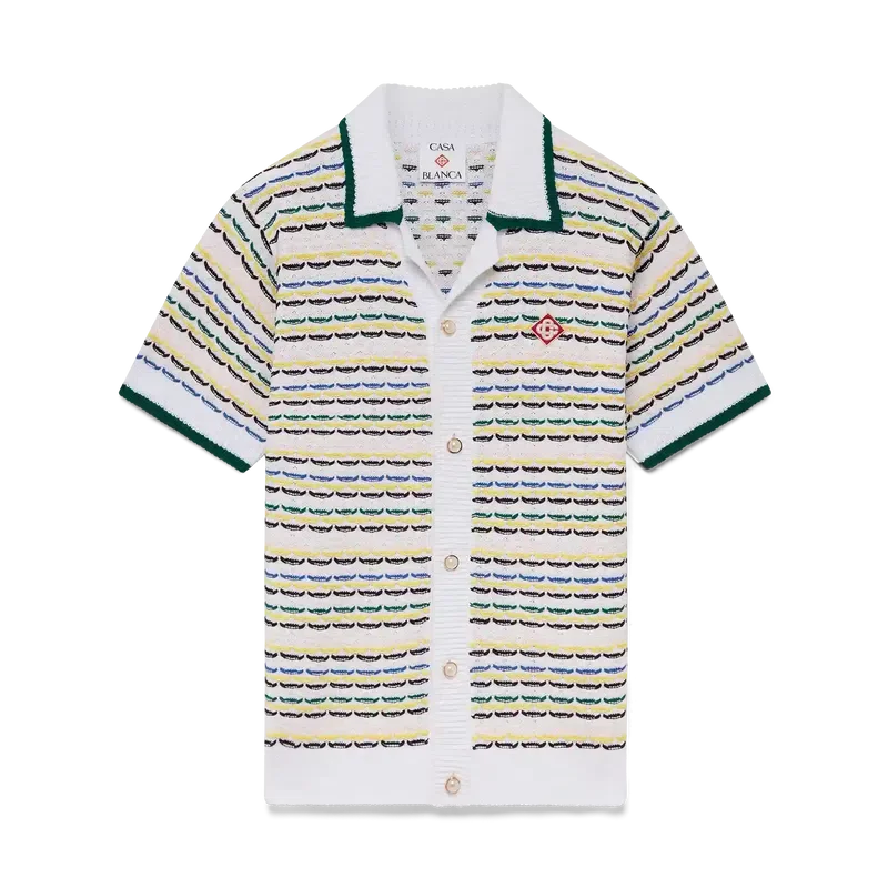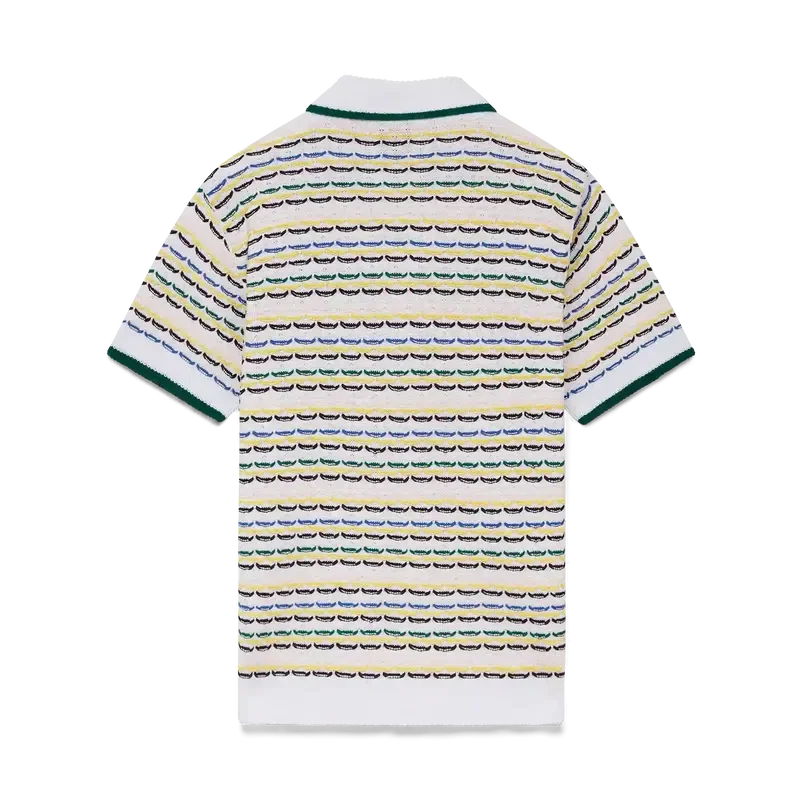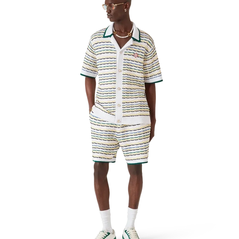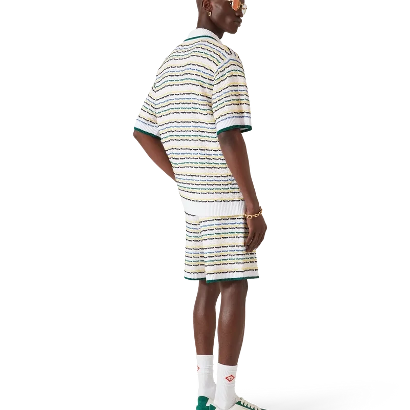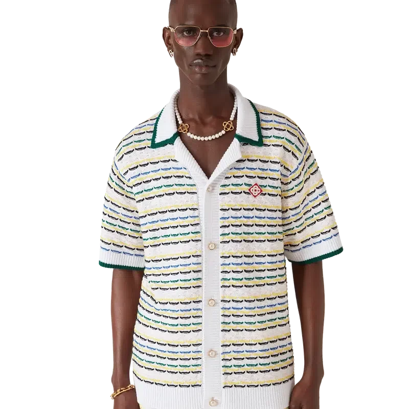 La camisa Tuck Stitch es un diseño de punto de manga corta que presenta el logotipo de diamante característico de la casa. Se completa con un cuello de estilo cubano, cierre de botones, botones de perla con borde dorado característicos y detalles acanalados en el cuello, los puños, el dobladillo y la tapeta. Diseñada para llevarse con los pantalones cortos Tuck Stitch a juego.