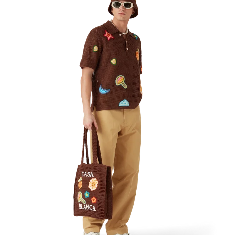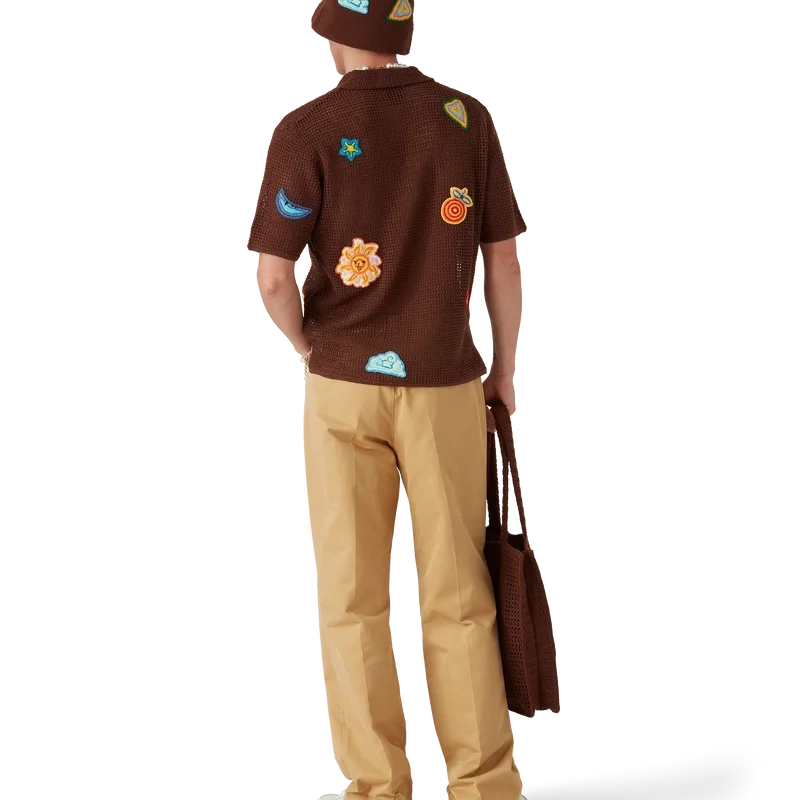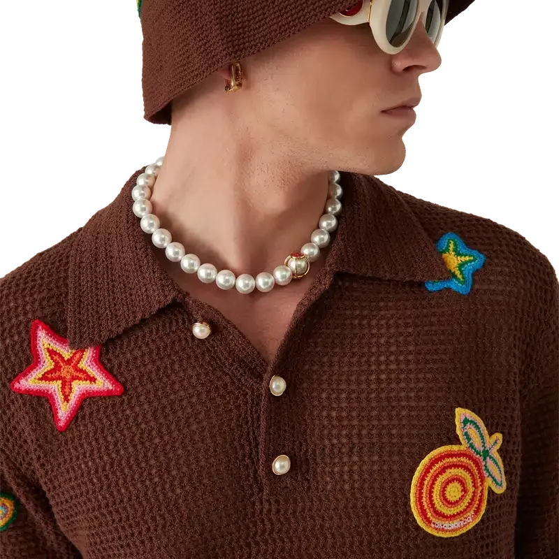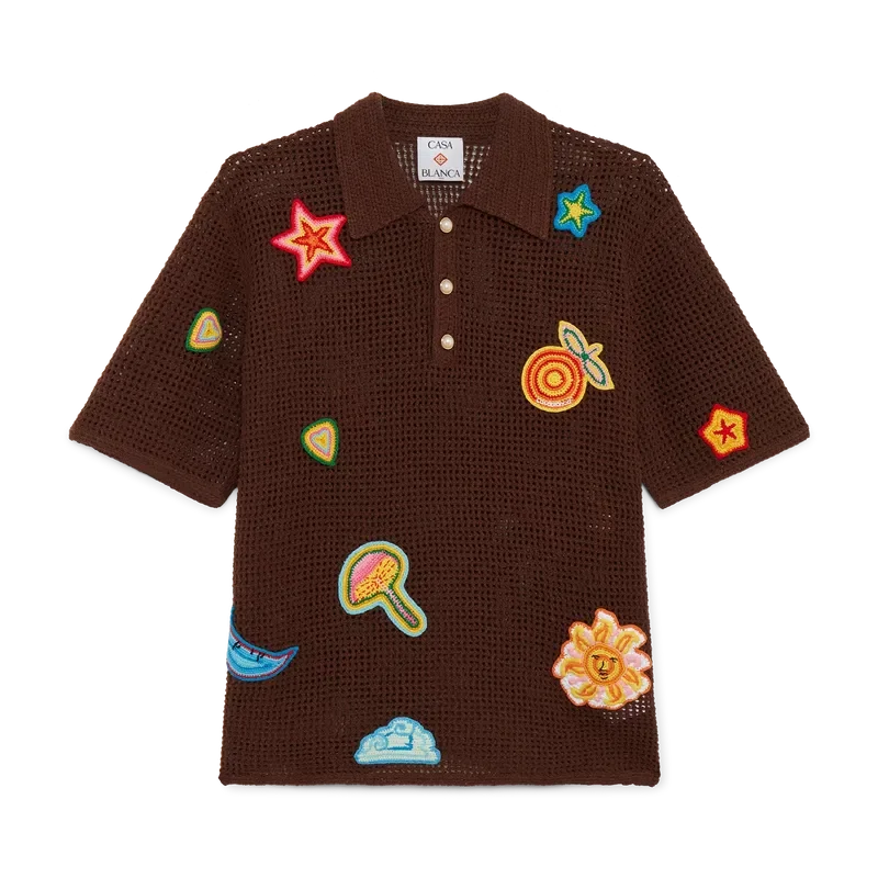 El polo con motivos de ganchillo es un diseño de manga corta confeccionado en tejido de algodón mercerizado de punto. Se completa con motivos de los elementos de diseño clásicos de la casa, botones de perla con borde dorado característicos, cuello acanalado y puños.