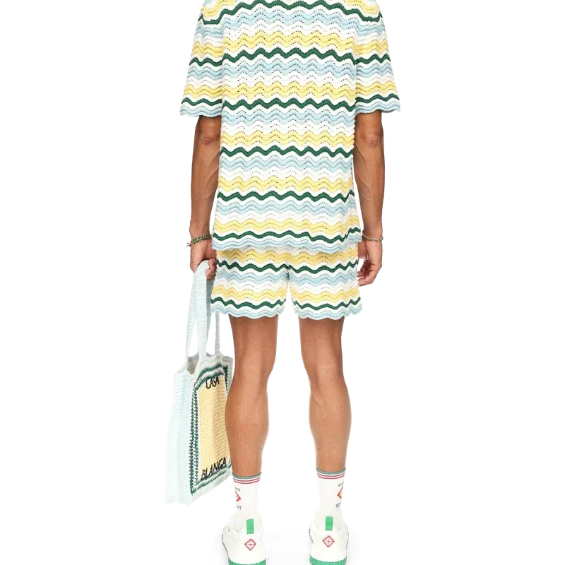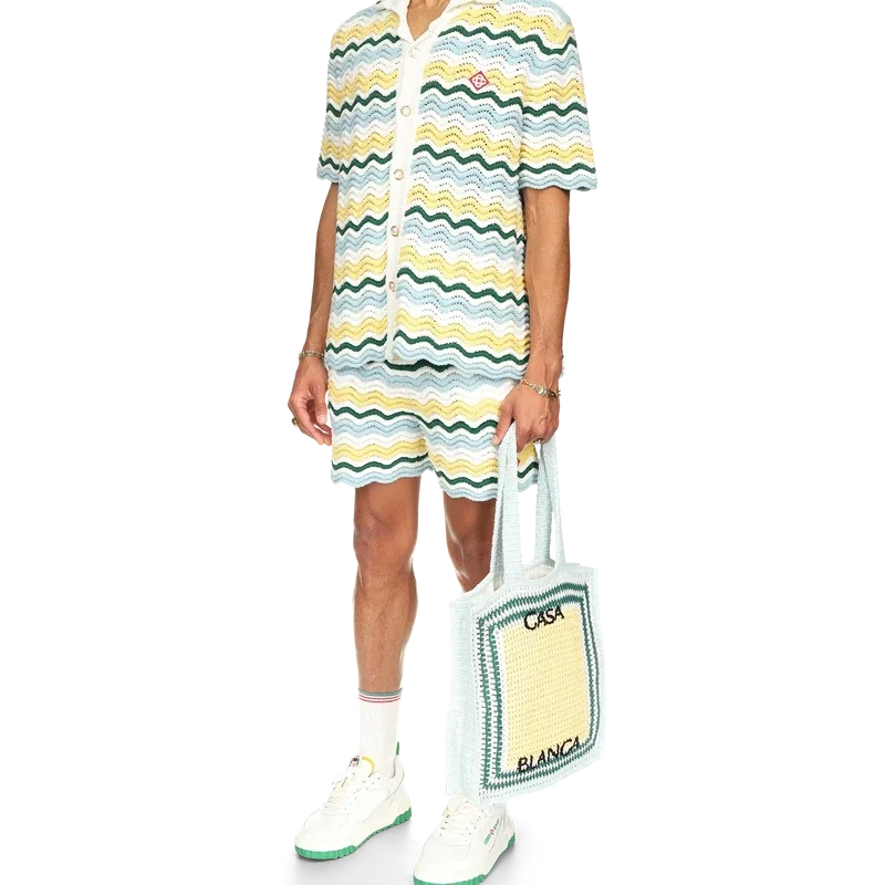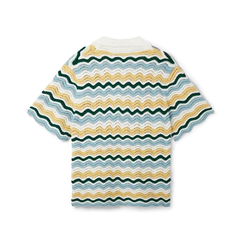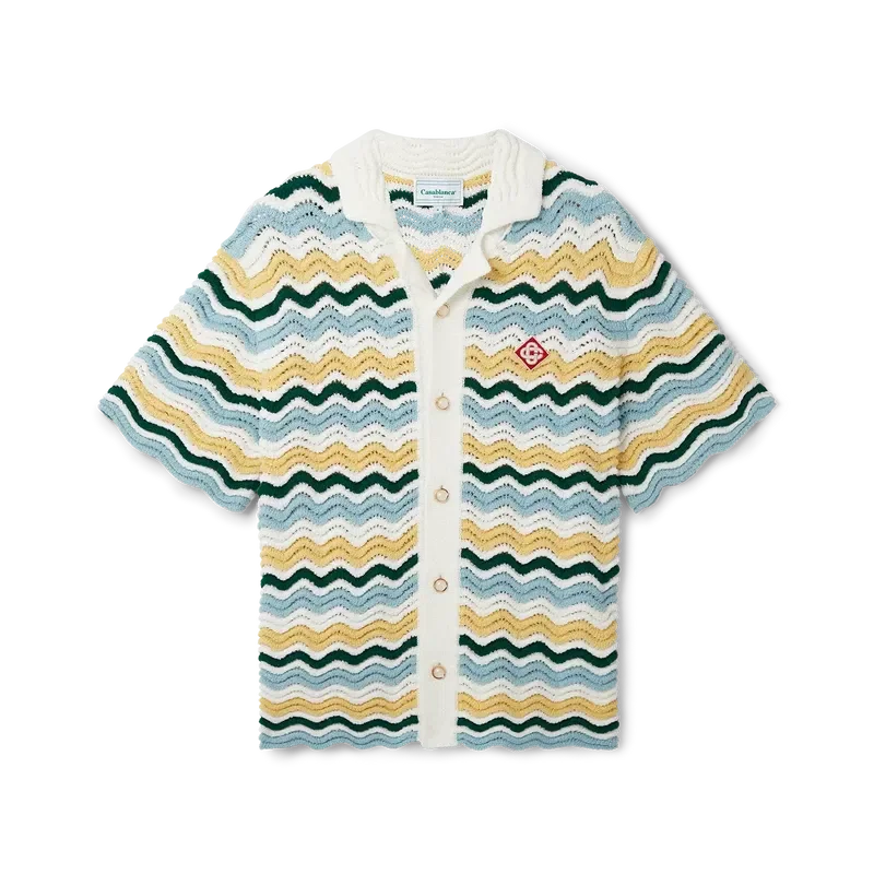 La camisa de bouclé ondulado es un estilo emblemático de Casablanca confeccionado con un tejido de ganchillo de textura suave y trama abierta. Acabada con nuestro característico cierre de botones de perla con borde dorado, cuello abierto, mangas cortas y etiqueta con la marca Casablanca Paris. Diseñada para llevarse con cortes clásicos.