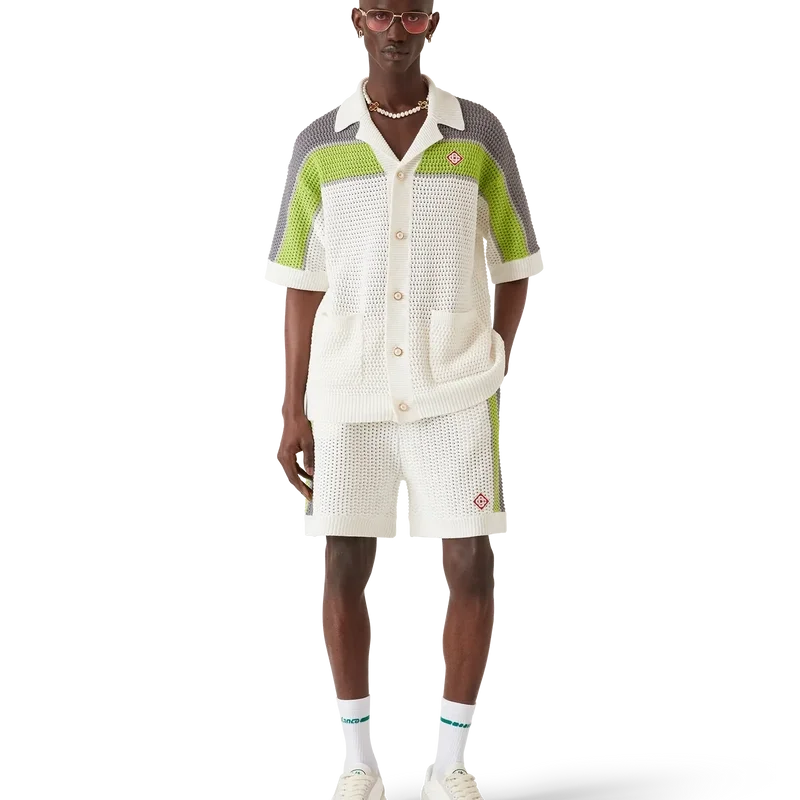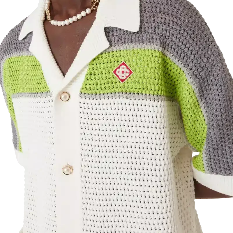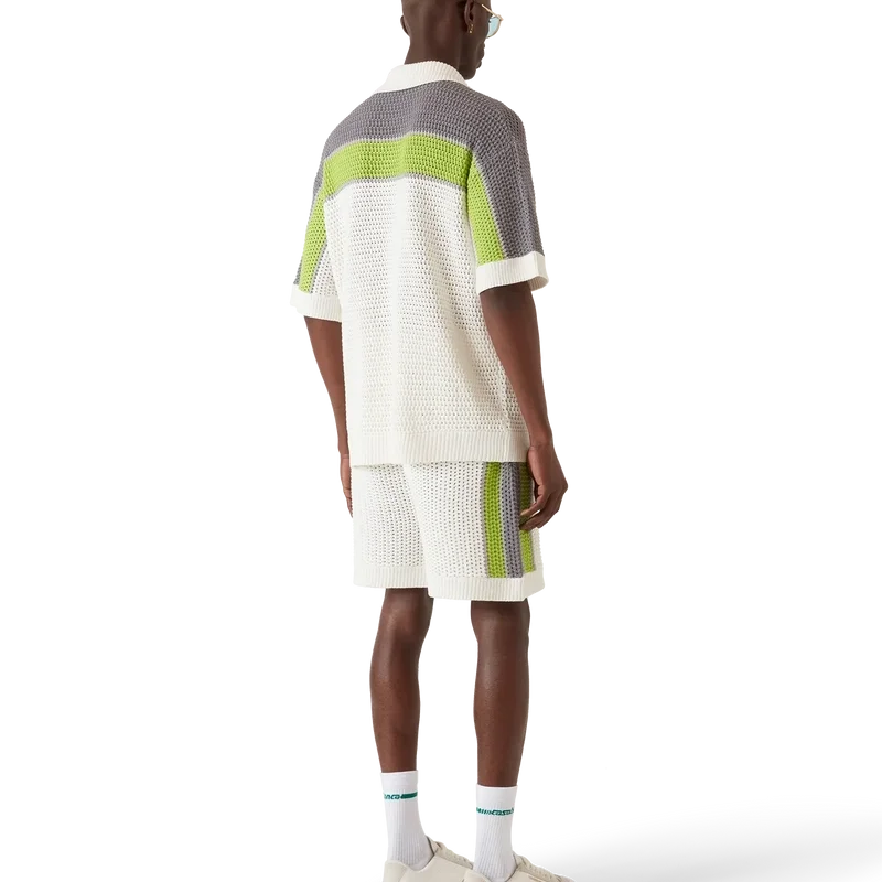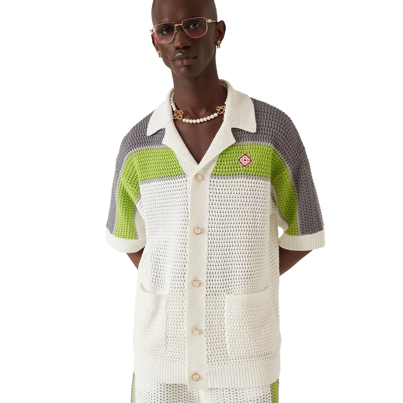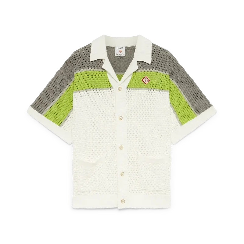 La camisa de ganchillo a rayas es un diseño clásico y refinado que presenta el logotipo de la casa y detalles de rayas en los hombros, el pecho y las mangas, en colores naturales. Acabada con cuello, puños y dobladillo acanalados, cierre frontal con botones, bolsillos de parche en la parte delantera, botones de perla con borde dorado característicos y una silueta holgada.
