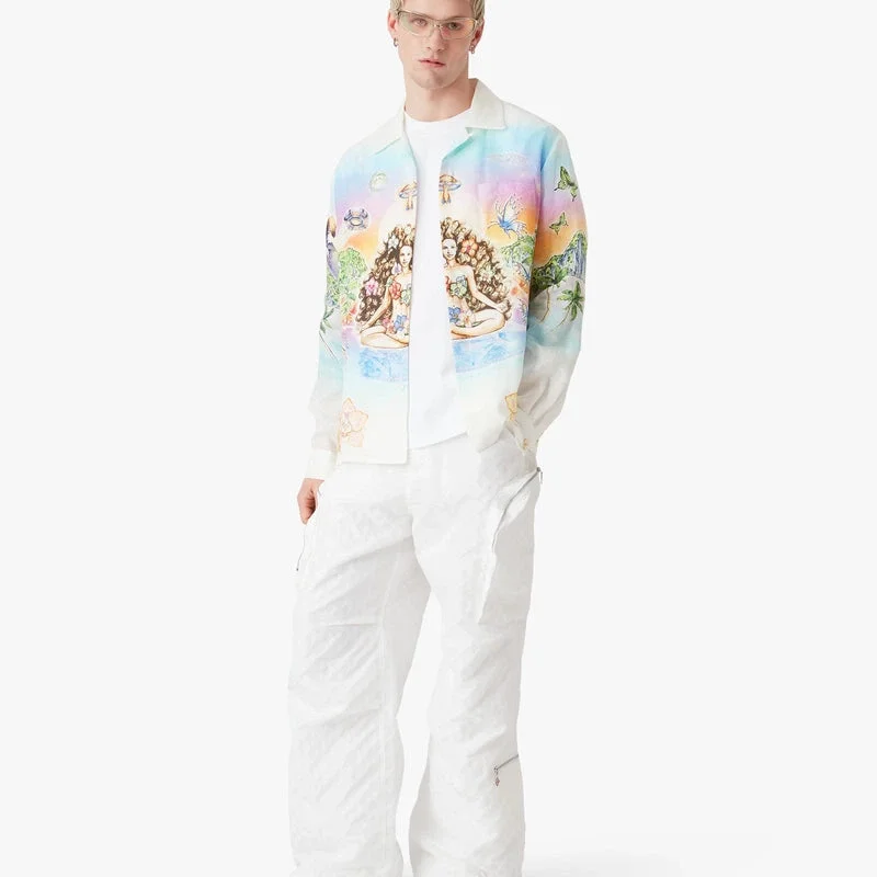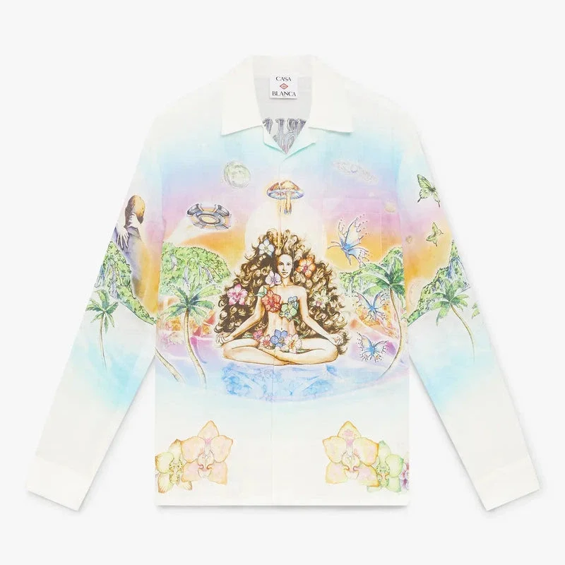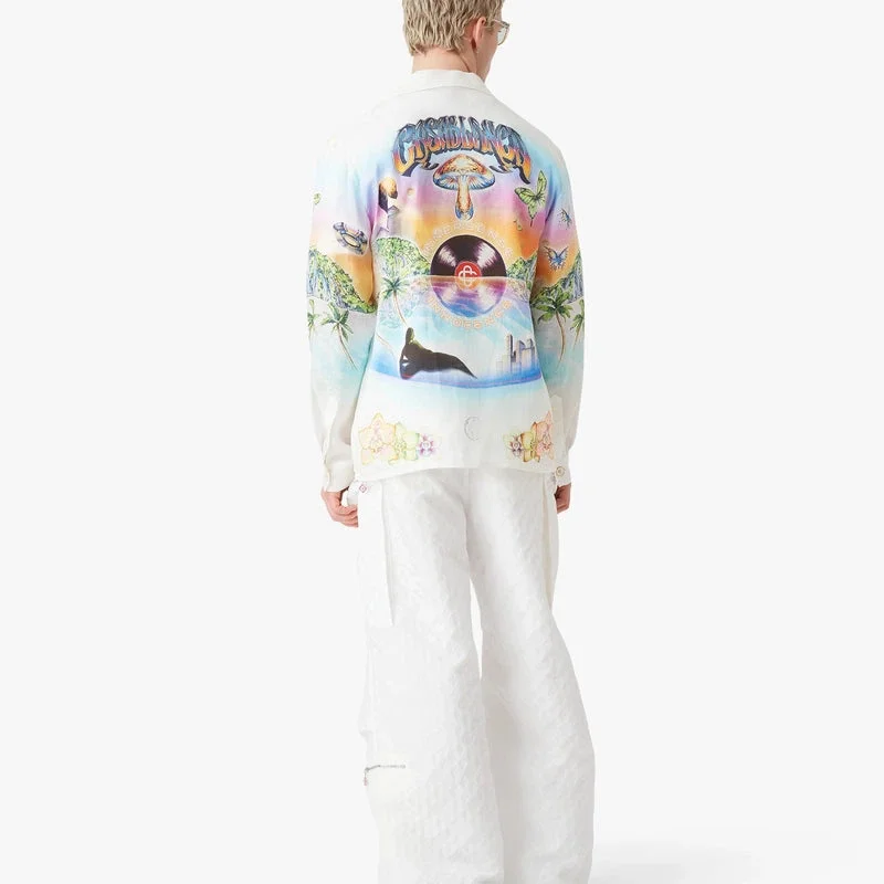 La camisa de lino de manga larga de Innersense presenta un estampado integral con un diseño que representa la dualidad y describe una utopía idealista en la que la música lo impregna todo, con una mujer que encarna la inocencia rodeada de orquídeas y levitando sobre discos compactos, flotando entre el agua, las mariposas y los ovnis. Se completa con cuello de estilo cubano, cierre de botones, botones de corozo con el logotipo CC entrelazado, un bolsillo en el pecho y botones esmaltados con borde dorado en los puños.