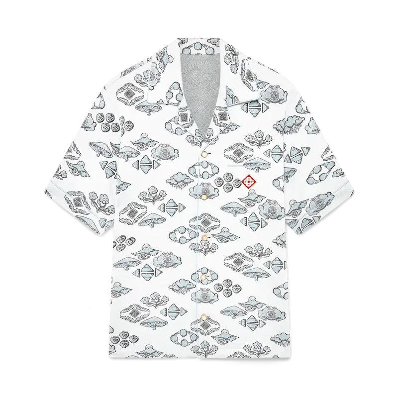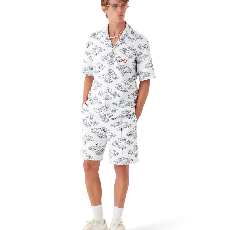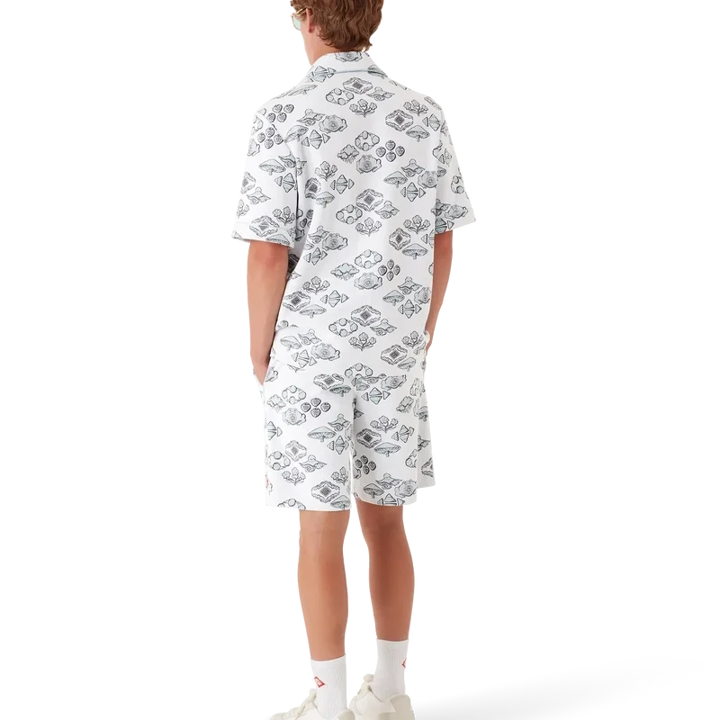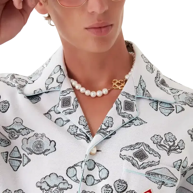 La camisa de manga corta con motivo jacquard es un diseño clásico que presenta el logotipo de diamantes característico de la casa y motivos inspirados en la naturaleza y el tenis en un patrón de rombos. Se completa con cuello cubano, cierre de botones, botones de perla con borde dorado característicos, un bolsillo en el pecho y ribetes en el cuello, los puños, la tapeta y el bolsillo del pecho.