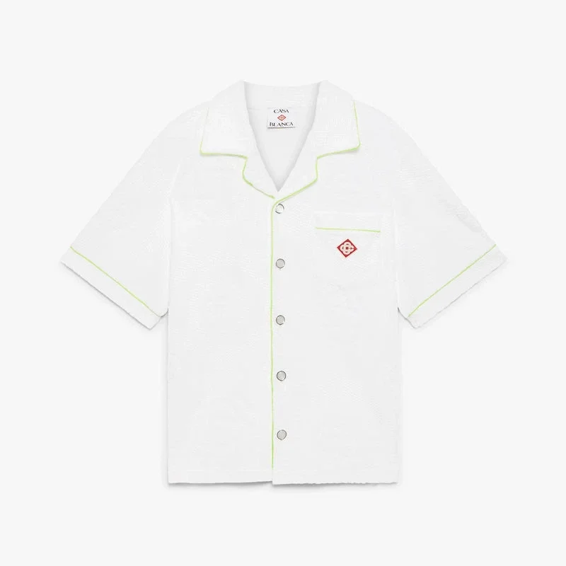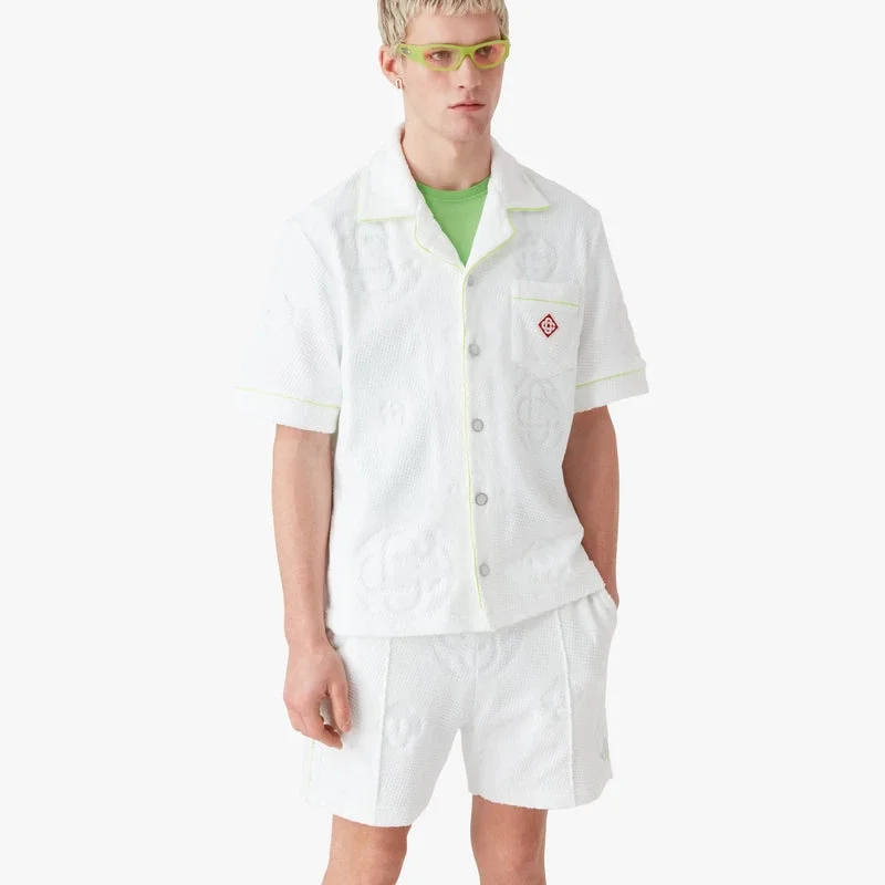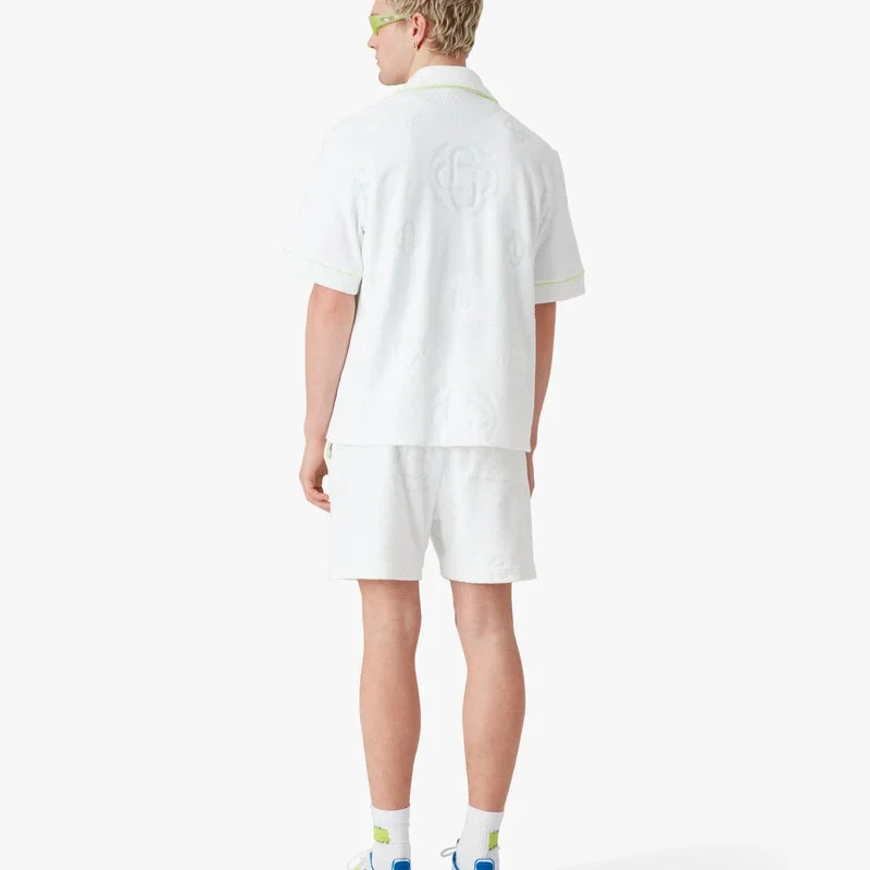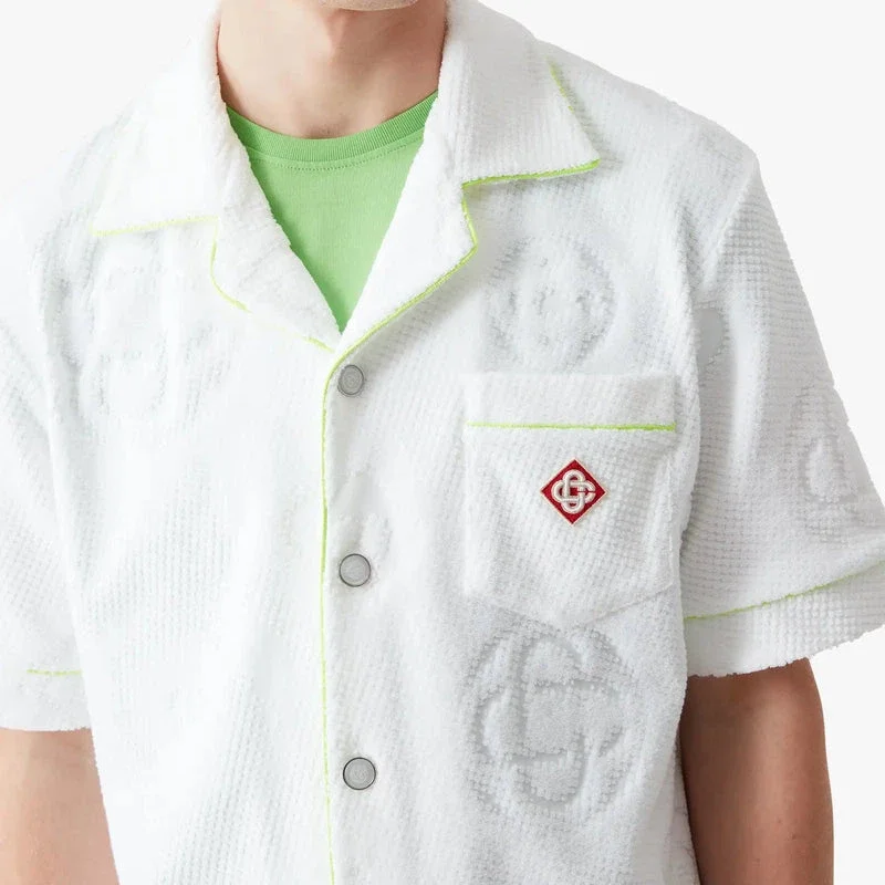 La camisa de manga corta de rizo con Monogram presenta un diseño refinado, con el icónico estampado Monogram de la casa en toda la prenda y el logotipo del diamante de Casablanca. Se completa con un cuello cubano, cierre de botones, botones de perla con borde dorado característicos, un bolsillo en el pecho y ribetes en contraste en la tapeta y el bolsillo.