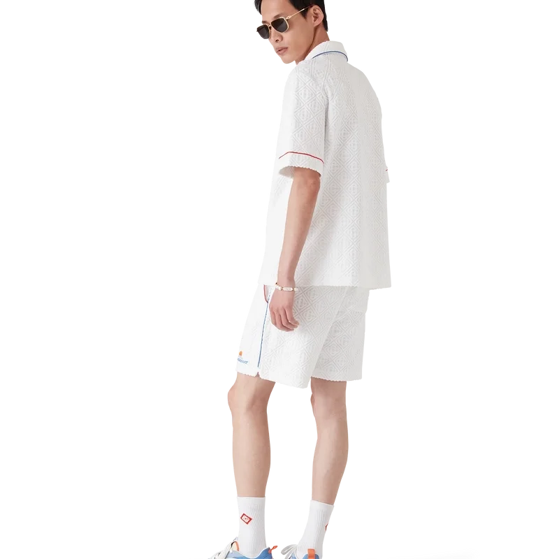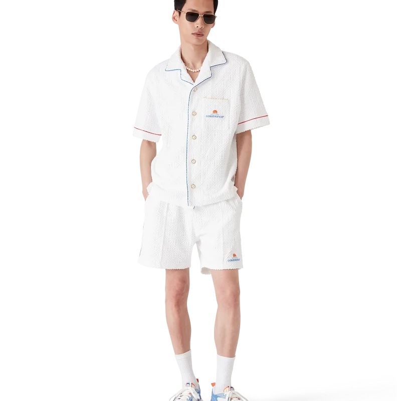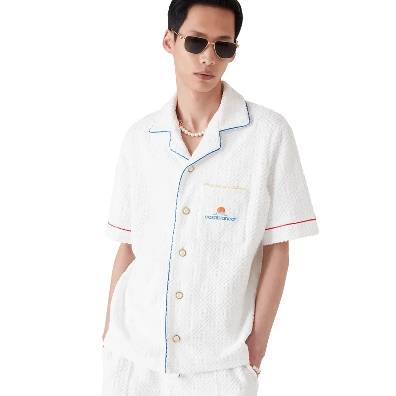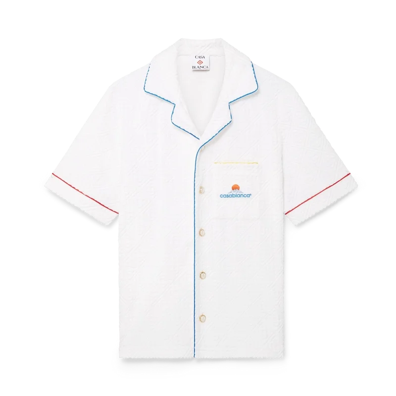 La camisa de rizo de manga corta con monograma es un diseño clásico confeccionado con tejido de rizo con monograma. Se completa con cierre de botones, botones de perla con borde dorado característicos, un bolsillo en el pecho y ribetes en el cuello, la tapeta, los puños y el bolsillo del pecho.