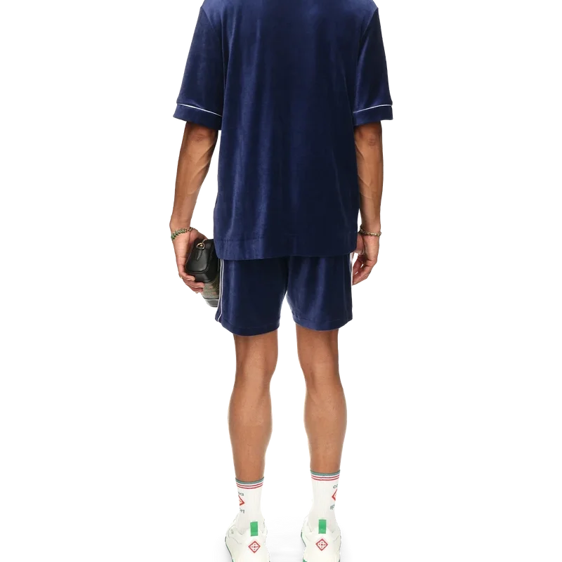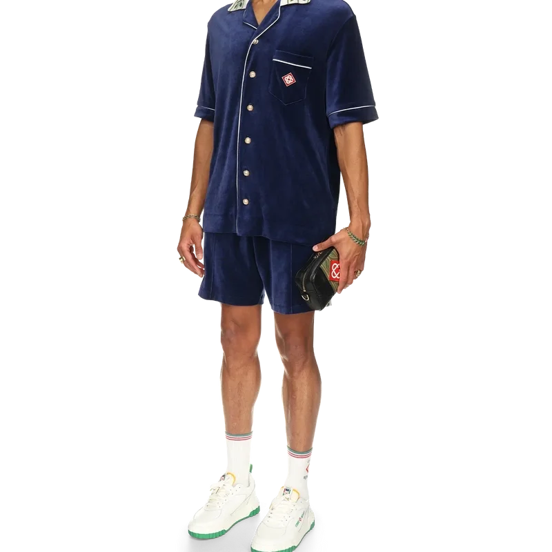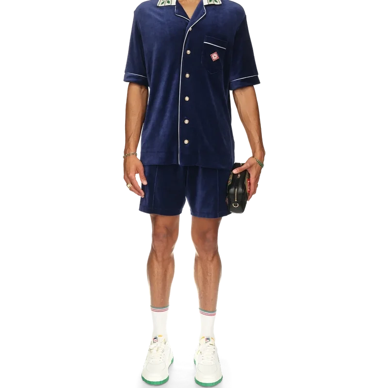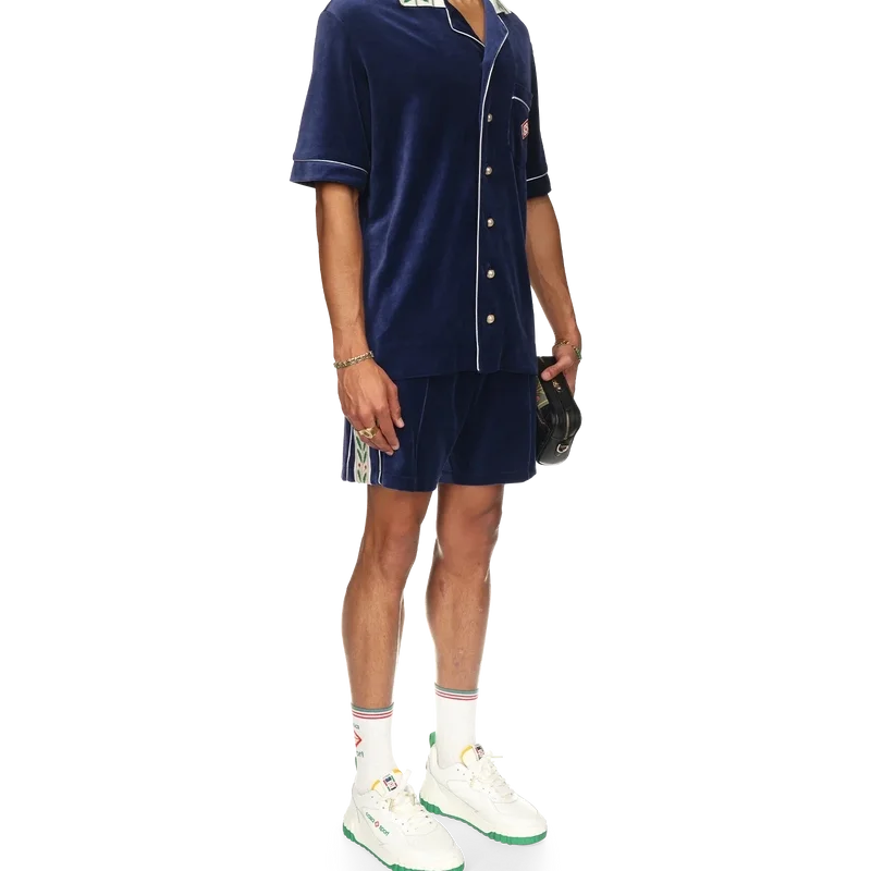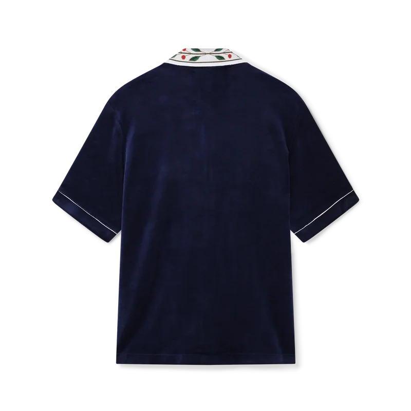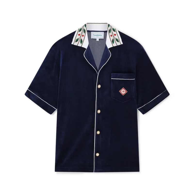 La camisa de terciopelo Laurel es un diseño de manga corta con el logotipo de Casablanca en el bolsillo del pecho. Se completa con un bolsillo en el pecho, cierre frontal con botones, botones de perla con borde dorado característicos de la marca, ribete blanco en la tapeta, los puños y el bolsillo, y un cuello de punto con el diseño Laurel característico de la casa.