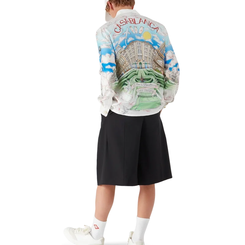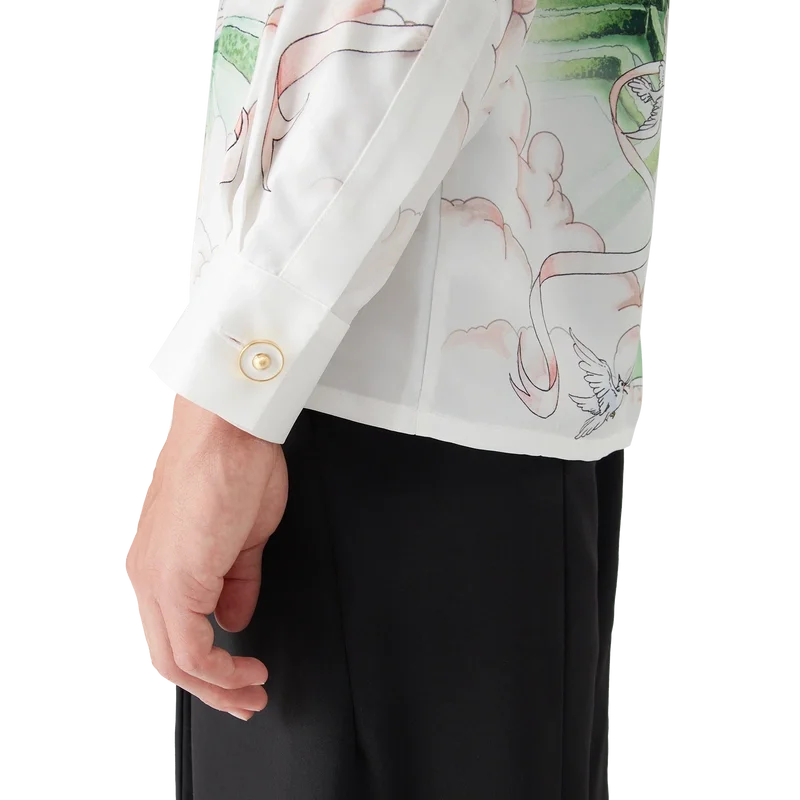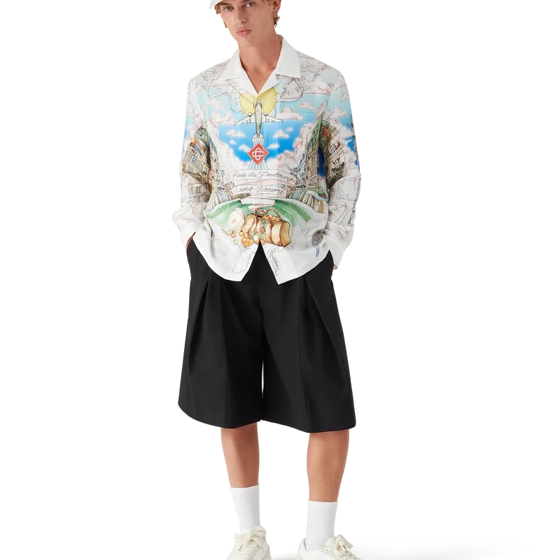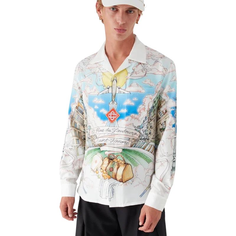 La camisa de seda de manga larga de La Vie Parisienne es un modelo con estampado integral, diseñado en exclusiva para nuestra tienda insignia, con motivos inspirados en la arquitectura, el tenis, la naturaleza y los viajes, que representan nuestra tienda de París, ubicada en la Rue Du Faubourg Saint-Honoré, una de las calles con más historia del mundo en cuanto a moda y diseño y un emblema de la elegancia y sofisticación francesas. Se completa con cuello cubano, cierre de botones, botones de corozo con el logotipo Cc entrelazado y botones esmaltados con borde dorado en los puños. Esta prenda está disponible exclusivamente en Casablancaparis.com y en nuestra tienda de París.