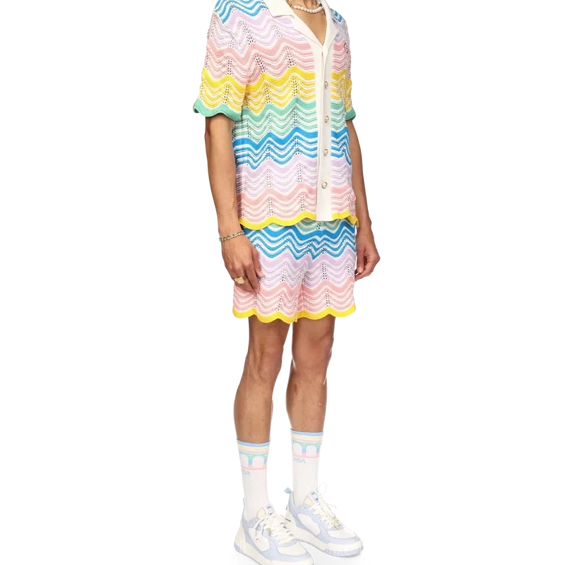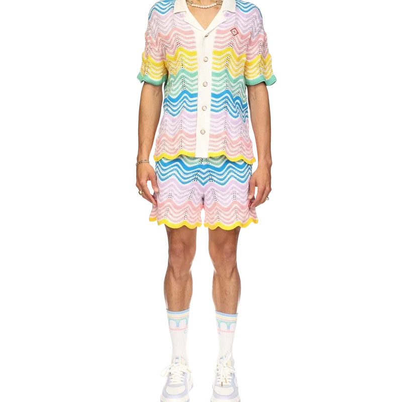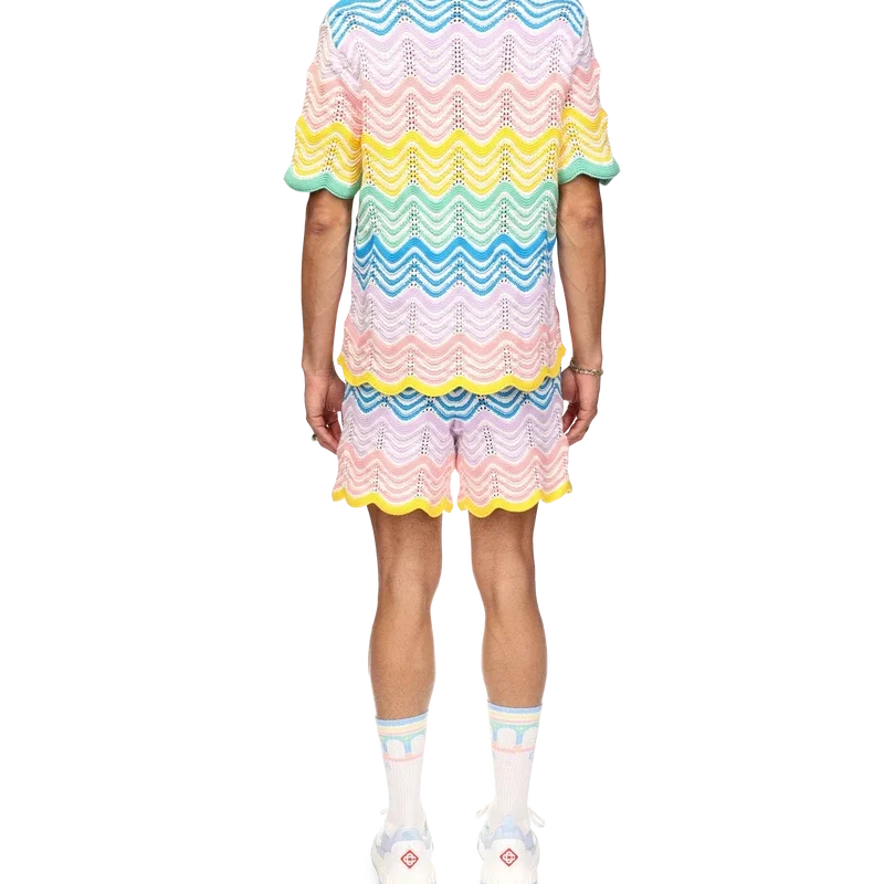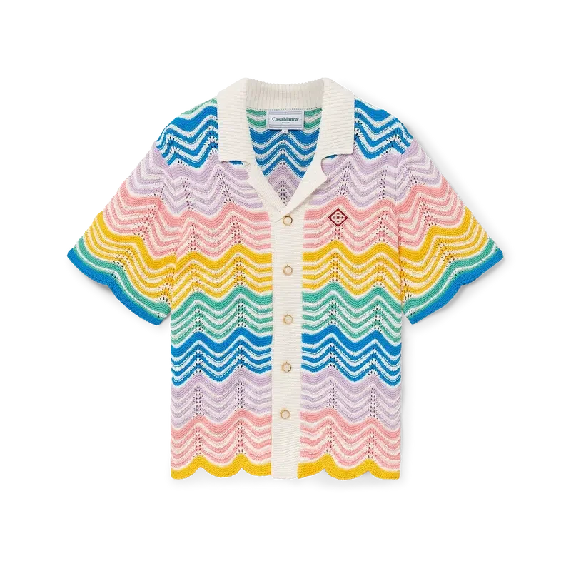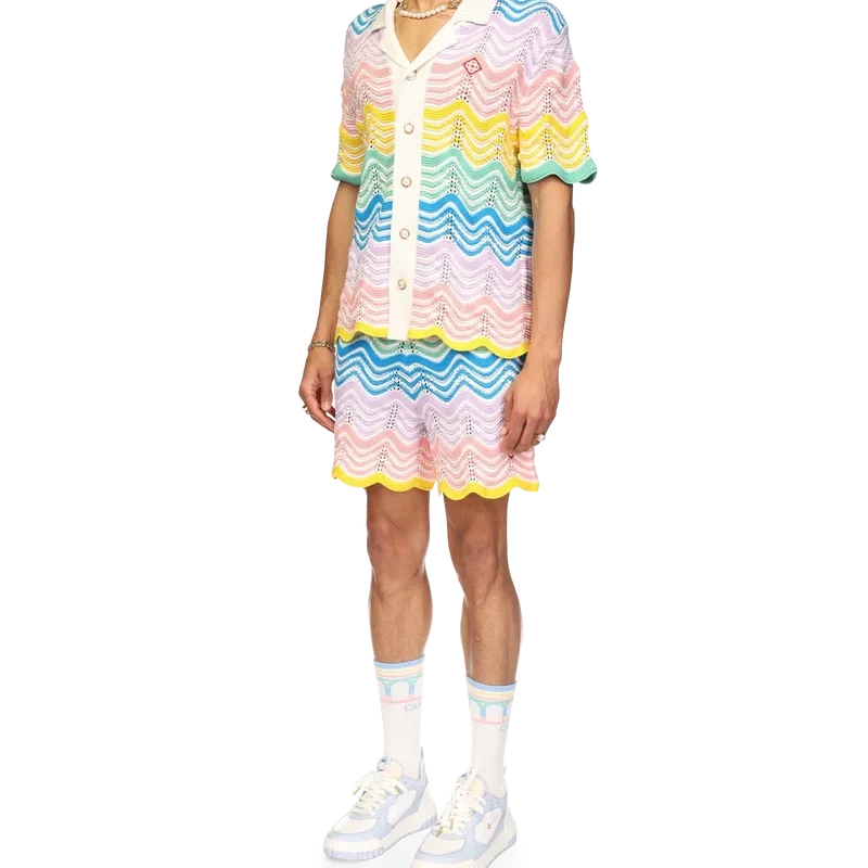 La camisa de punto con degradado ondulado es un diseño clásico de Casablanca confeccionado en tejido de algodón de ganchillo con el patrón ondulado de la casa, inspirado en el movimiento Memphis, que sirve como elemento de diseño fundamental. La paleta de colores de esta colección es ligera e idealista, y enfatiza los temas etéreos que son el núcleo de nuestra marca. Se completa con el logotipo de diamante característico de la casa, pantalones cortos, cuello blanco en contraste, puños y tapeta con detalles de bordes azules.