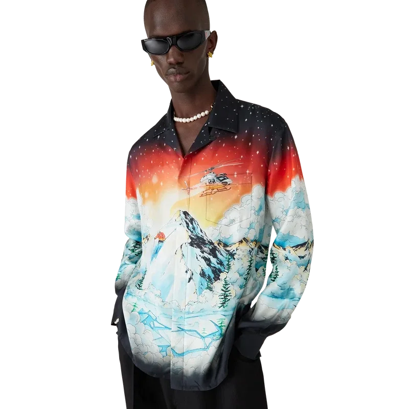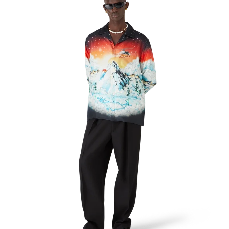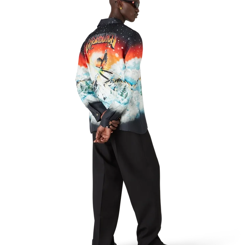 La camisa de seda Ski Lake es un diseño de manga corta confeccionado en sarga de seda, con el estampado multicolor Ski Lake de la temporada. Inspirado en el espectacular contraste de un cielo rojo ardiente contra el paisaje alpino, el diseño captura la intensidad vibrante del sol poniente sobre las siluetas escarpadas de las montañas. Se completa con cuello cubano, cierre de botones, botones de corozo con el logotipo entrelazado de Cc, botones esmaltados con borde dorado en los puños y un bolsillo en el pecho.