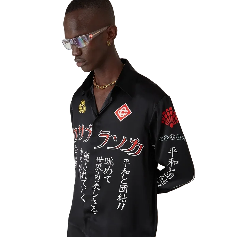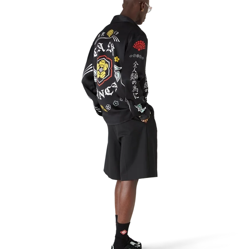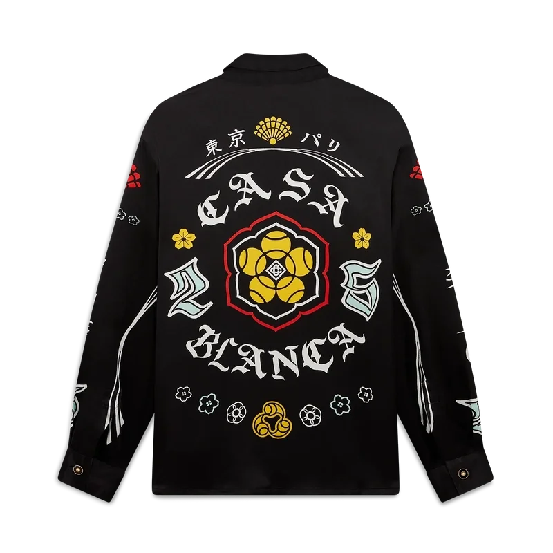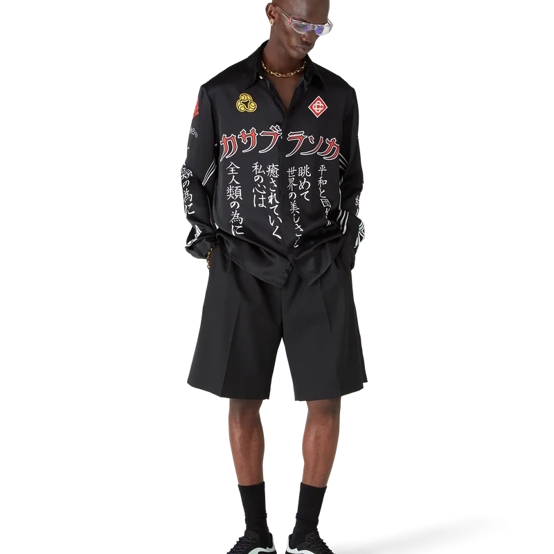 La camisa de seda de manga larga Emblem presenta un diseño estampado con las ilustraciones de la temporada: nos inspiramos en la subcultura japonesa del BōSōZoku para uno de nuestros temas principales. El contraste entre los elementos gráficos y el texto nos recordó mucho a Casablanca. Creamos nuestra propia versión, incorporando frases que describen la marca, como «Contemplando la belleza del mundo». El diseño es poco convencional, pero la composición está cuidadosamente equilibrada, lo que le da un aire único y a la vez armonioso. Se completa con cuello en punta, cierre de botones, botones de corozo con el logotipo entrelazado de Cc y botones esmaltados con borde dorado en los puños y en el cuello.