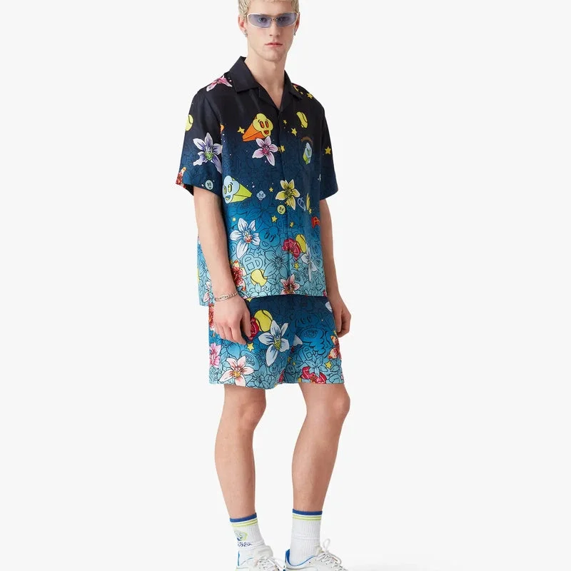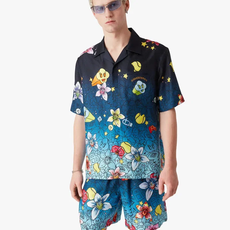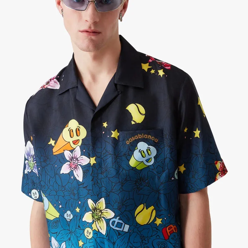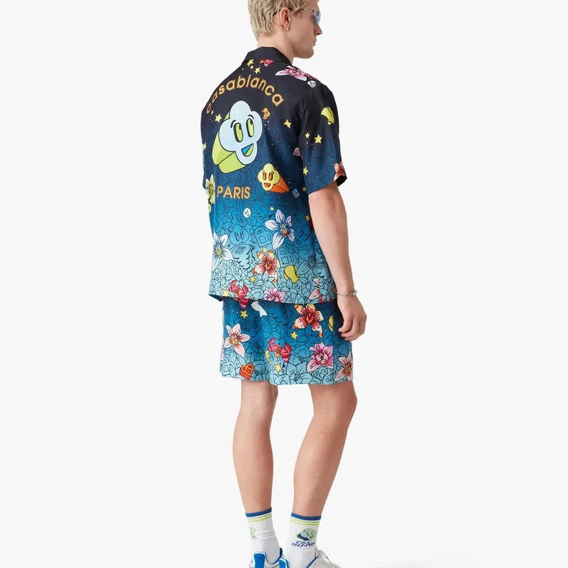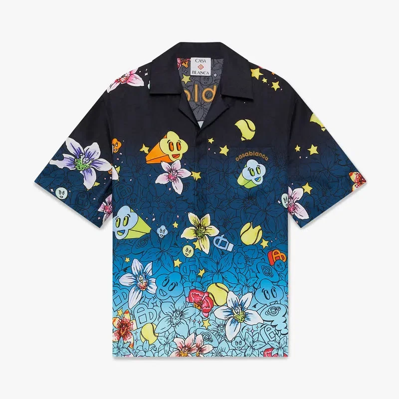 La camisa de seda de manga corta Collage D’icones Graphiques presenta un diseño estampado en toda la prenda, con ilustraciones que representan la iconografía y los elementos de diseño de la nueva temporada, incluyendo interpretaciones del logotipo, la sonrisa CC y la flor de orquídea. Se completa con cuello cubano, cierre de botones, botones de corozo con el logotipo CC entrelazado, un bolsillo en el pecho y el logotipo Casablanca de la casa.