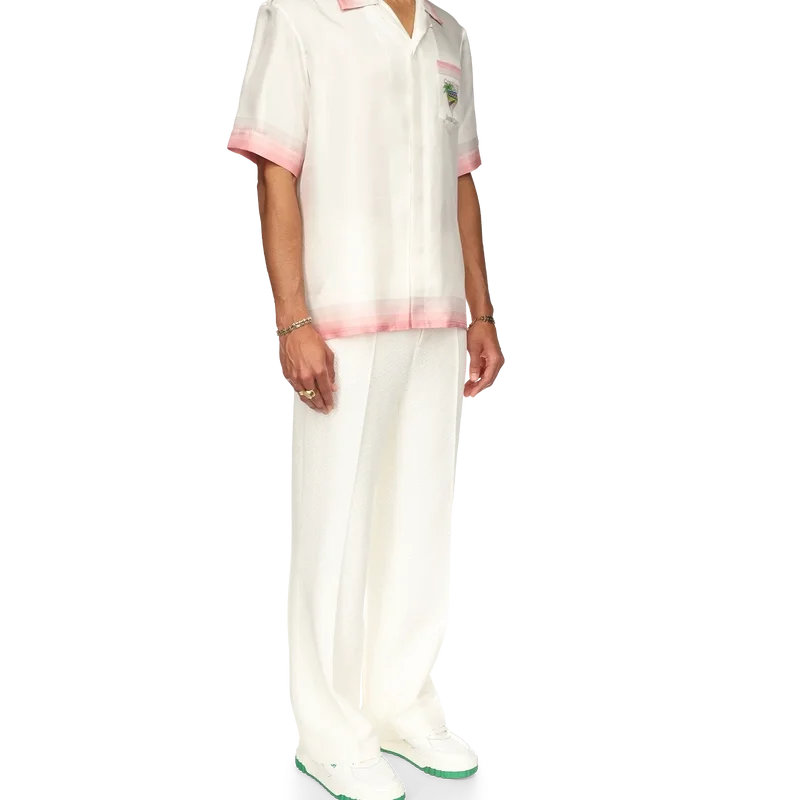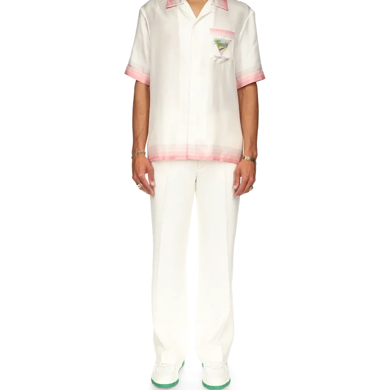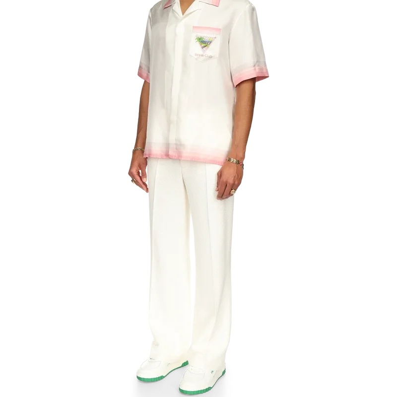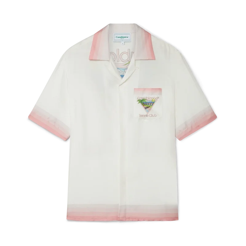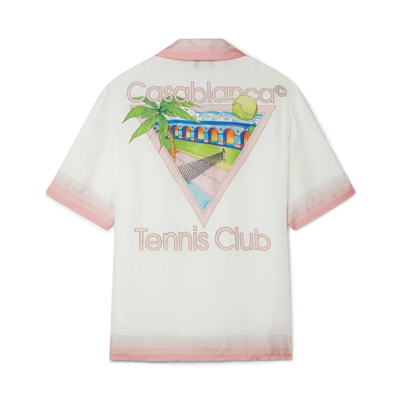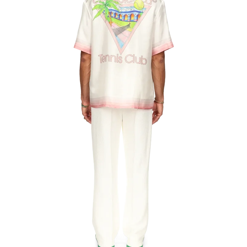 La camisa de seda Tennis Club Icon es un diseño estampado de manga corta que presenta el diseño característico de la casa reinterpretado para esta temporada, incorporando elementos del tenis, la naturaleza y la arquitectura. Confeccionada en tejido de satén de seda, esta prenda se completa con detalles de rayas degradadas en el cuello, los puños, el dobladillo y el bolsillo del pecho, cierre de botones y una etiqueta con la marca Casablanca. Diseñada para un ajuste relajado.