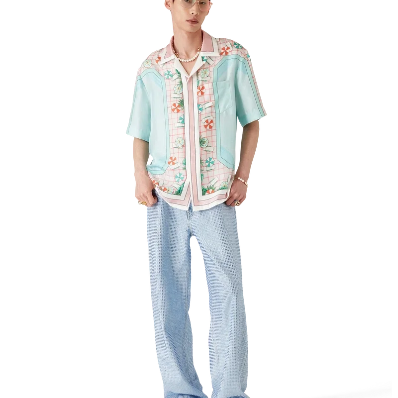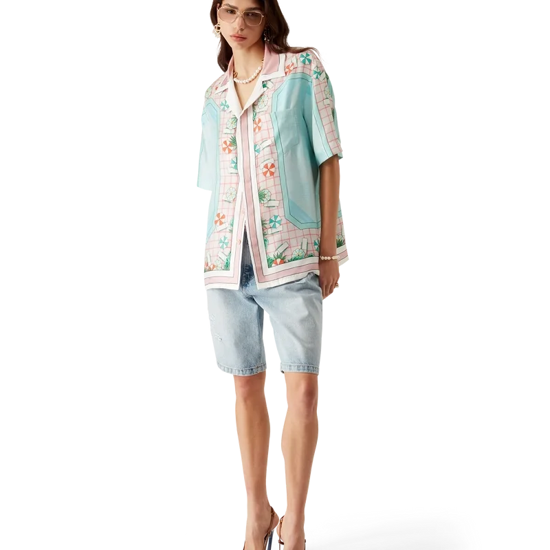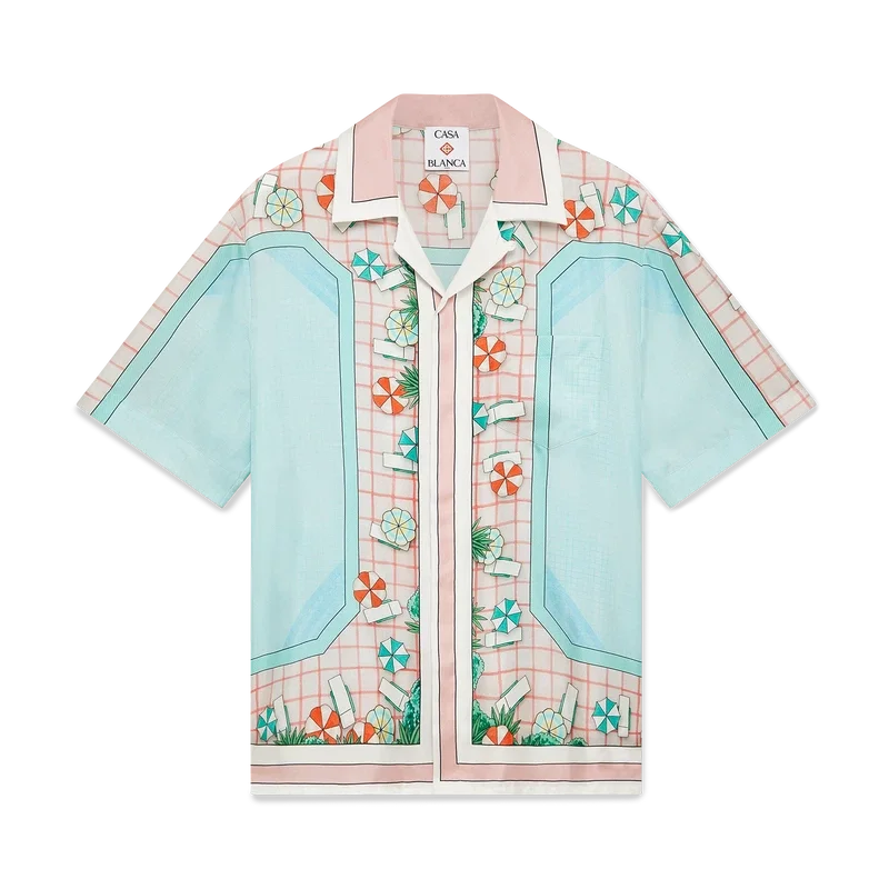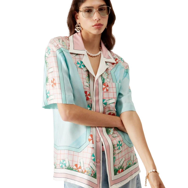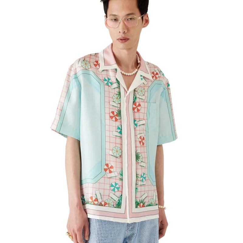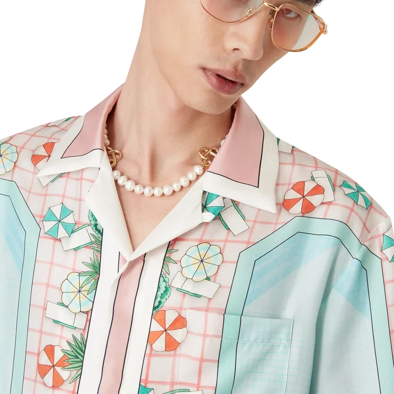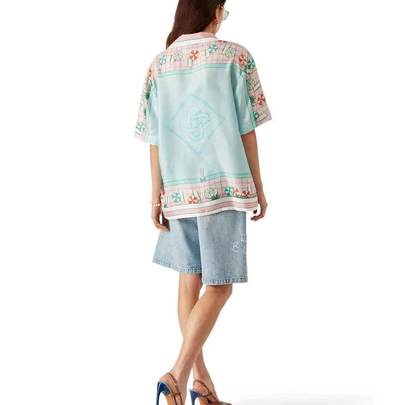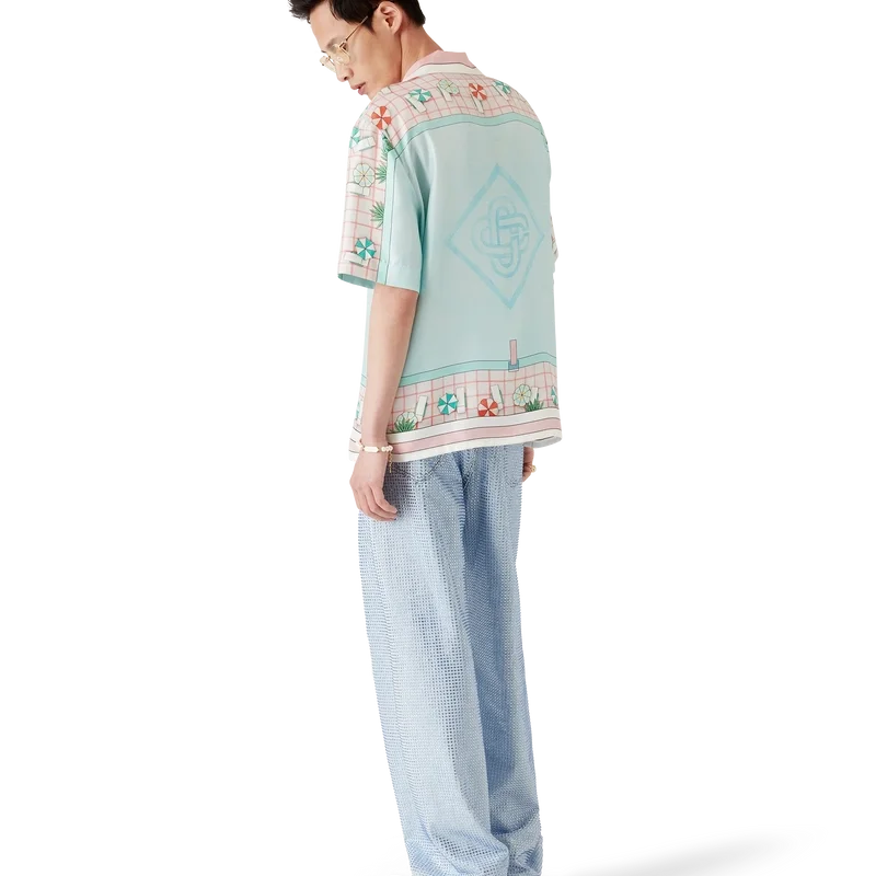 La camisa de seda de manga corta Copacabana presenta un diseño estampado en toda la prenda con el motivo característico de la casa, inspirado en la piscina de un hotel y el idealismo del viaje, y muestra un hermoso día en la piscina visto desde arriba, lo que ofrece una nueva perspectiva. Confeccionada en tejido de sarga de seda.