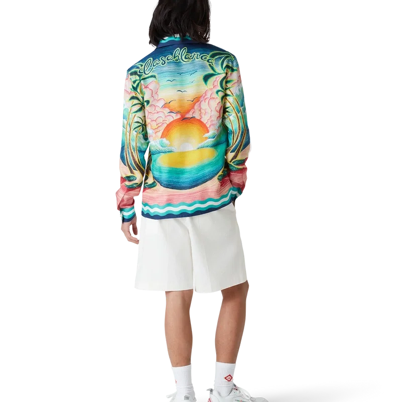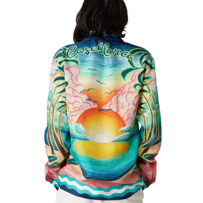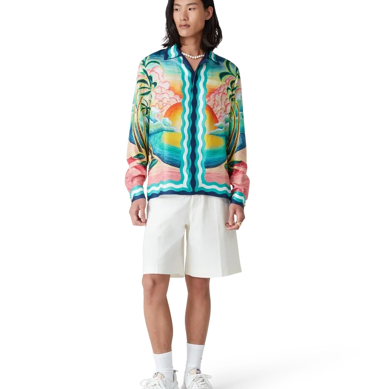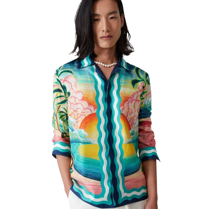 La camisa de seda Danse De La Mer es un diseño estampado integral de manga larga con escenas pintadas a mano creadas especialmente para la colección y confeccionada en tejido de seda. Se completa con cierre de botones, botones de corozo con el logotipo de CC entrelazado, botones esmaltados con borde dorado característicos y detalles de rayas inspiradas en las ondas de Memphis en el dobladillo, los puños, el cuello y la tapeta.