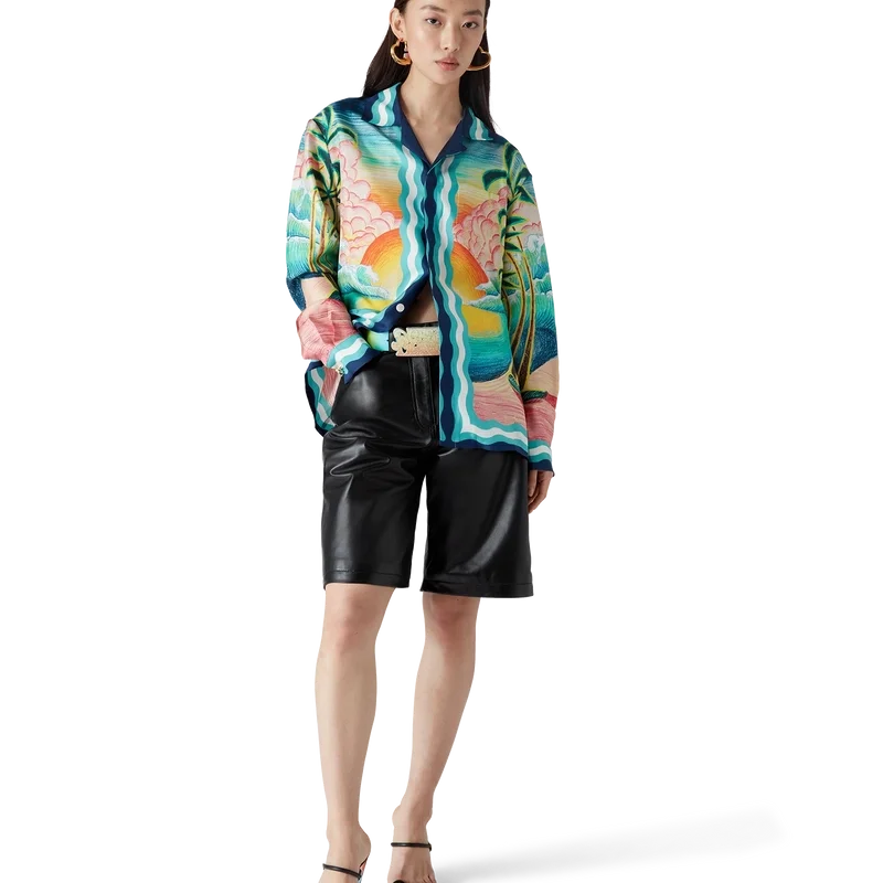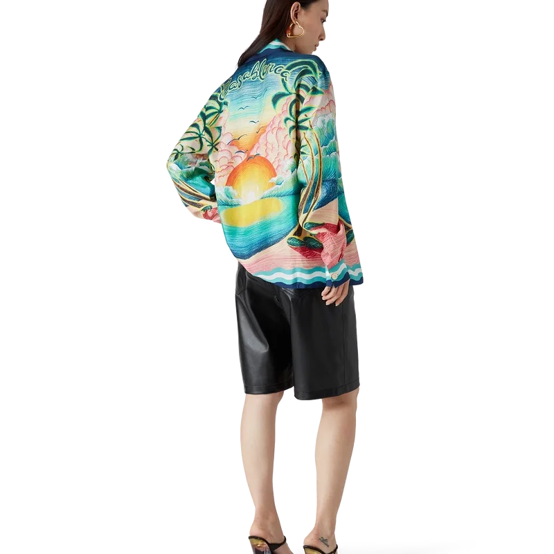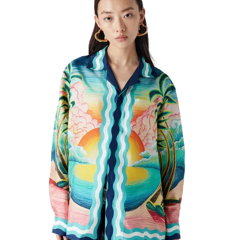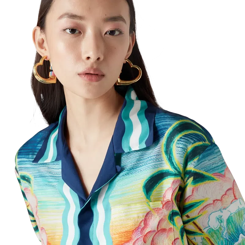 La camisa de seda Danse De La Mer es un diseño estampado integral de manga larga con escenas pintadas a mano creadas especialmente para la colección y confeccionada en tejido de seda. Se completa con cierre de botones, botones de corozo con el logotipo entrelazado de Cc, botones esmaltados con borde dorado característicos y detalles de rayas inspiradas en el diseño Memphis Wave en el dobladillo, los puños, el cuello y la tapeta.