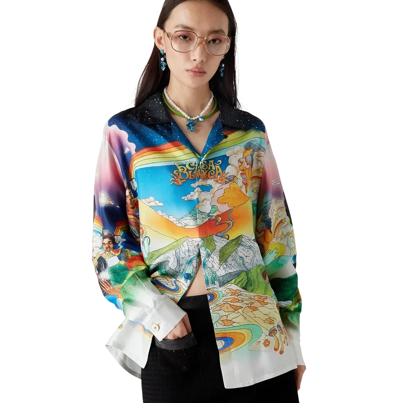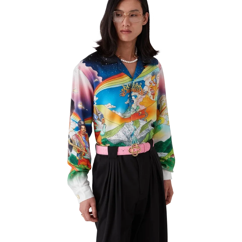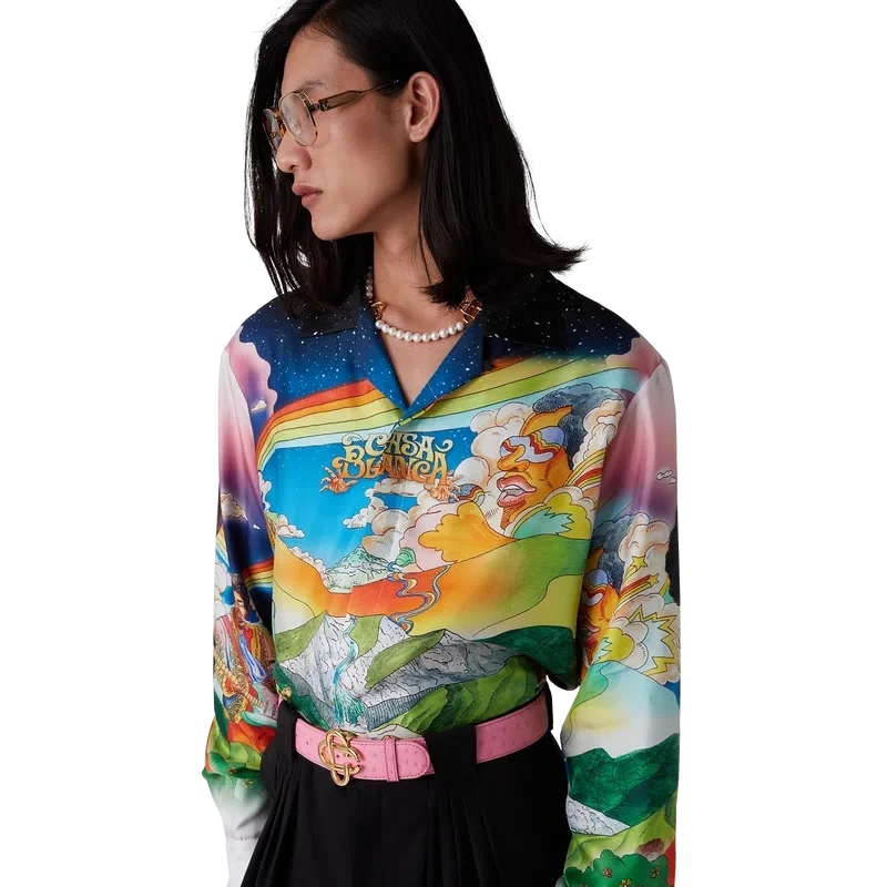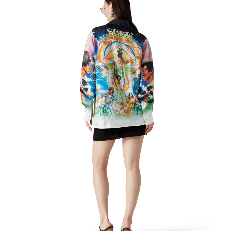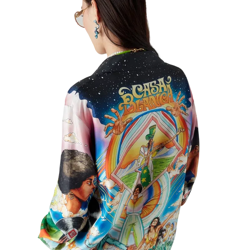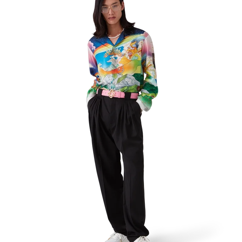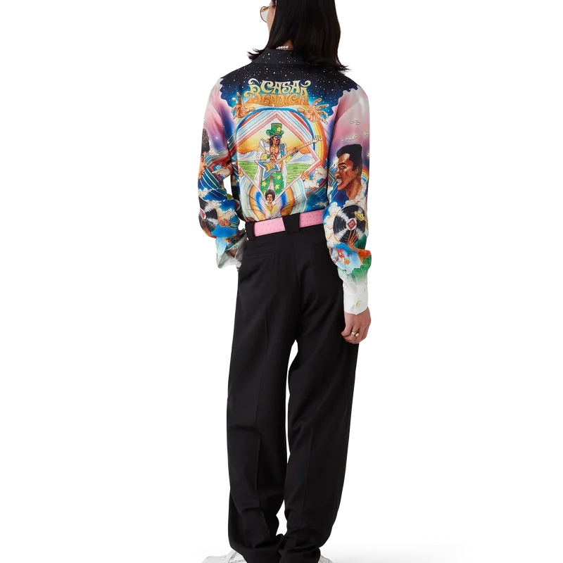 La camisa de seda La Musique es un diseño de manga larga confeccionado en tejido de sarga de seda estampado con el diseño de la temporada, que representa una oda a Bootsy Collins y a los icónicos discos de funk de los años 70. Se completa con cuello cubano, bolsillo en el pecho, cierre de botones ocultos con botones de corozo entrelazados y un botón esmaltado con borde dorado en cada puño.