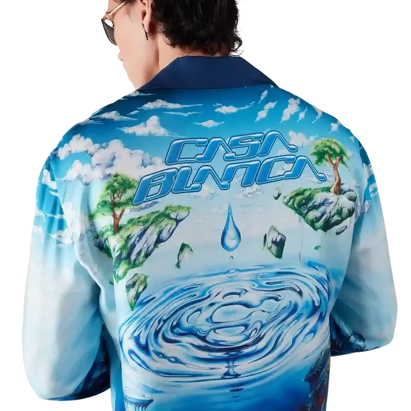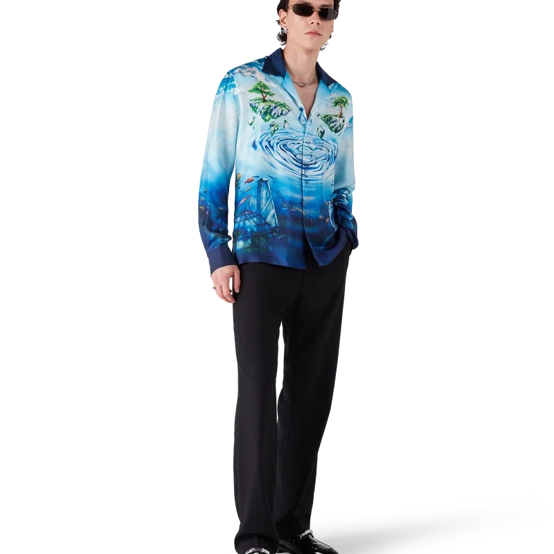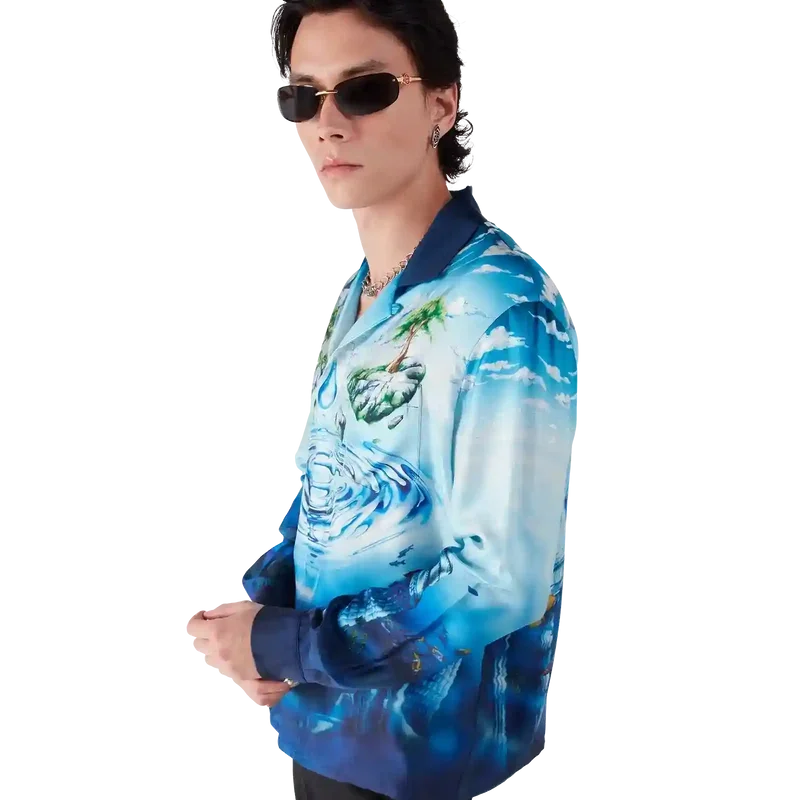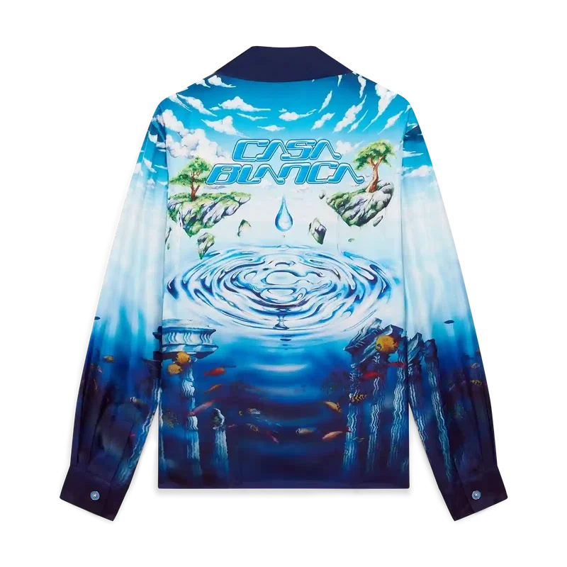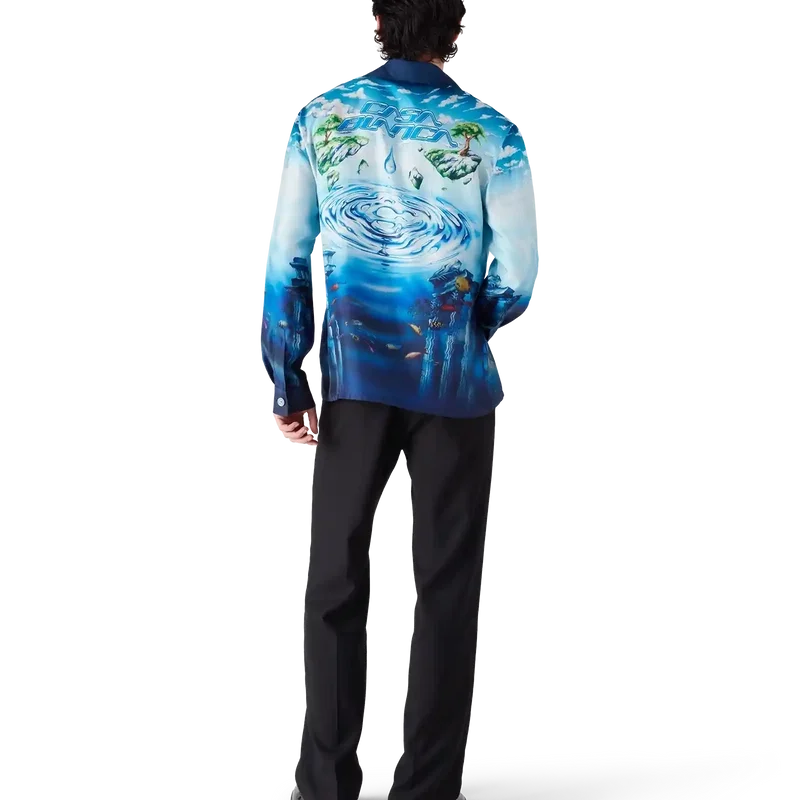 La camisa de manga larga Lost Atlantis presenta un diseño refinado con el estampado Water Atlantis de la casa, que combina arte digital y pintado a mano. El logotipo CC entrelazado se representa como ondas en el agua, mientras que la parte inferior de la camisa hace referencia a la mítica civilización de Atlantis, enriquecida con fauna exótica y tesoros ocultos. Se completa con cierre de botones, botones con el logotipo CC entrelazado y botones esmaltados con borde dorado característicos en los puños.