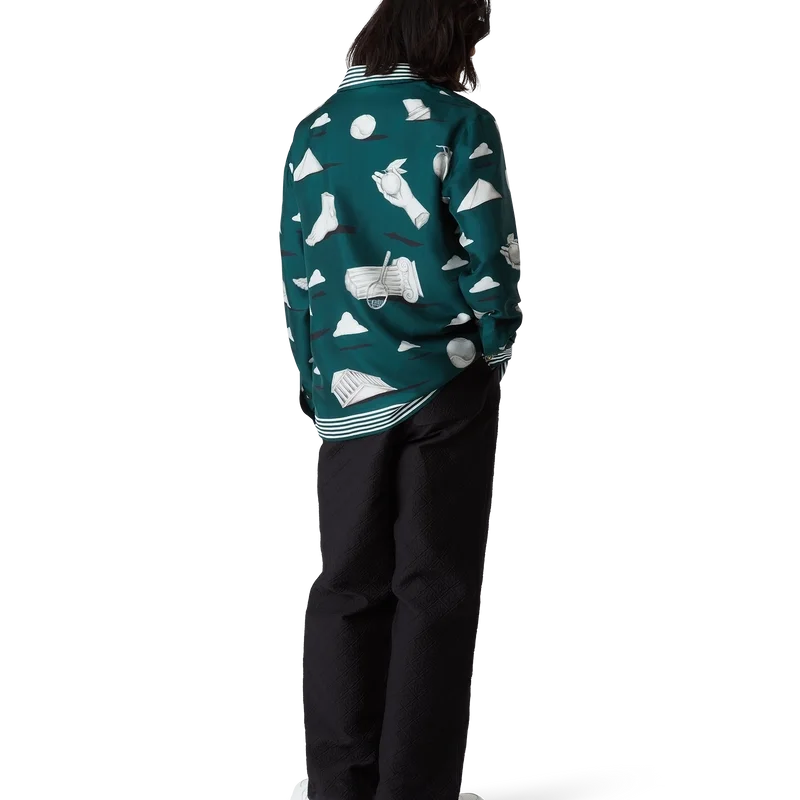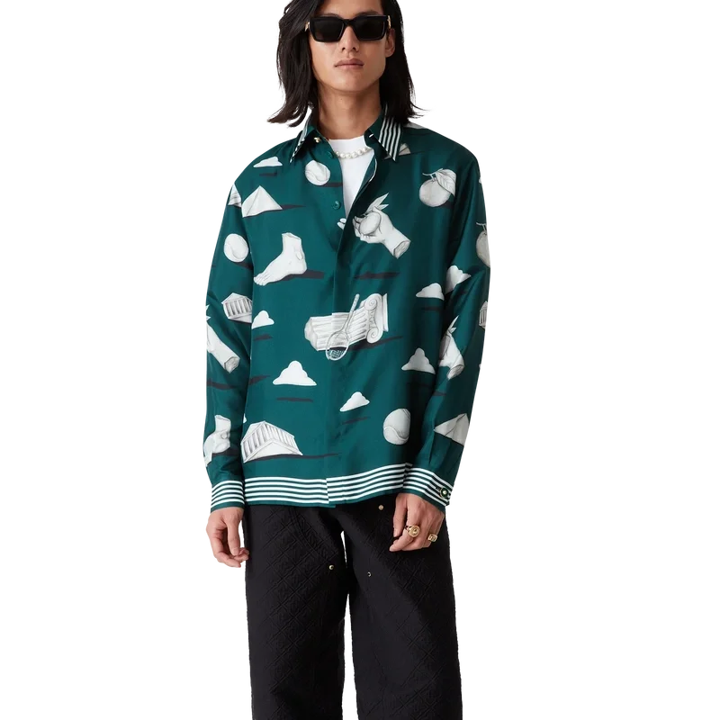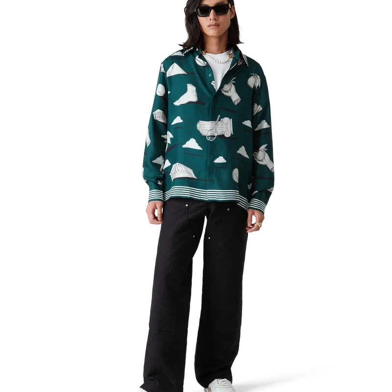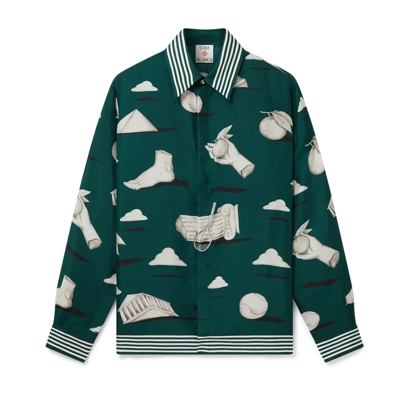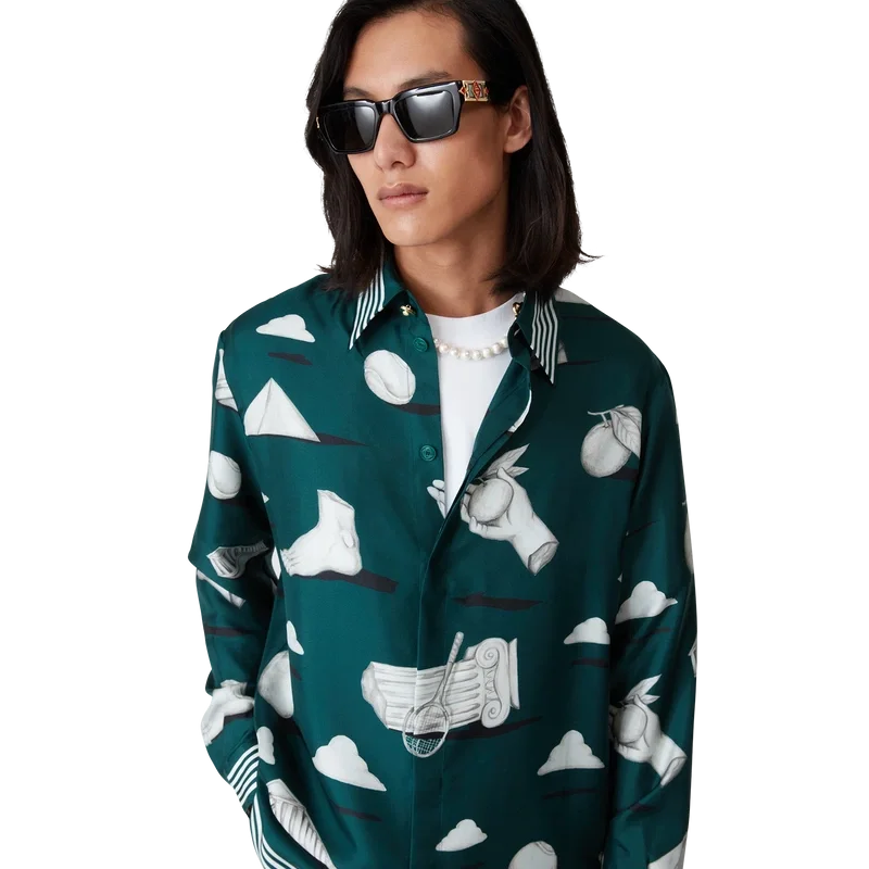 La camisa de seda Metaphysical presenta un diseño estampado en toda la prenda, confeccionada en tejido de sarga de seda, con ilustraciones que representan los elementos de diseño principales. Se completa con botones esmaltados con borde dorado característicos en los puños y el cuello, cierre frontal con botones entrelazados de corozo con las iniciales «CC», cuello en pico y detalles de rayas en el cuello, los puños y el dobladillo.