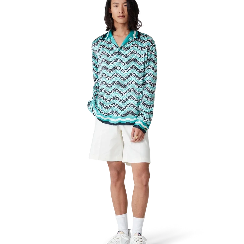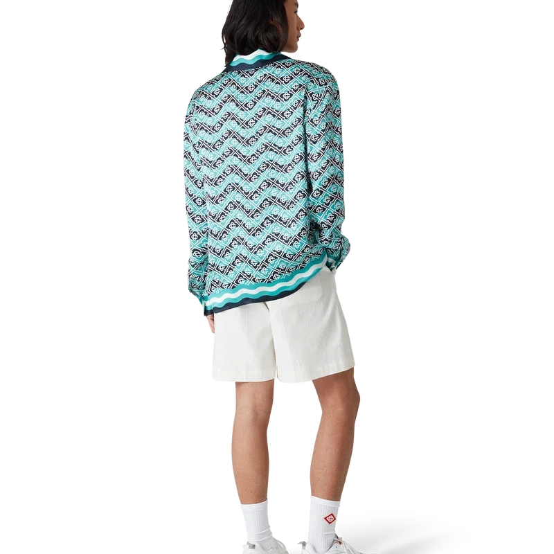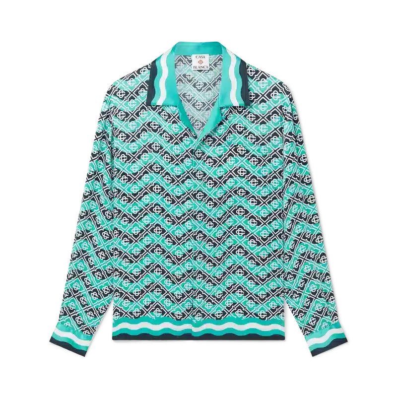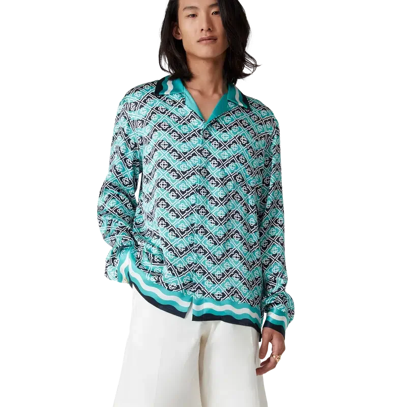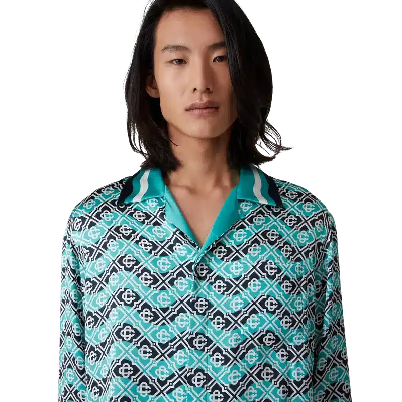 La camisa de seda Monogram Wave es un modelo con estampado integral del monograma característico de la casa, confeccionado en tejido de satén de seda. Se completa con cierre frontal de botones de corozo con las iniciales CC entrelazadas, botones esmaltados con borde dorado en los puños, cuello cubano y detalle de rayas inspiradas en la ola de Memphis en el cuello, los puños y el dobladillo.