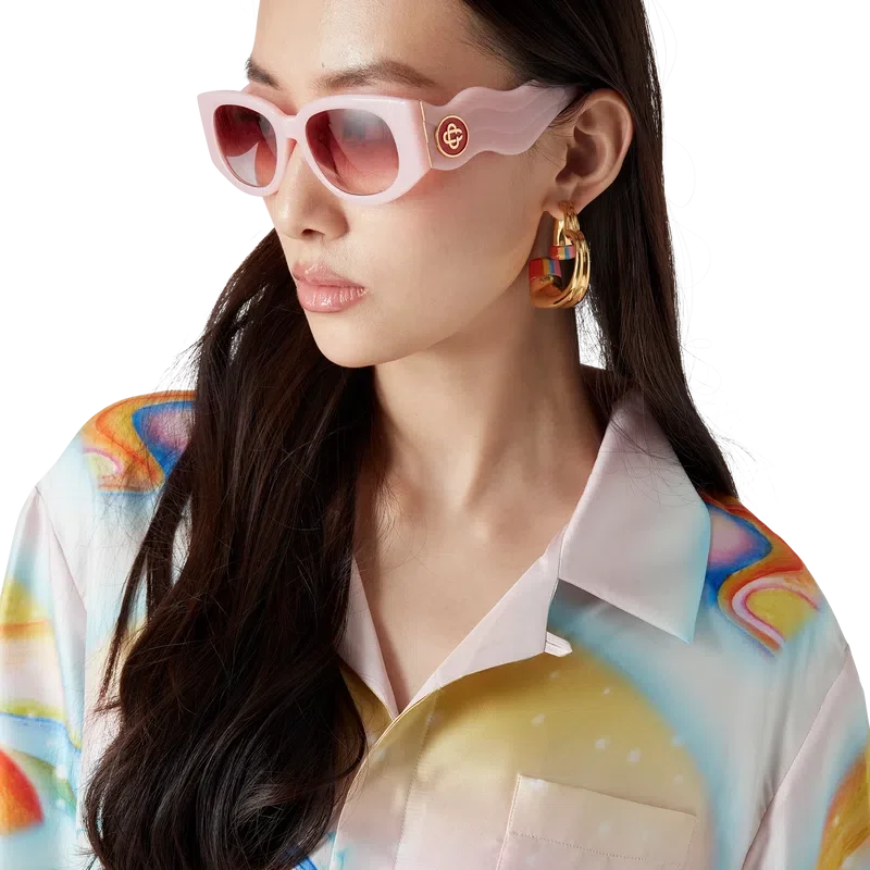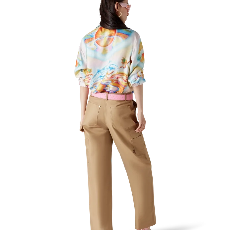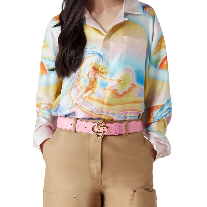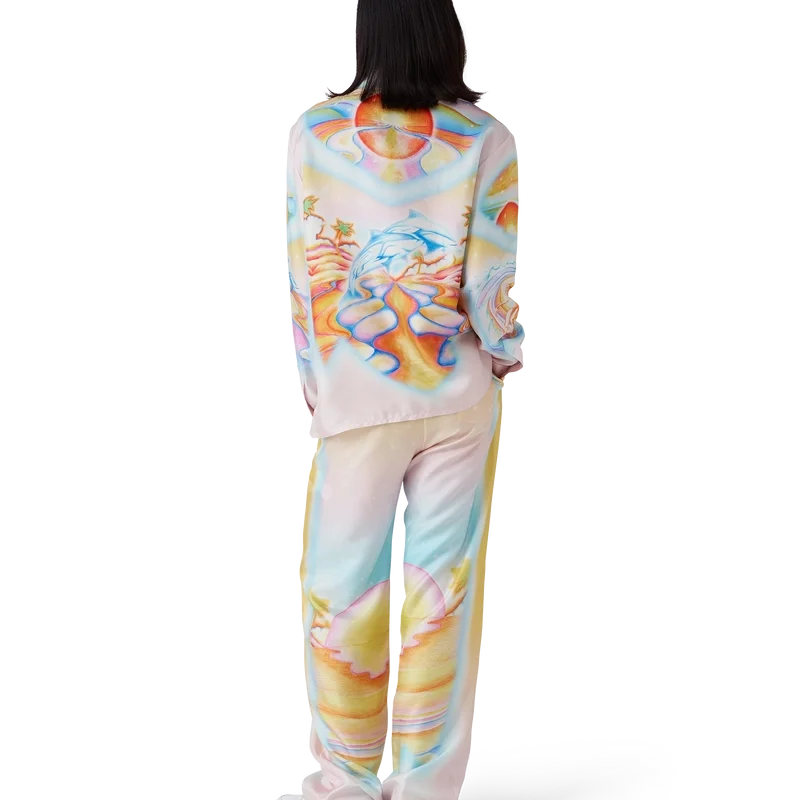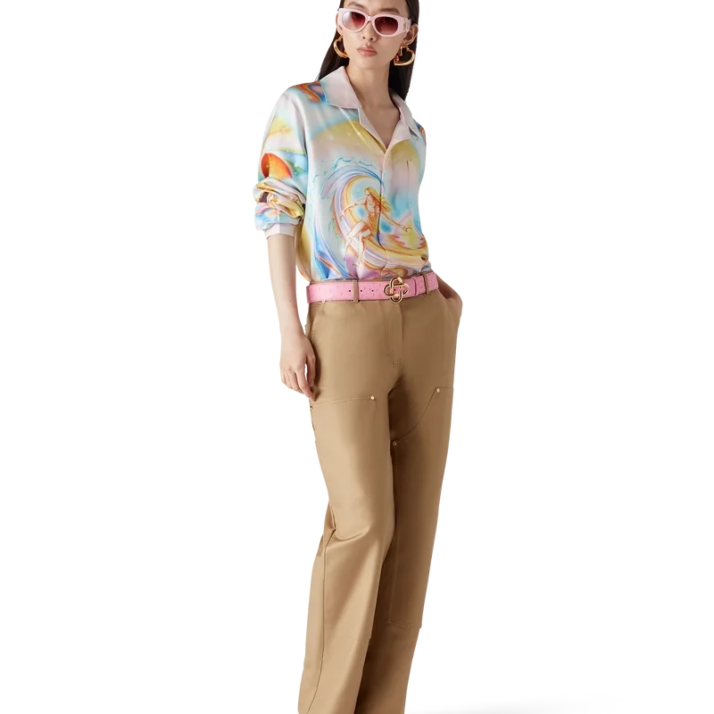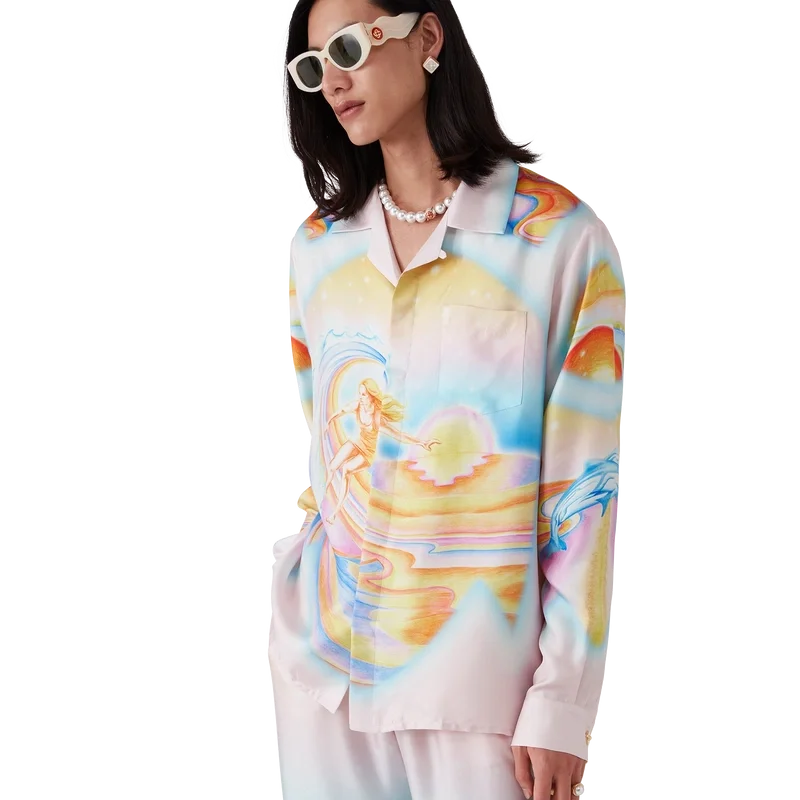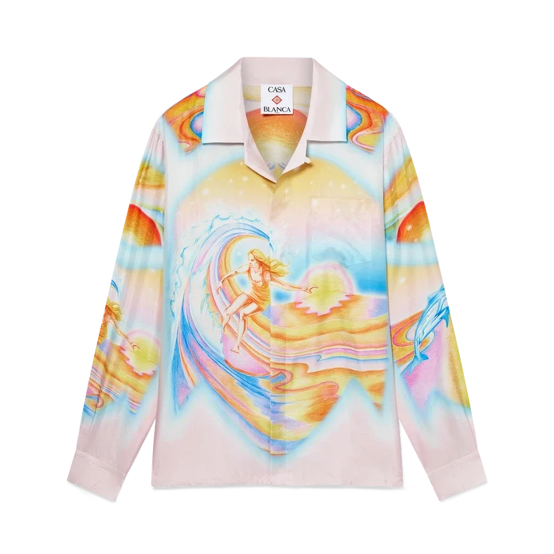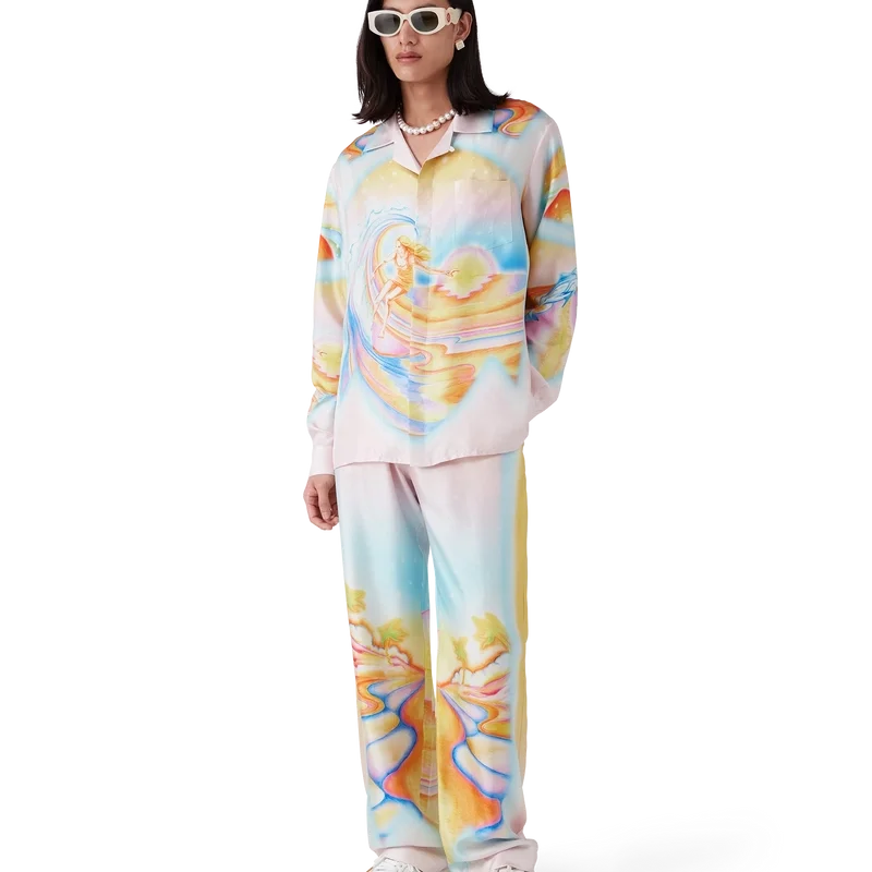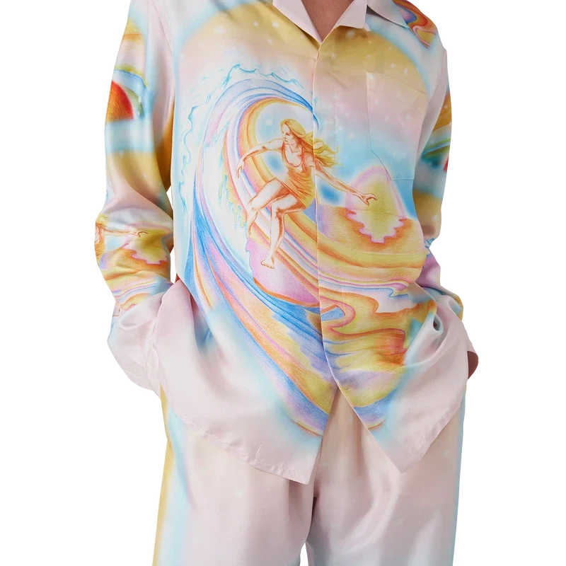 La camisa de seda Psychedelic Nirvana presenta un diseño estampado en toda la superficie, confeccionada en tejido de sarga de seda con ilustraciones inspiradas en las tablas de surf aerografiadas de la California de los años 70, utilizando colores pastel que le dan al estampado una sensación casi onírica e idealista. Acabada con cuello cubano, bolsillo en el pecho, cierre de botones ocultos con botones de corozo entrelazados «CC» y un botón esmaltado con borde dorado en cada puño.