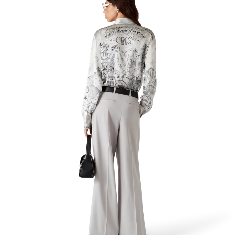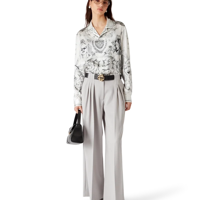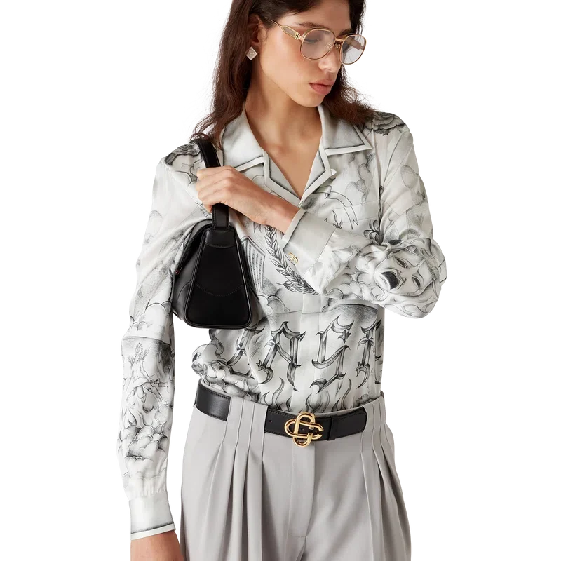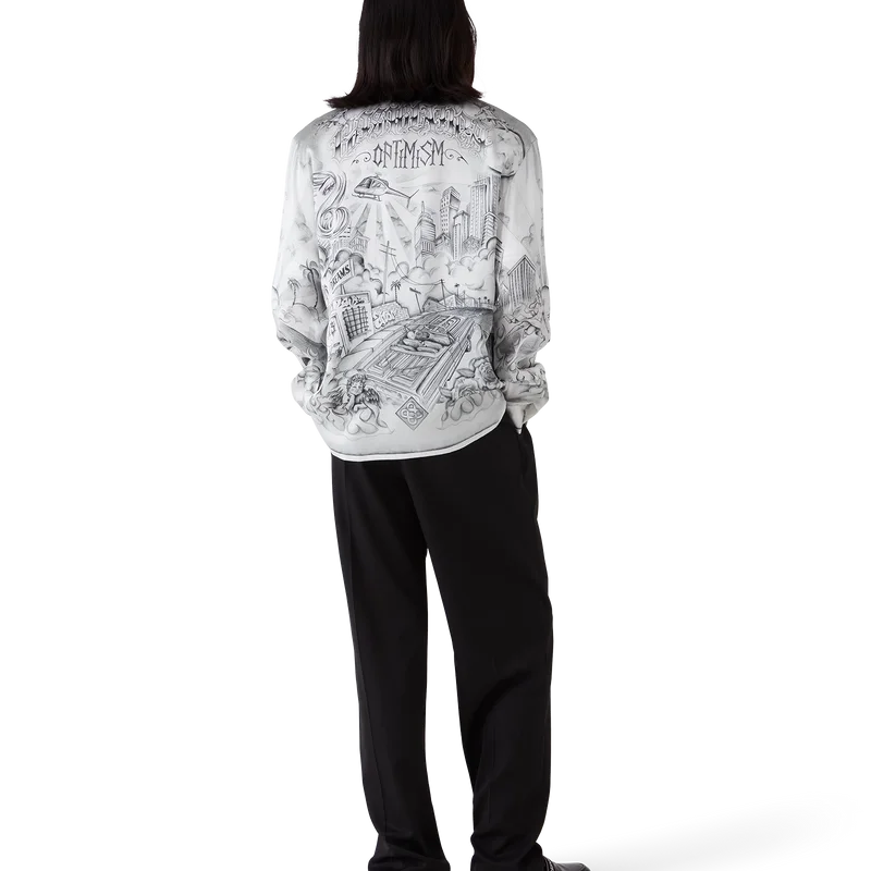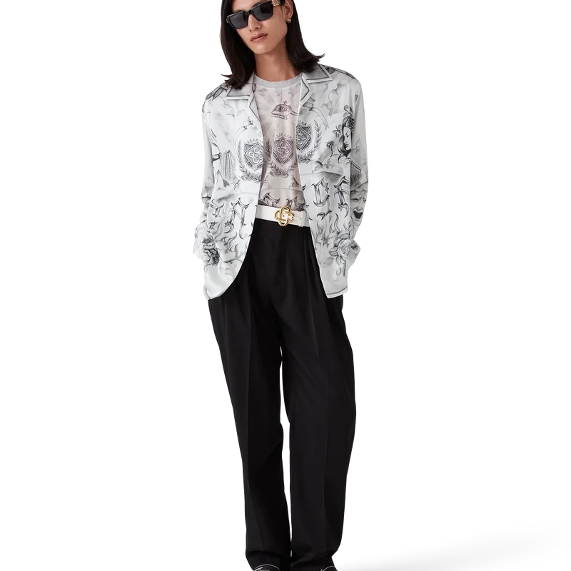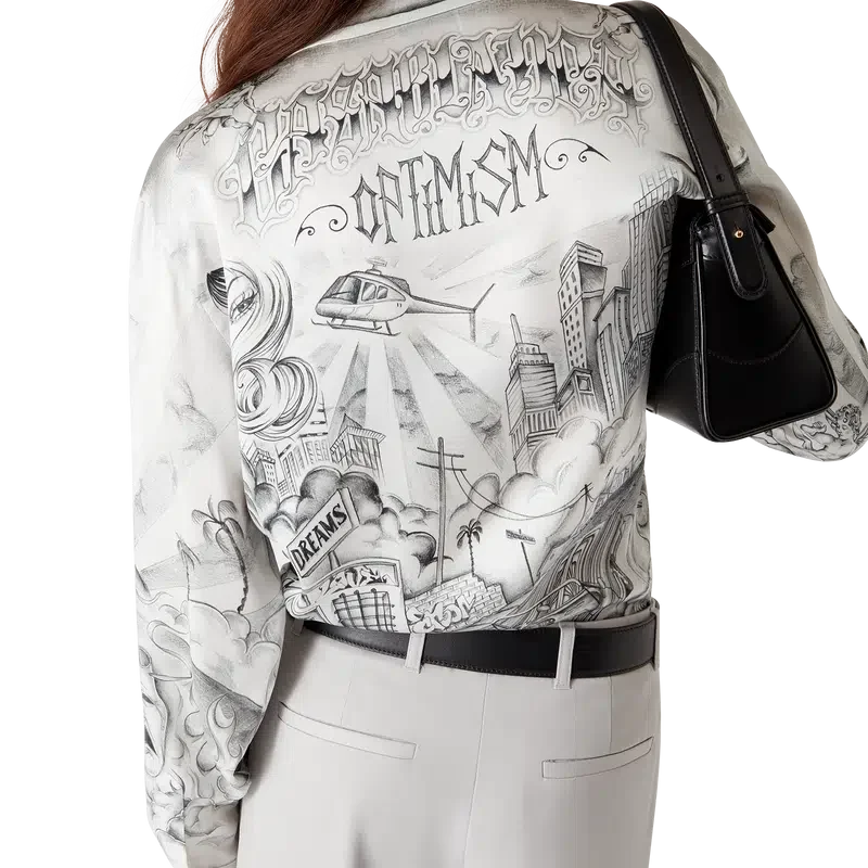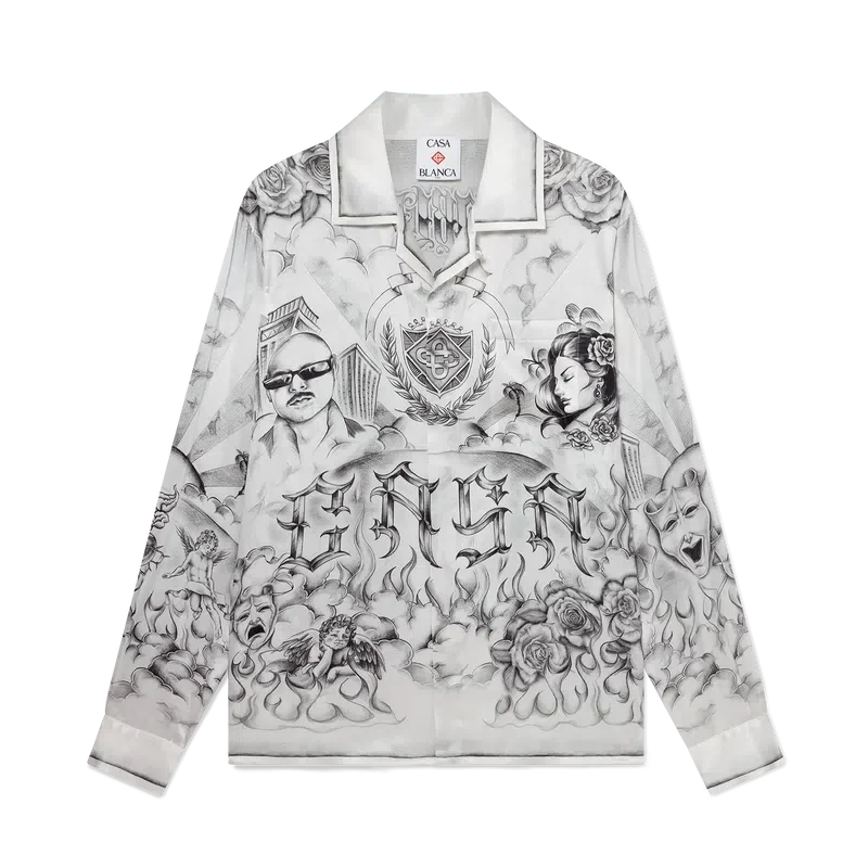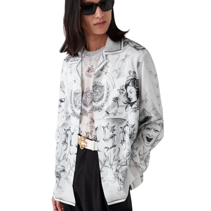 La camisa de seda Tattoo es un diseño de manga larga confeccionado en tejido de satén de seda estampado con el diseño artístico de la temporada, inspirado en el ambiente de La Neighbourhood y haciendo referencia a la rica cultura del tatuaje y a las tintas grises y negras que se utilizan en estos tatuajes. Se completa con cuello cubano, bolsillo en el pecho, cierre de botones ocultos con botones de corozo entrelazados «CC» y un botón esmaltado con borde dorado en cada puño.