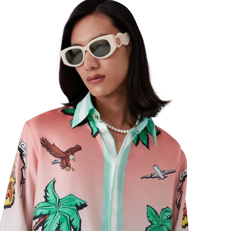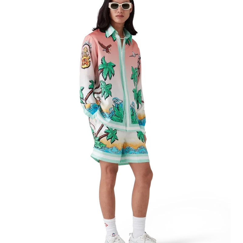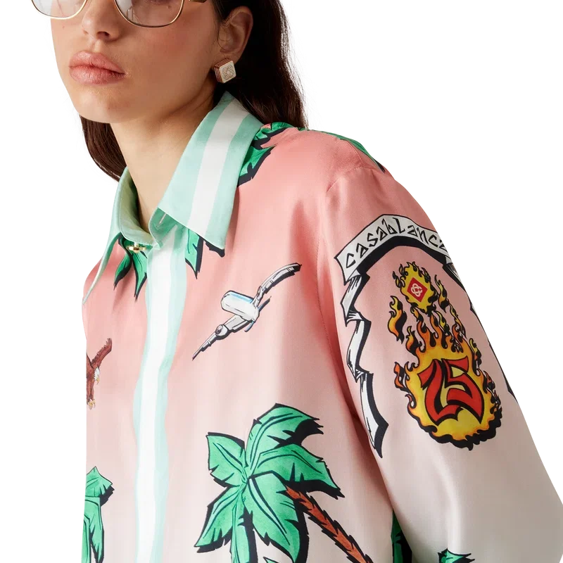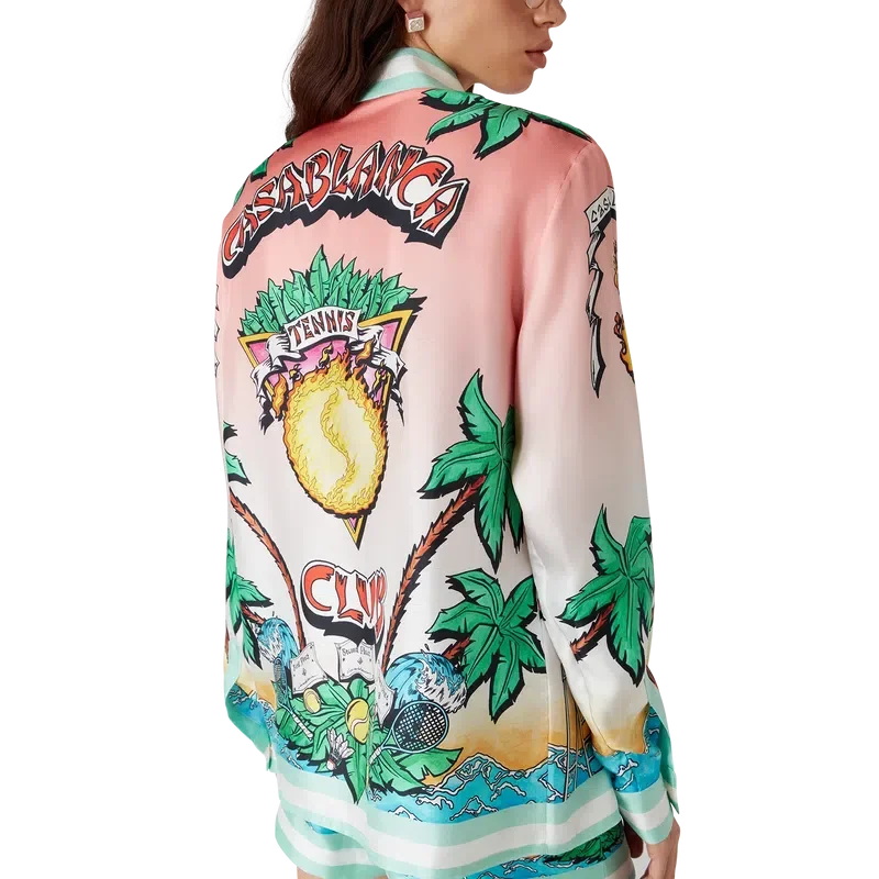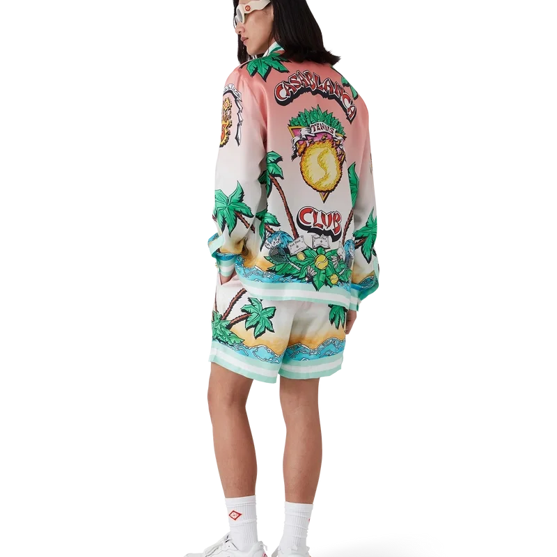 La camisa de seda Tennis Club presenta un diseño estampado en toda la prenda con ilustraciones que reinterpretan el estampado Tennis Club de la casa con una temática de surf, al estilo de un boceto gráfico dibujado con rotuladores, confeccionada en tejido de sarga de seda. Acabada con cuello cubano, bolsillo en el pecho, cierre de botones ocultos con botones de corozo entrelazados «CC» y un botón esmaltado con borde dorado en cada puño.