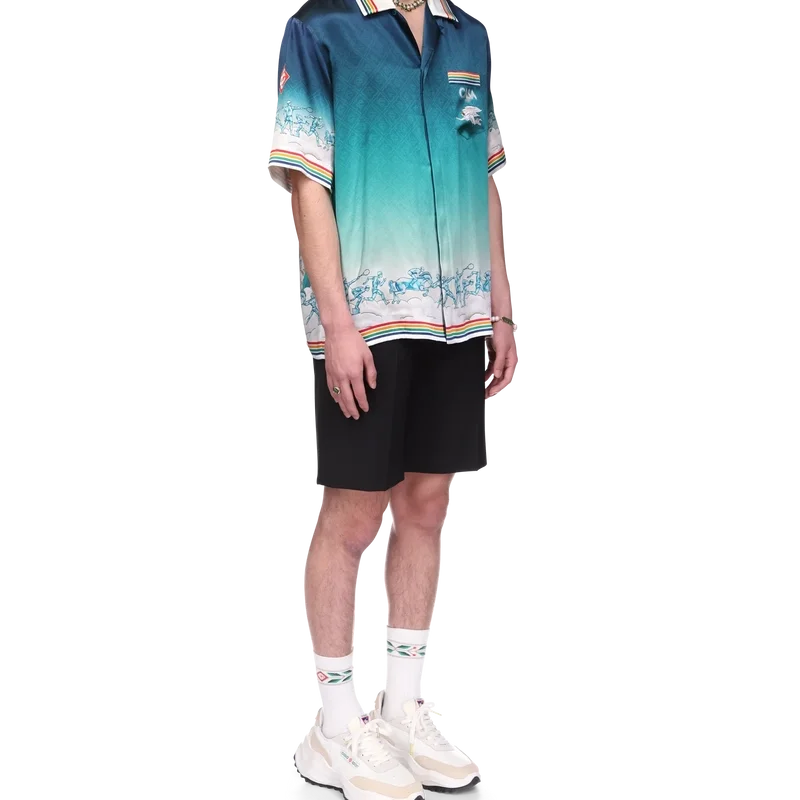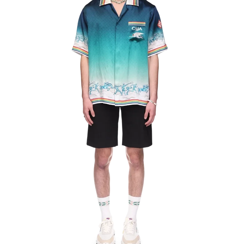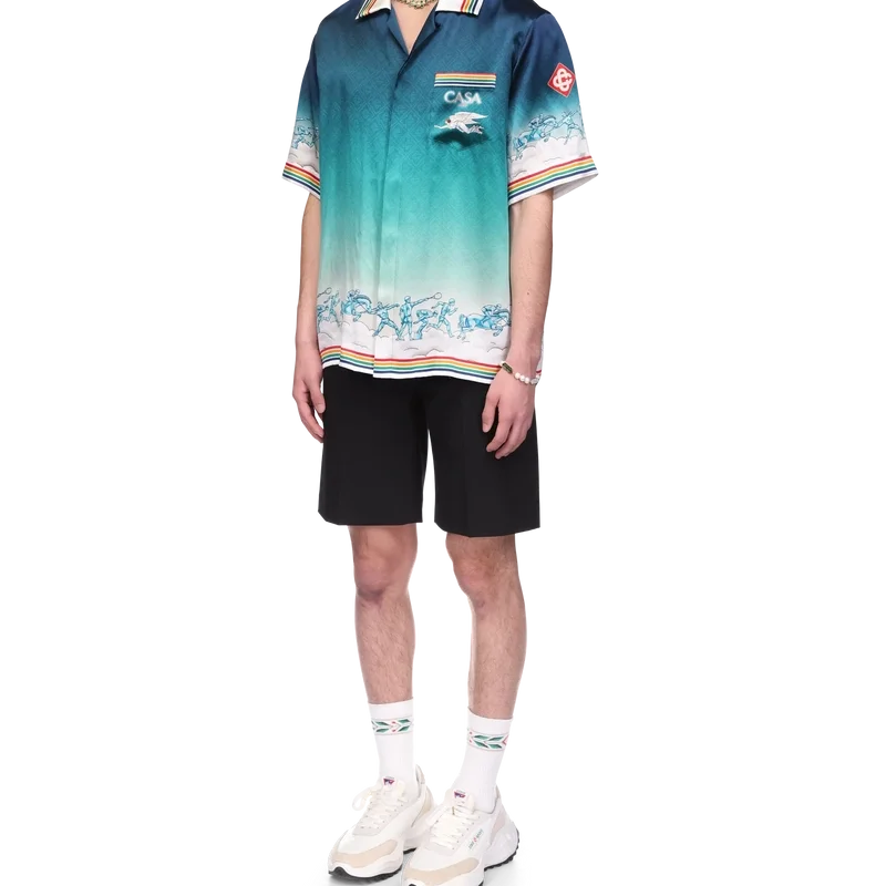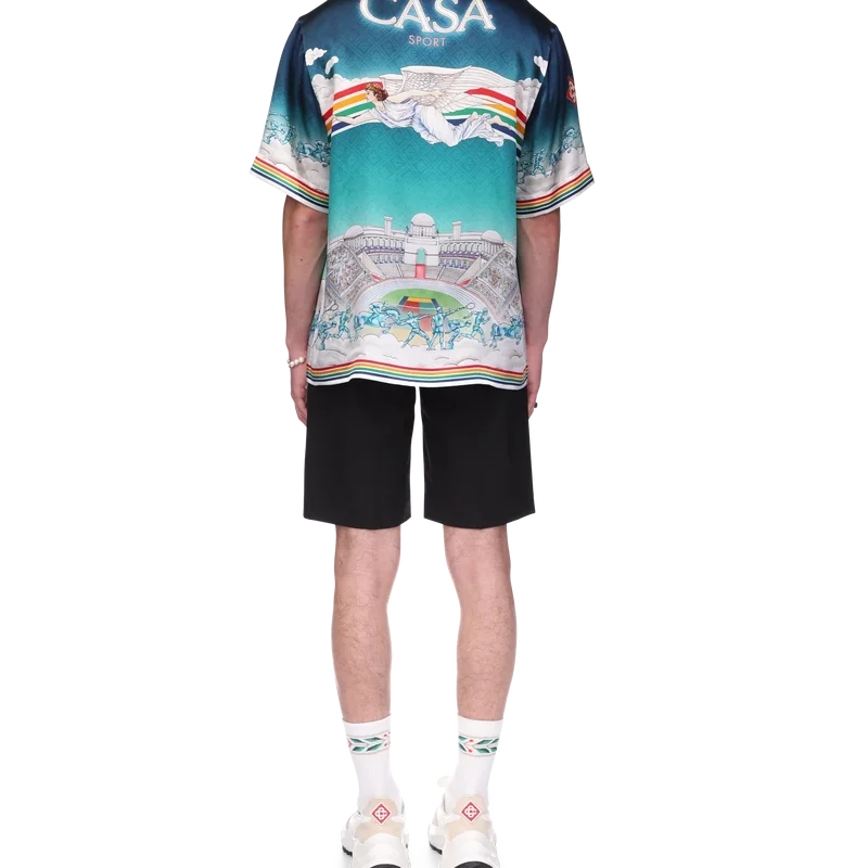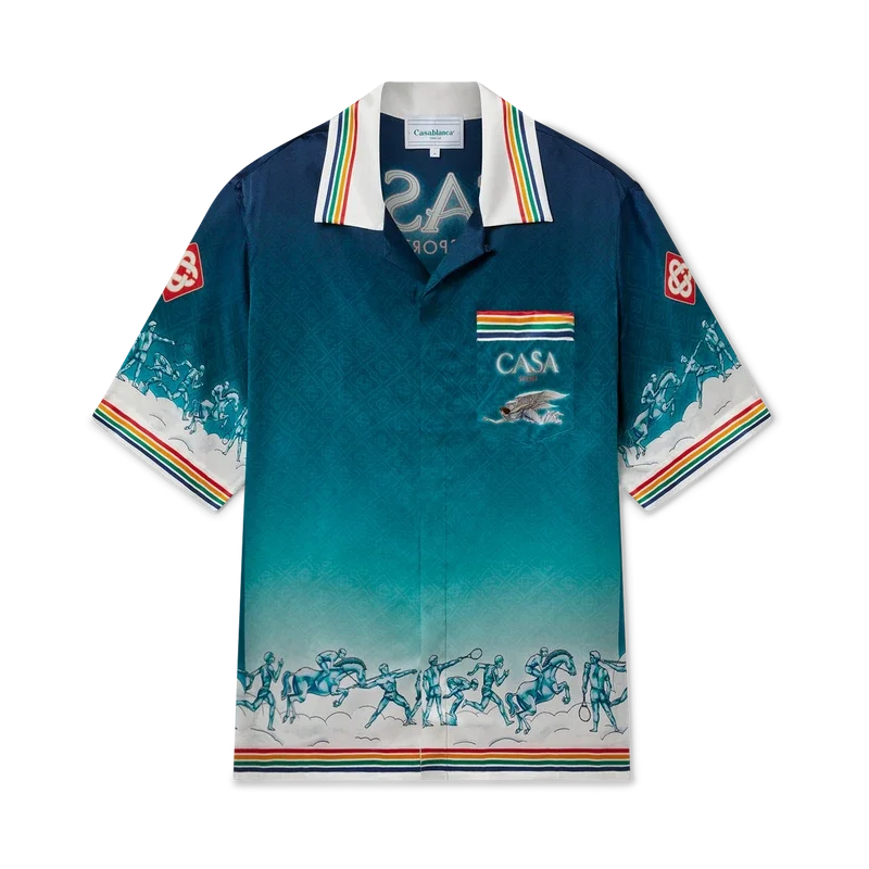 La camisa de seda La Deesse Du Stade es un diseño estampado de manga corta confeccionado en tejido de satén de seda con degradado de monogramas que presenta el diseño artístico de temporada de la casa. Se completa con cuello cubano, bolsillo en el pecho, cierre de botones, botones de corozo con las iniciales «CC» entrelazadas y detalles de rayas multicolores en el cuello, los puños, el dobladillo y el bolsillo del pecho.