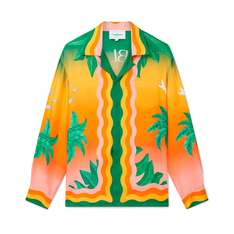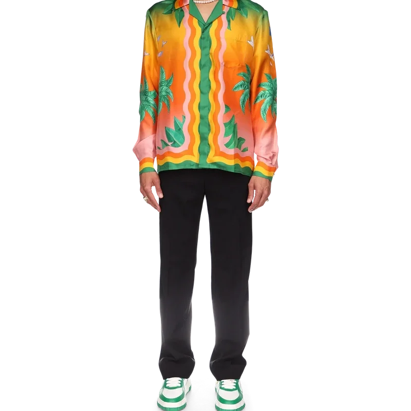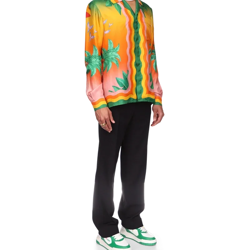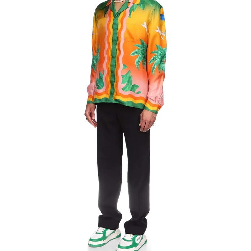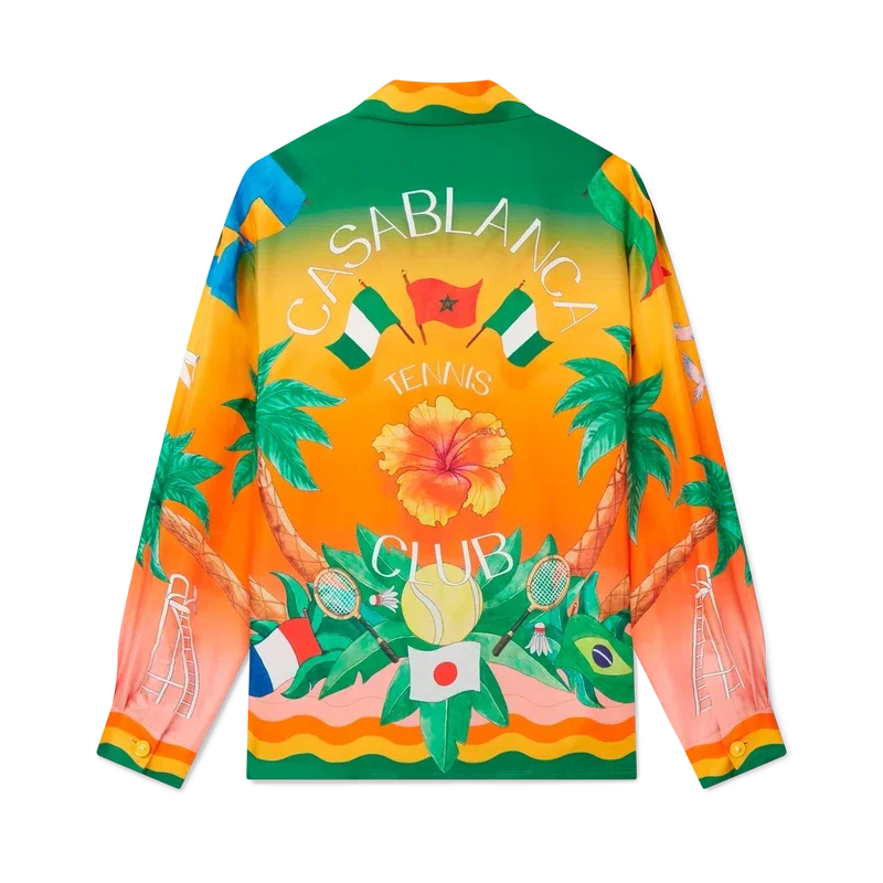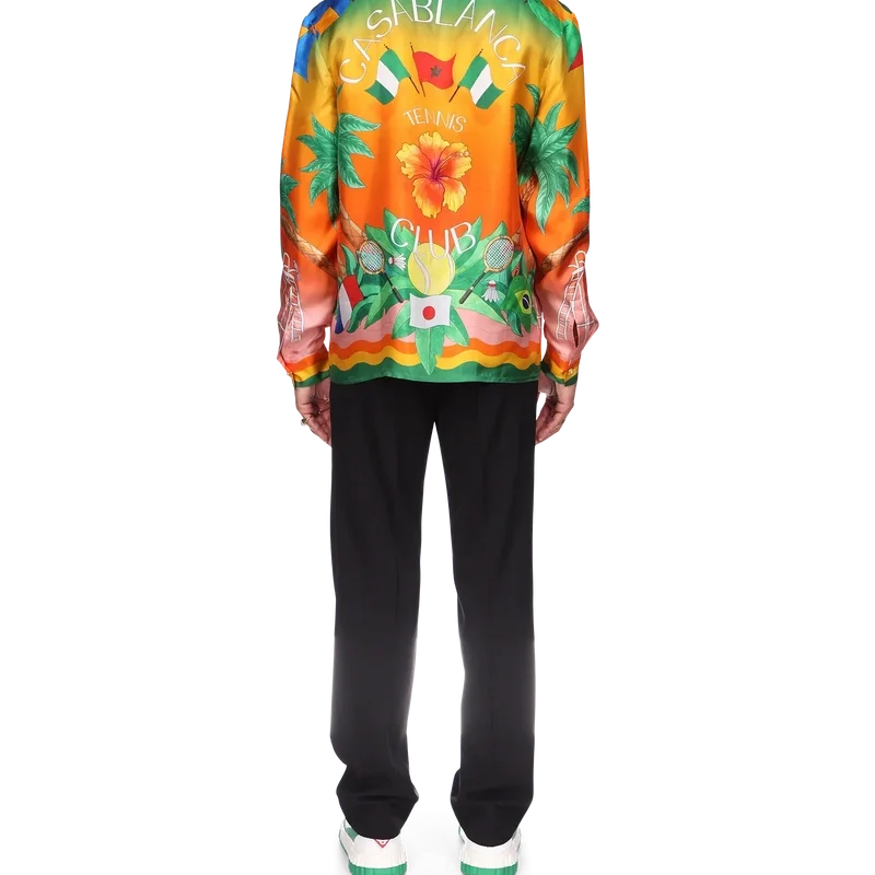 La camisa de seda Tennis Club En Fleur es un diseño estampado integral de manga larga que incorpora el degradado característico de la casa, que reaparece en nuevas combinaciones de colores inspiradas en Nigeria, con elementos de diseño clave como una flor de hibisco en la espalda. Se completa con los detalles inspirados en la ola de Memphis de la casa en el cuello, los puños, el dobladillo y la tapeta, y botones de perla con borde dorado.<!–