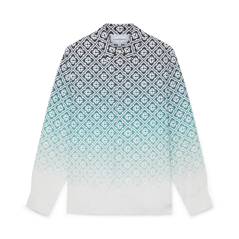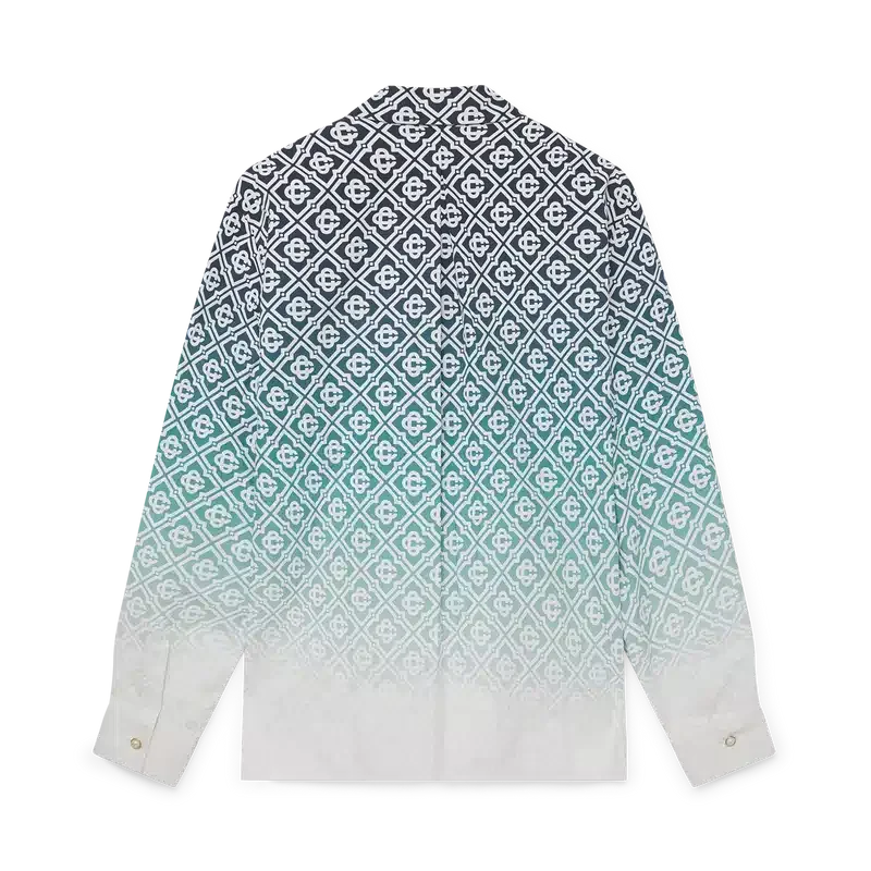 La camisa Monogram con degradado medianoche es un diseño de manga larga confeccionado en tejido Monogram de algodón acolchado con degradado. Se completa con cuello en punta, cierre con botones y botones de perla con borde dorado.