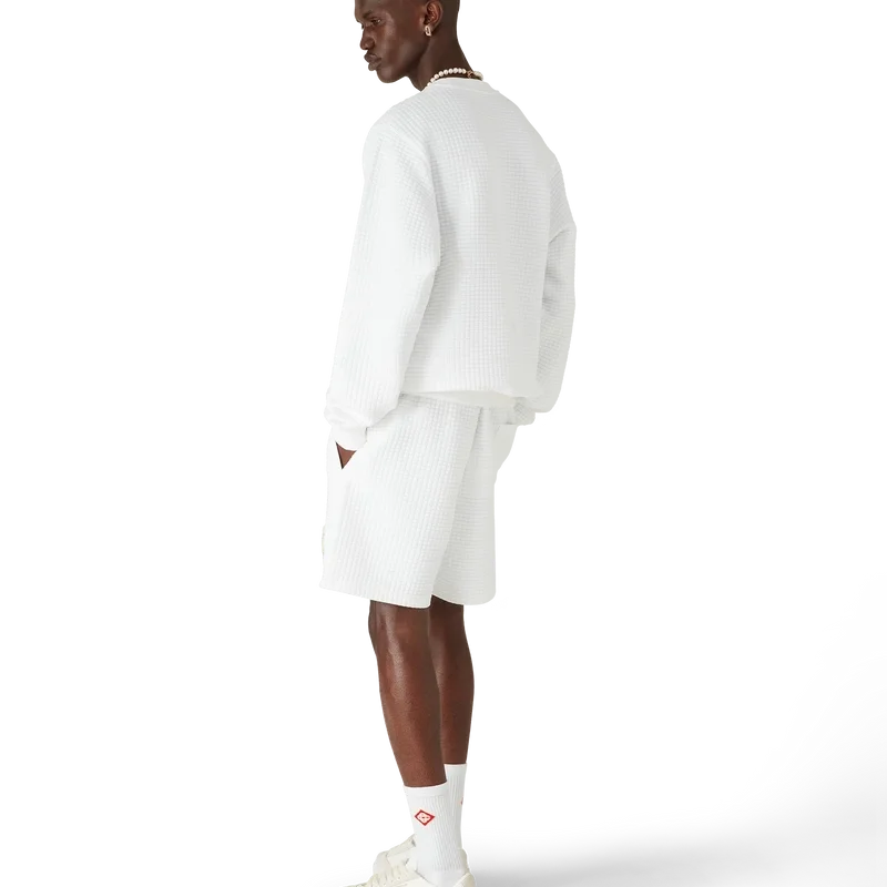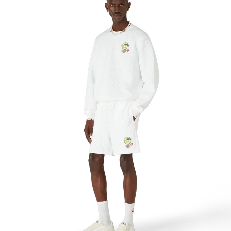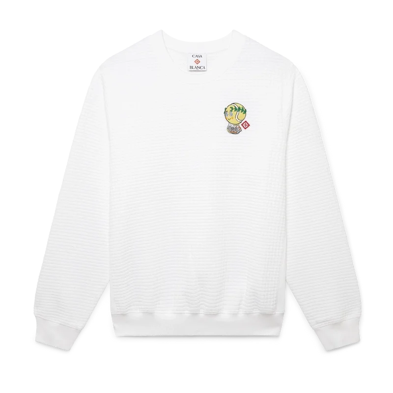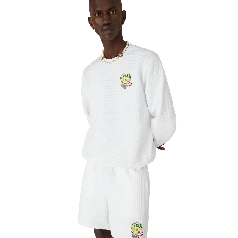 La sudadera acolchada con la mascota del tenis es un diseño bordado de manga larga, confeccionado con un tejido acolchado con patrón de cuadrícula que presenta un diseño de temporada de la pelota de tenis kawaii; este personaje es una parte fundamental de nuestro universo. Incorpora elementos como la hoja de laurel, las zapatillas Atlantis, la raqueta y los ojos kawaii. Hemos elegido a este personaje como motivo central de todos los modelos para hombre de la colección. Se completa con un clásico cuello redondo.<!–