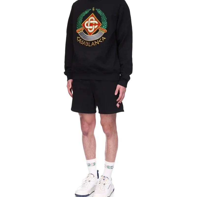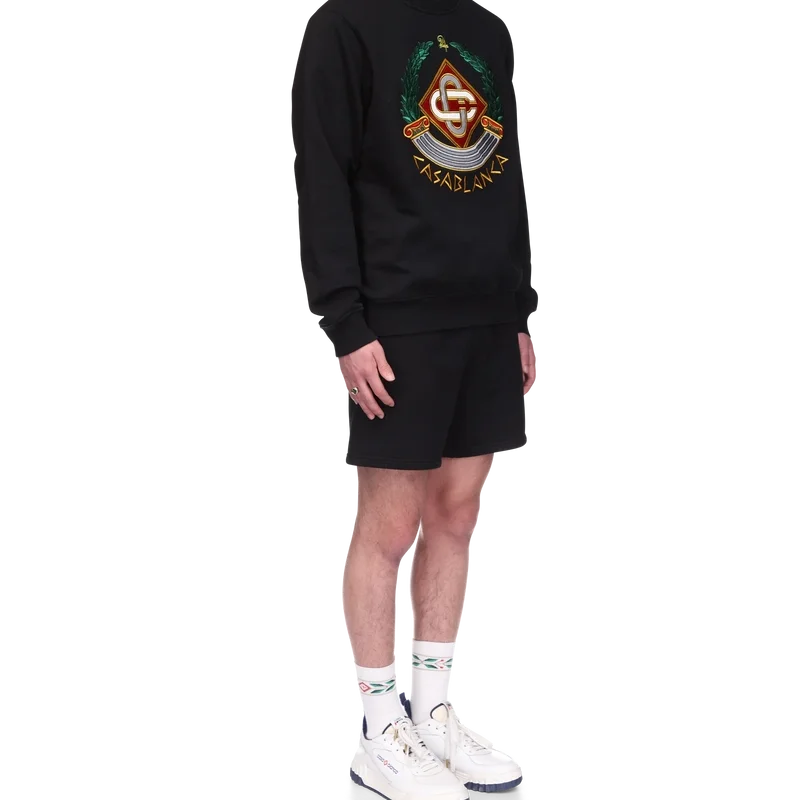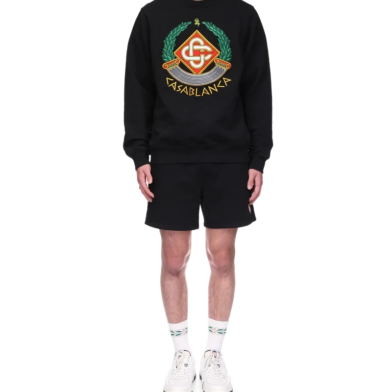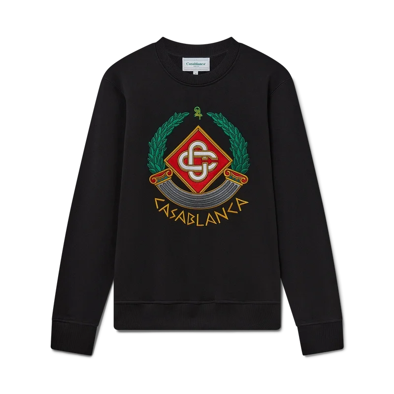 La sudadera Casa Crest es un diseño de manga larga confeccionado en tejido de algodón orgánico que presenta el juego de la casa con la columna como iconografía de Grecia y nuestra versión de un logotipo deformado, creando una imagen de lo que podría haber sido un escudo de casa en la Antigüedad. Se completa con el logotipo entrelazado de las letras C, característico de la casa, el texto «Casablanca» escrito en estilo griego antiguo, un cuello redondo clásico y puños y dobladillo acanalados.