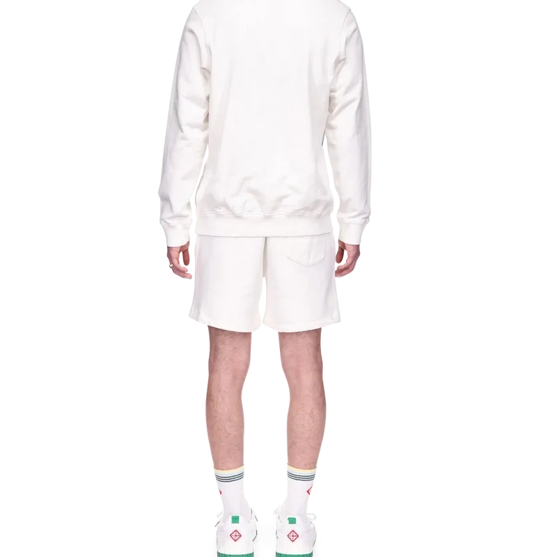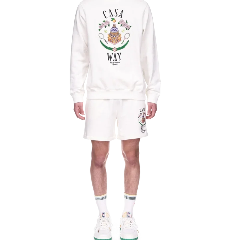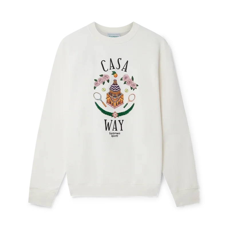 La sudadera unisex Casa Way en color blanco roto presenta ilustraciones bordadas de equipamiento deportivo y detalles florales. Confeccionada en algodón orgánico, este modelo es un clásico de cuello redondo y manga larga, y ha sido diseñado para un ajuste holgado.