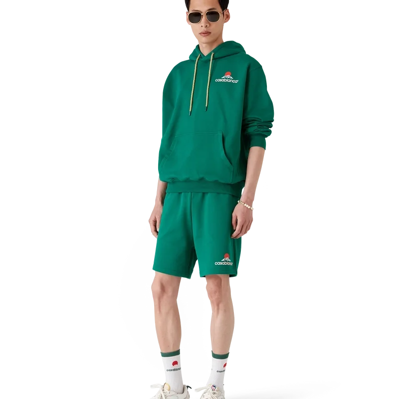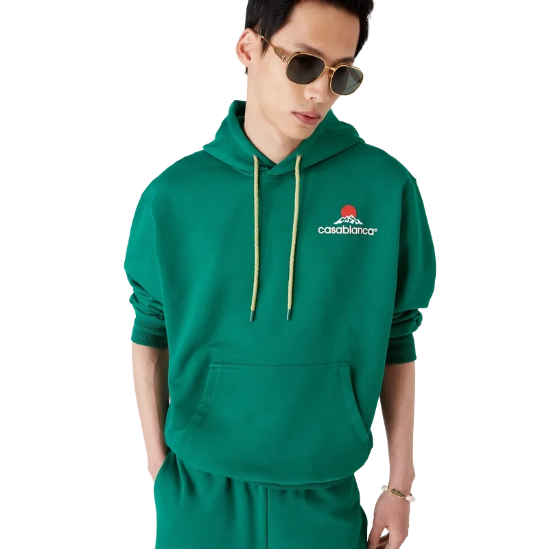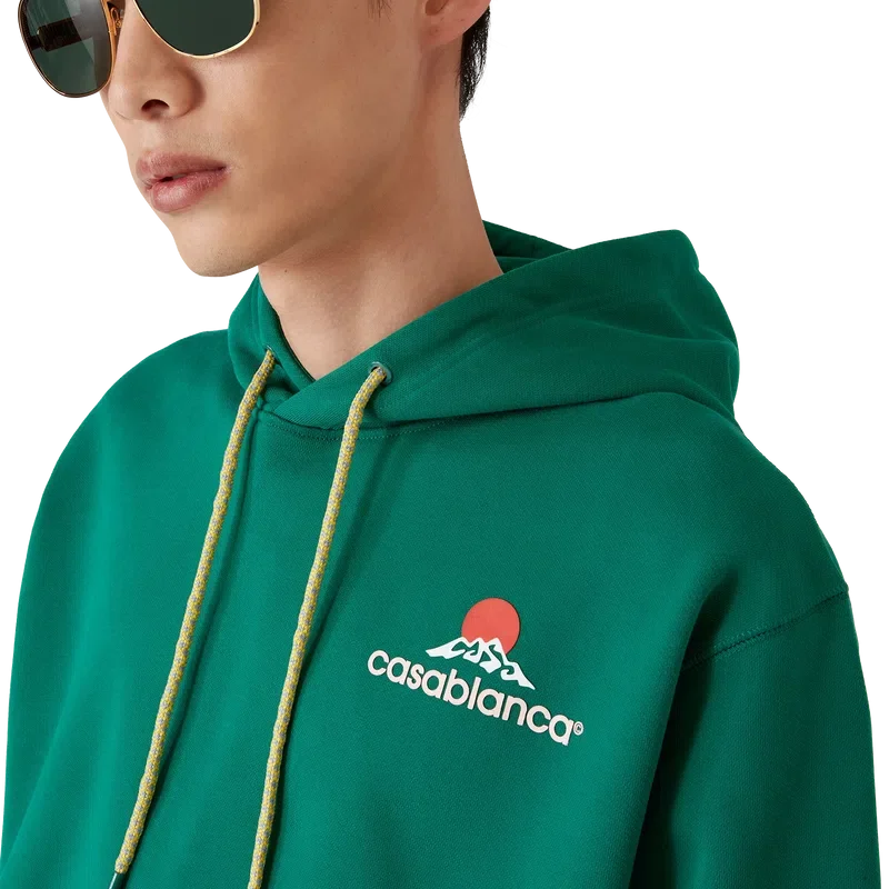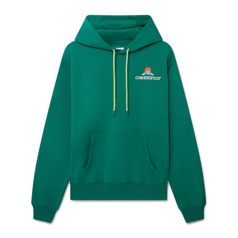 La sudadera con capucha Montagne es un diseño de manga larga confeccionado con tejido de algodón orgánico y presenta el diseño de temporada de la marca: un logotipo que a primera vista parece una montaña, pero que al mirarlo más de cerca se lee como «Casa». Acabada con capucha con cierre de cordón, bolsillo canguro delantero, puños y dobladillo acanalados.