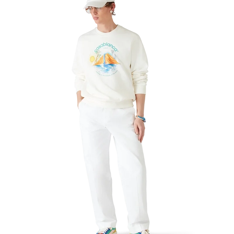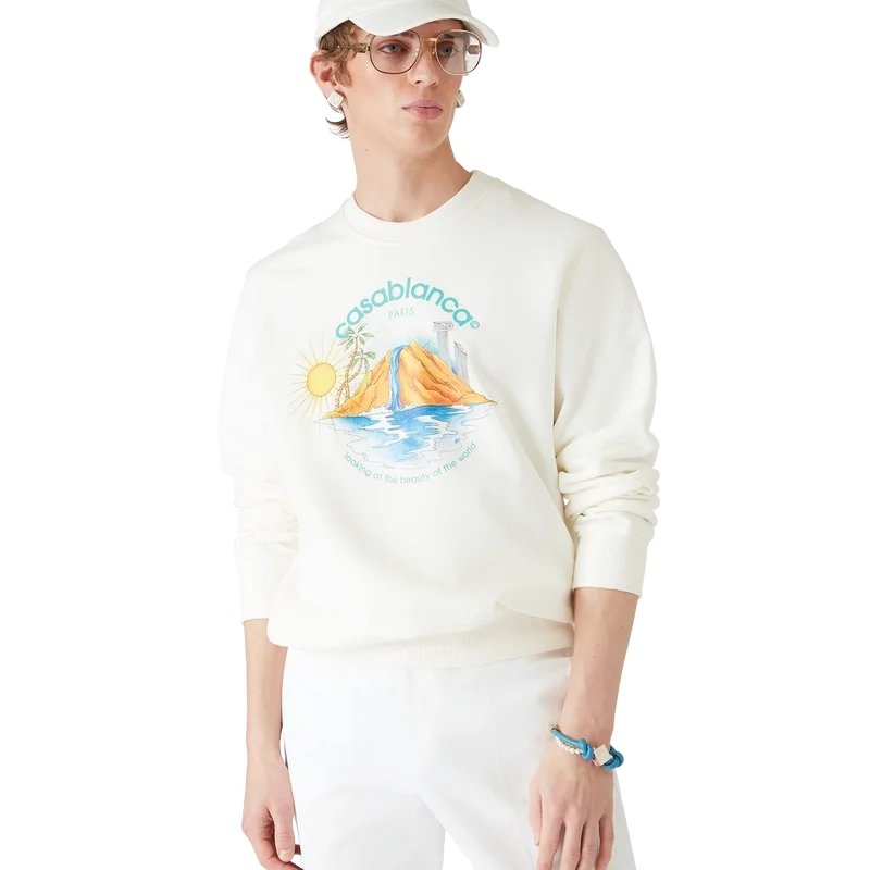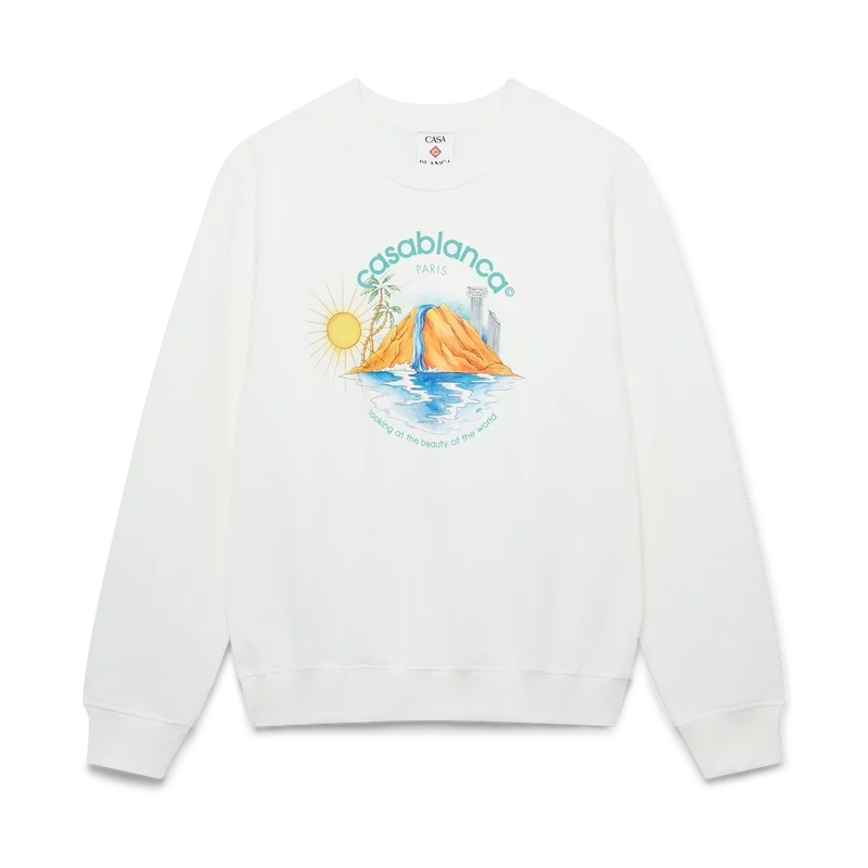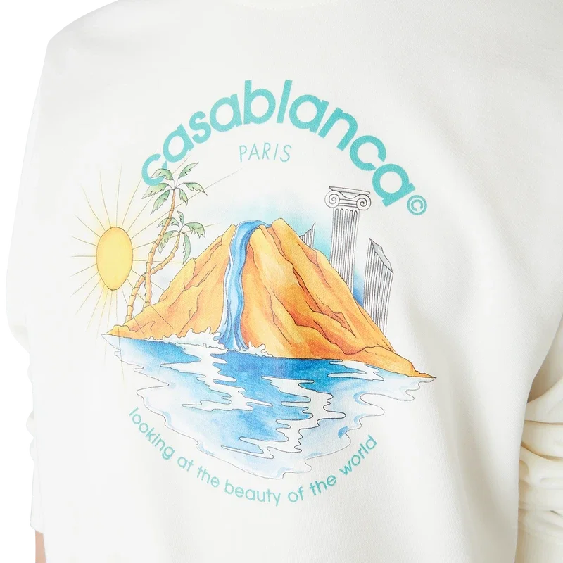 La sudadera Oasis es un diseño estampado de manga larga confeccionado en tejido de algodón orgánico, que presenta el arte de temporada de la casa con elementos de diseño de la naturaleza, la arquitectura y el tenis. Se completa con un clásico cuello redondo acanalado, puños y dobladillo acanalados.