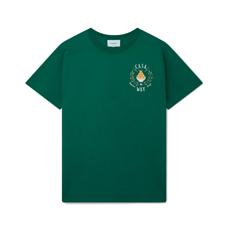 La camiseta Casa Way presenta un estampado con el clásico diseño iconográfico de la casa, que incluye la pirámide naranja, raquetas de tenis y un diseño floral repetido en un estampado más grande en la espalda. Confeccionada en algodón 100 % orgánico y rematada con un cuello redondo clásico y una etiqueta con la marca Casablanca.