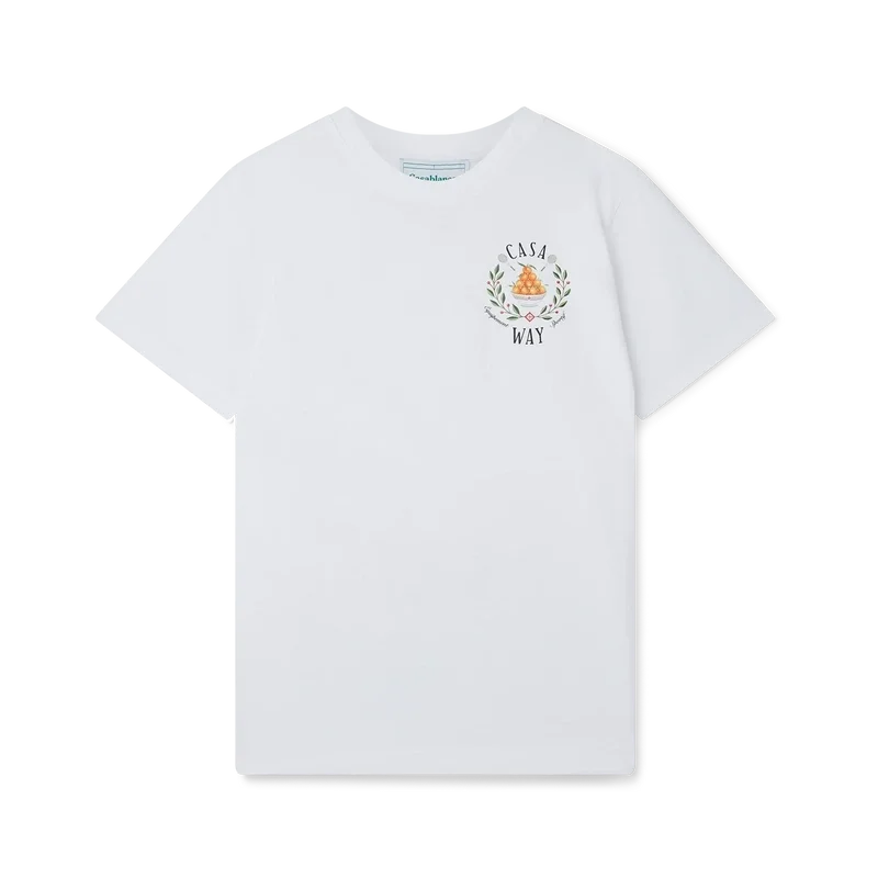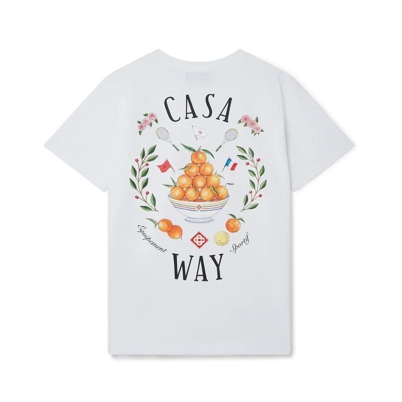 La camiseta Casa Way presenta un estampado con el clásico diseño iconográfico de la casa, que incluye la pirámide naranja, raquetas de tenis y un diseño floral repetido en un estampado más grande en la espalda. Confeccionada en 100 % algodón orgánico y con cuello redondo clásico y etiqueta con la marca Casablanca.