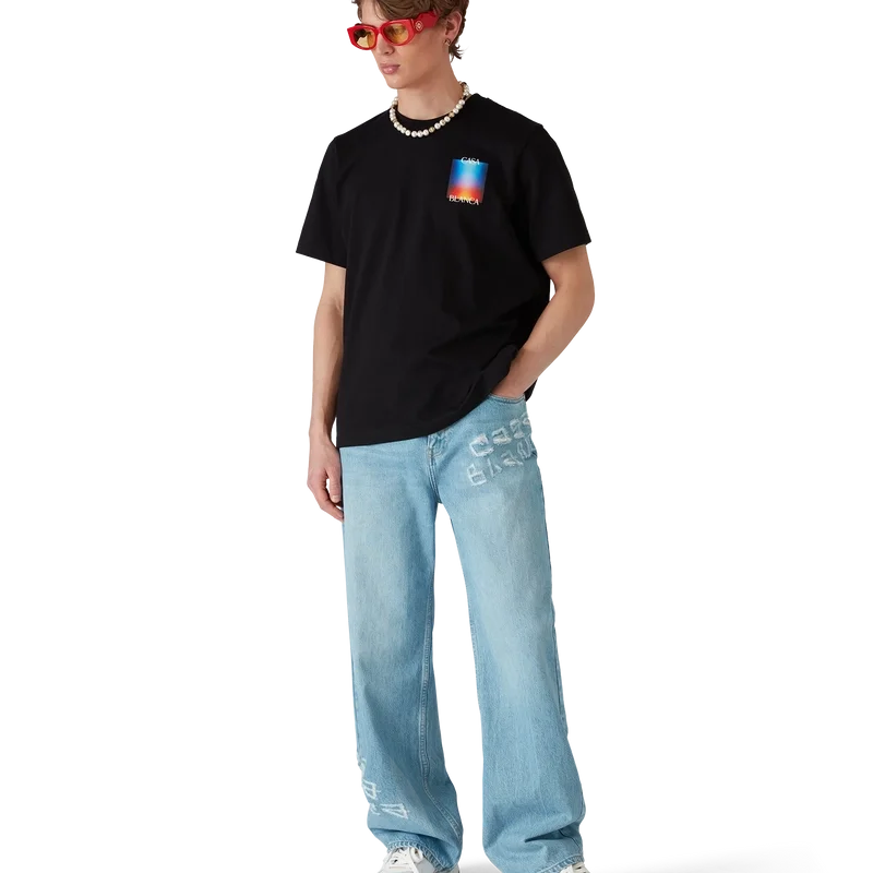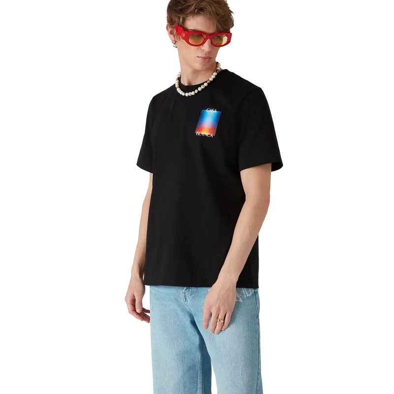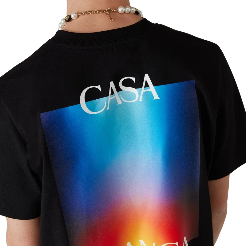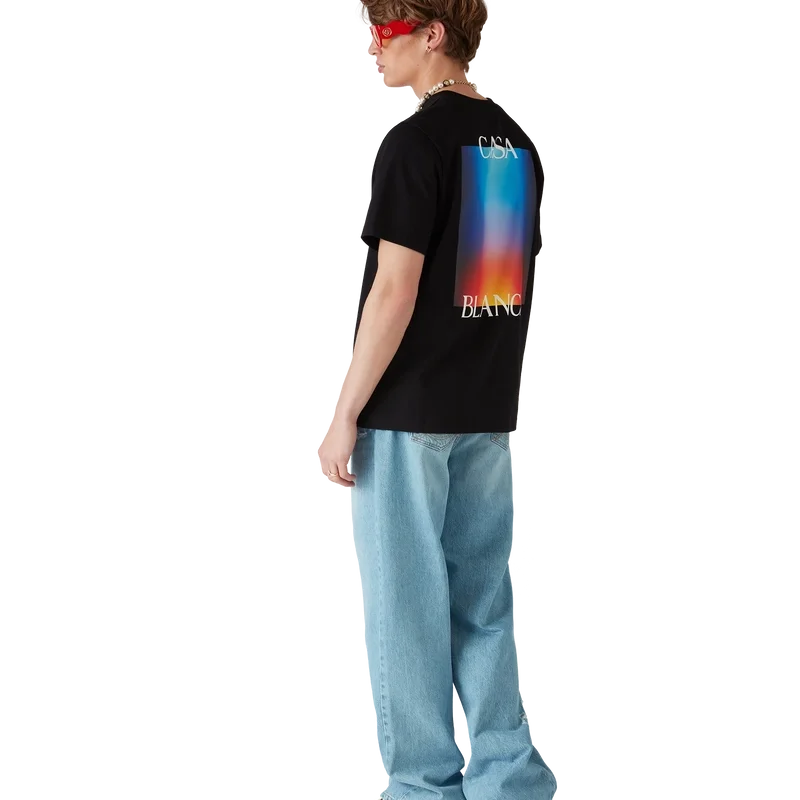 La camiseta con el logotipo degradado de Casa es un diseño estampado de manga corta confeccionado en tejido de algodón orgánico que presenta el degradado de temporada de la casa, inspirado en una interpretación futurista del degradado de Casablanca: una forma de halo inspirada en carteles y discos vintage de ciencia ficción. Se completa con un cuello redondo clásico.